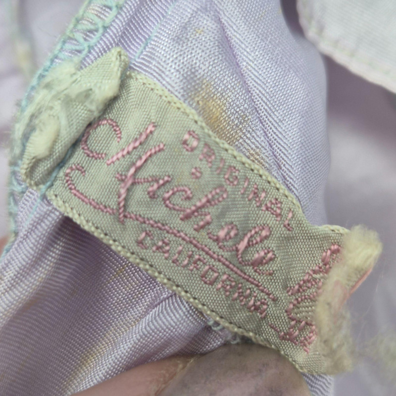 Also featured is a 19" girl doll with bright red hair wearing a lilac satin dress and marked with a Michele California tag, adding a touch of collectible interest.