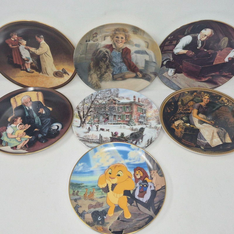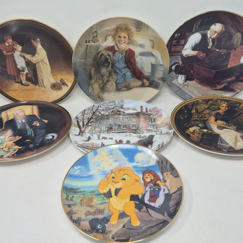 A varied and charming assortment of numbered, limited‑edition collector plates spanning beloved themes and makers. This lot includes several Knowles Norman Rockwell plates, each capturing his classic Americana storytelling. Also featured is a Disney “Lion King – Circle of Life” plate, a vibrant favorite for animation collectors. A wonderful mix for plate collectors, decorators, or anyone who enjoys nostalgic holiday and storybook imagery. No boxes included.
