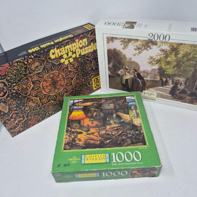 A fun assortment of 1000 to 2000‑piece jigsaw puzzles, perfect for puzzle lovers and crafters alike. Boxes have been opened and piece counts are unverified, but each offers a satisfying challenge and great artwork.