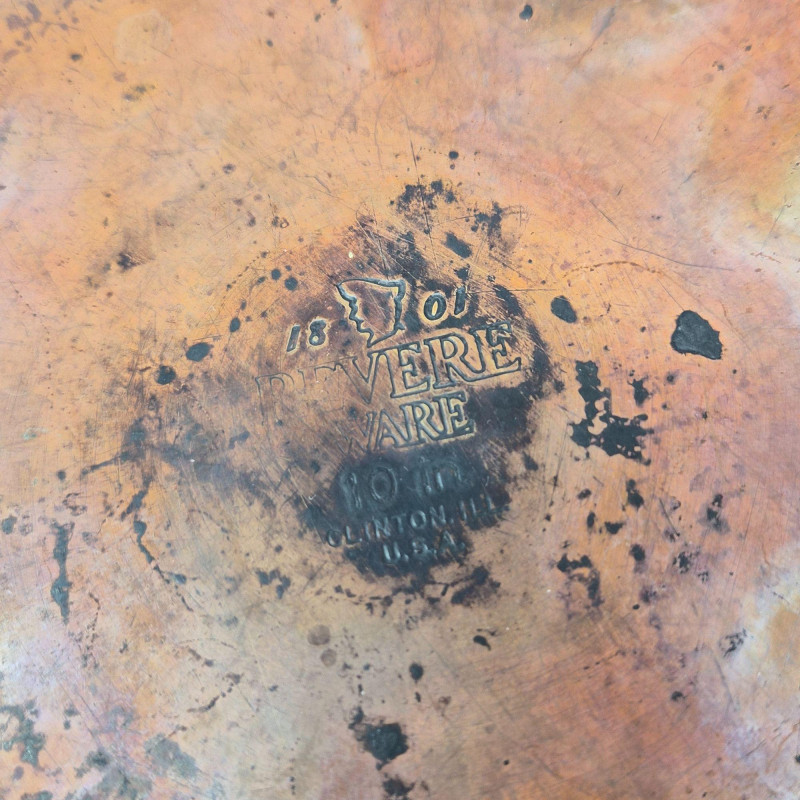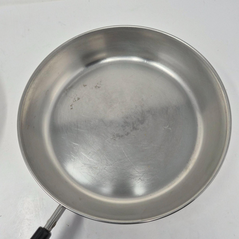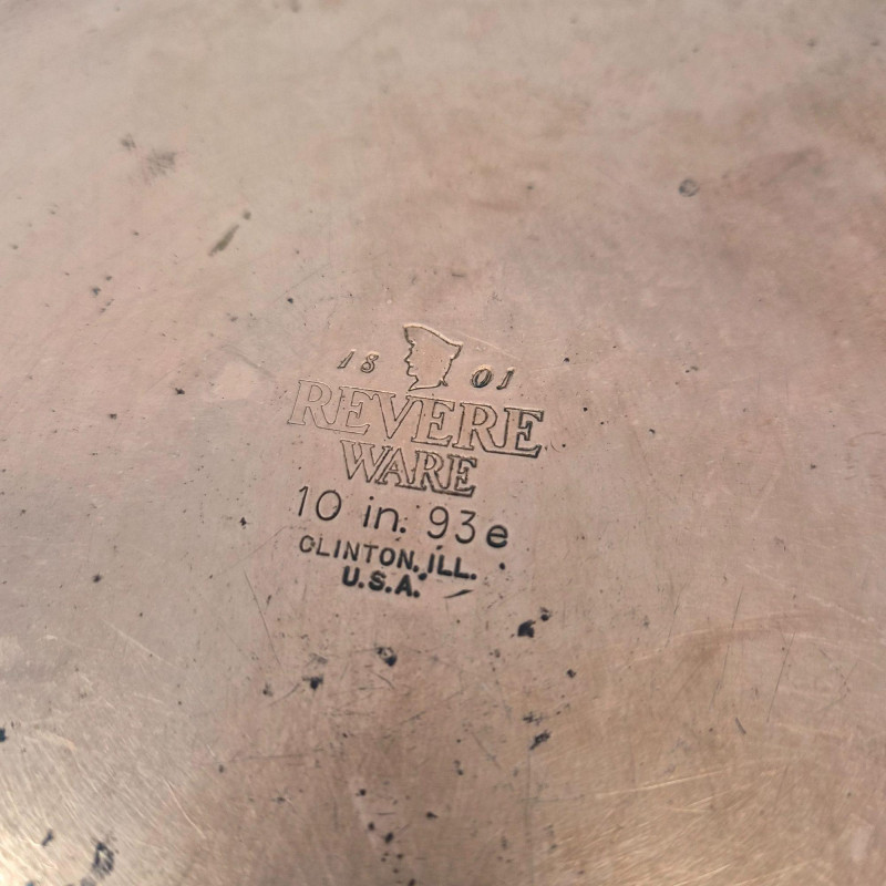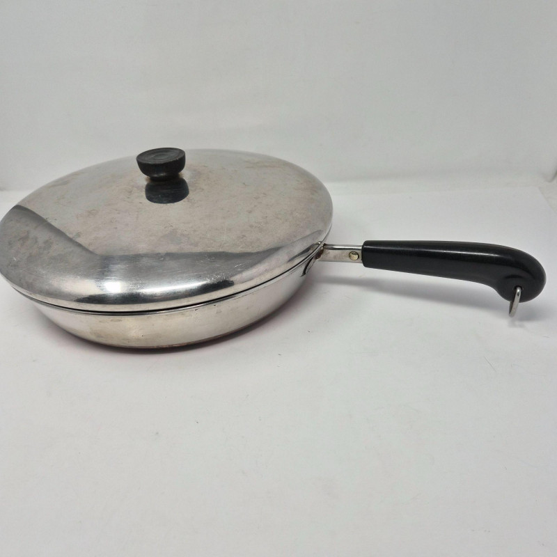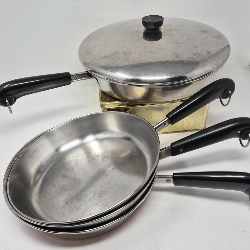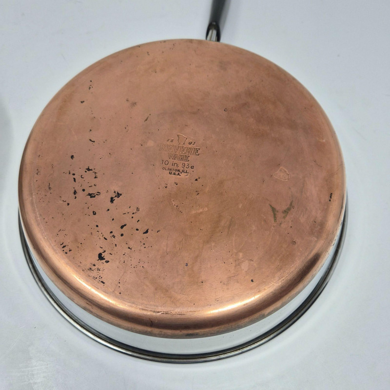 A classic, durable set of vintage Revere Ware USA cookware, all featuring the iconic copper bottoms for even heating and timeless kitchen appeal. This lot includes a 12" large lidded fryer and three 10" frying pans, offering a versatile range for everyday cooking.
