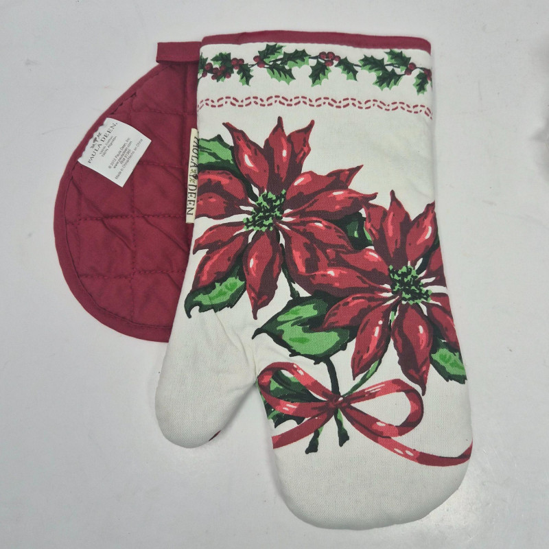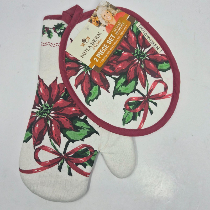 Paired with it is a new Paula Deen 2‑piece holiday pot holder set, featuring cheerful poinsettia designs that add a warm, traditional touch to any kitchen.