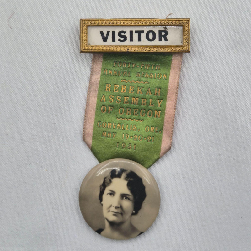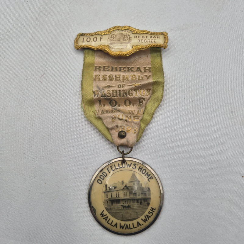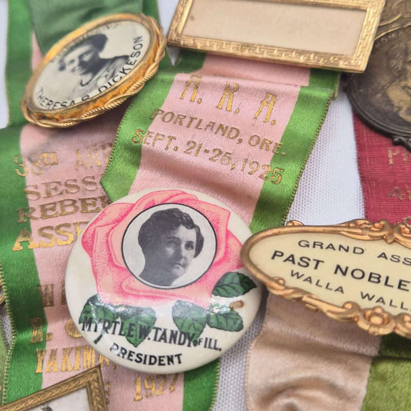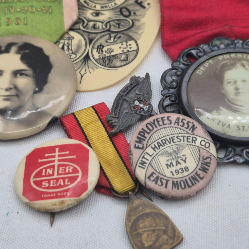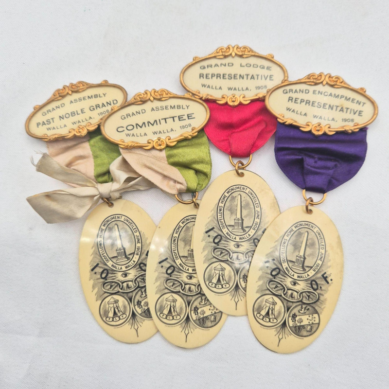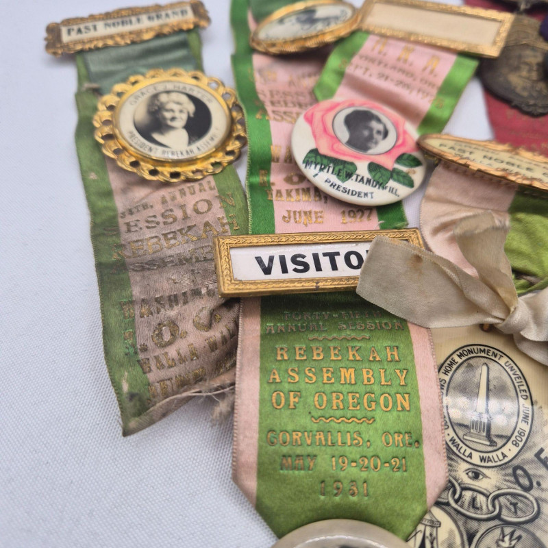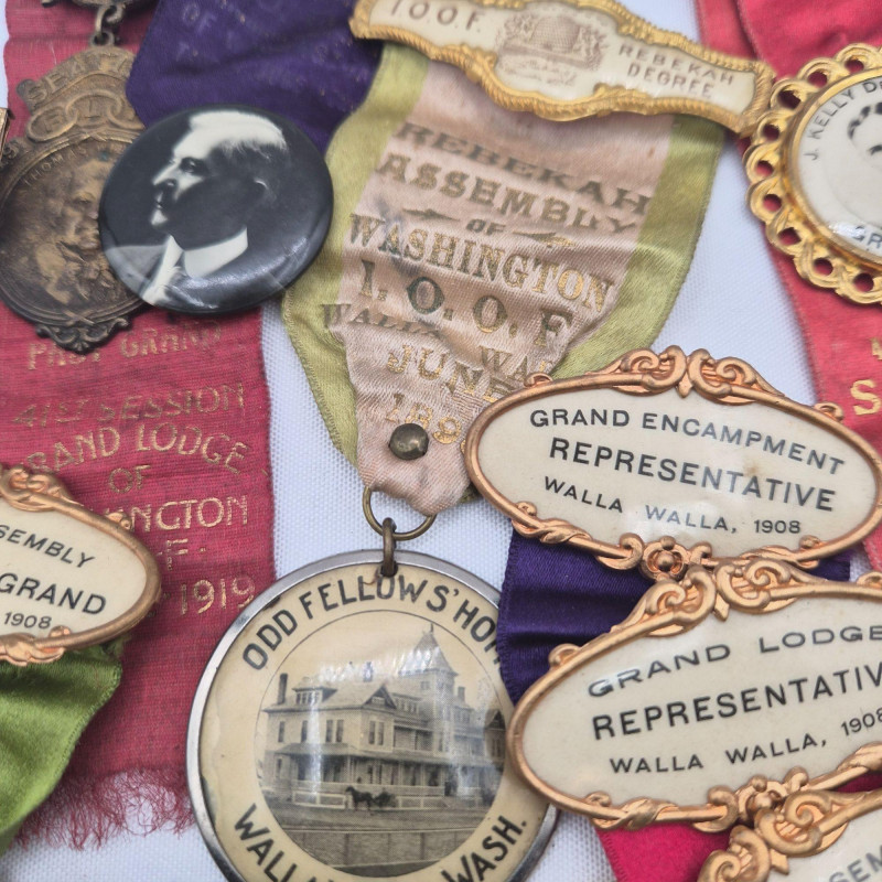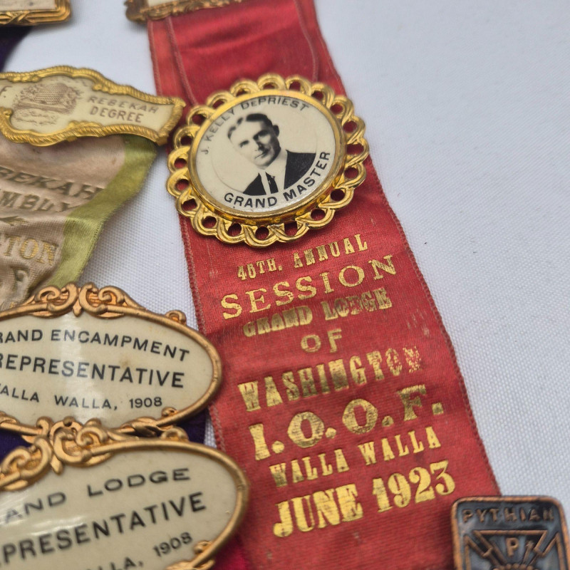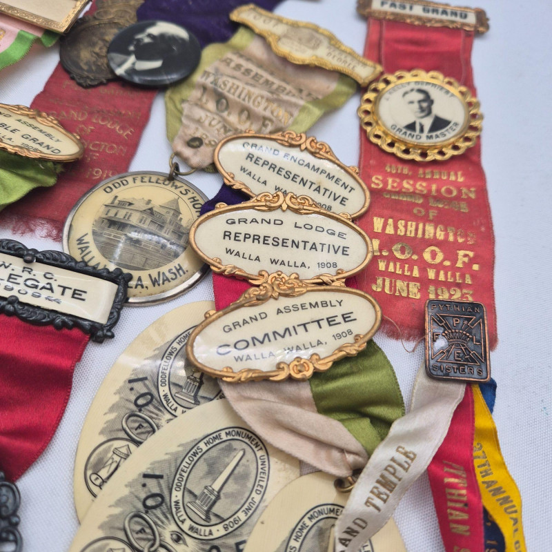 A historically rich assortment of antique badges, ribbon pins, and medallions spanning the early to mid‑1900s, with strong representation from Oregon and Washington fraternal and political circles. This collection includes Independent Order of Odd Fellows (I.O.O.F.) ribbons, assembly and lodge identifiers, and commemorative pins for presidents, delegates, and representatives. Many feature portraits, ornate frames, and printed event details such as Walla Walla conventions and Rebekah Assemblies, reflecting the ceremonial culture of early 20th‑century organizations. A vibrant mix for collectors of fraternal memorabilia, political history, or regional heritage ephemera.