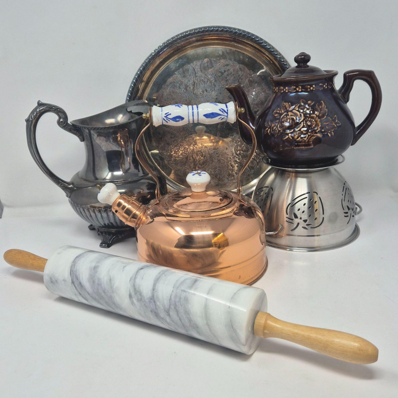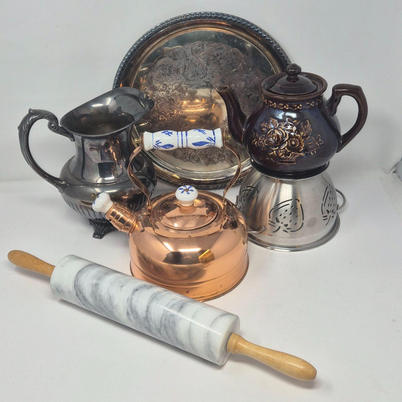 Also included are a silverplate beverage pourer, a silverplate tray, a strawberry strainer, and a marble rolling pin, offering a blend of decorative appeal and practical vintage utility.