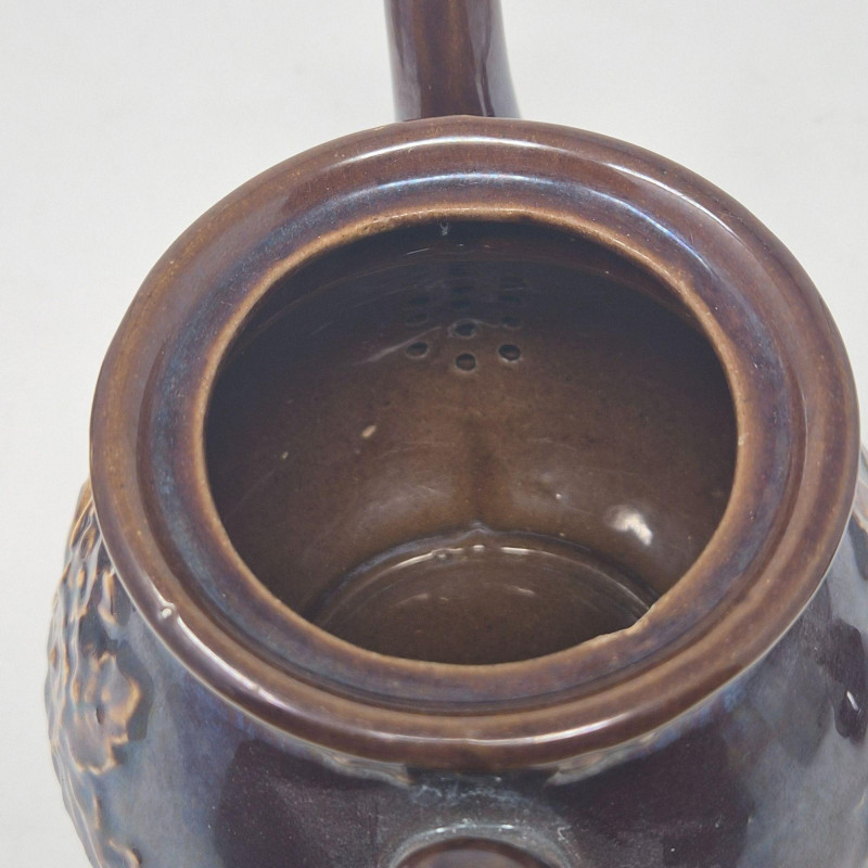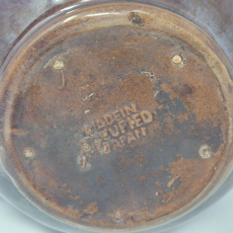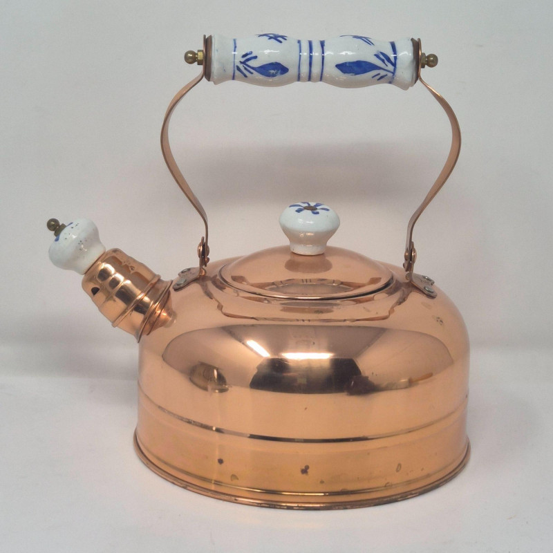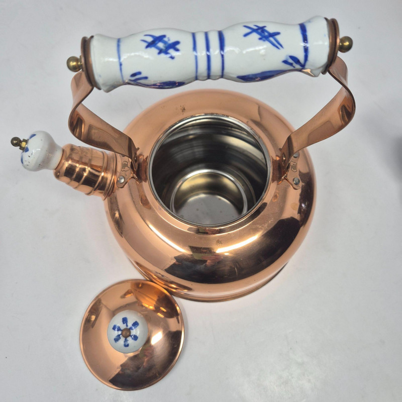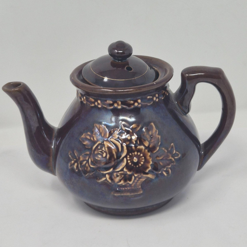 A charming mix of vintage kitchen décor and functional accents. This lot includes a classic copper tea pot and an Occupied Japan iridescent brown‑glazed pottery teapot featuring a textured floral motif—a lovely collectible pair with contrasting styles.