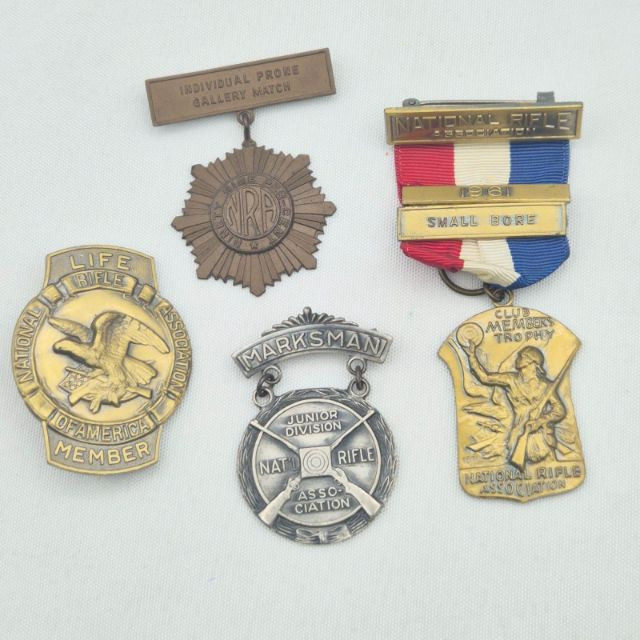 A compelling assortment of five vintage National Rifle Association medals and badges, each representing a distinct achievement or membership tier in American marksmanship history. The grouping spans multiple decades of NRA tradition, showcasing varied designs, ribbons, and insignia styles tied to competition and club recognition. Includes: A rich and display‑worthy grouping ideal for collectors of shooting sports memorabilia, military and marksmanship history, or vintage American organizational badges.