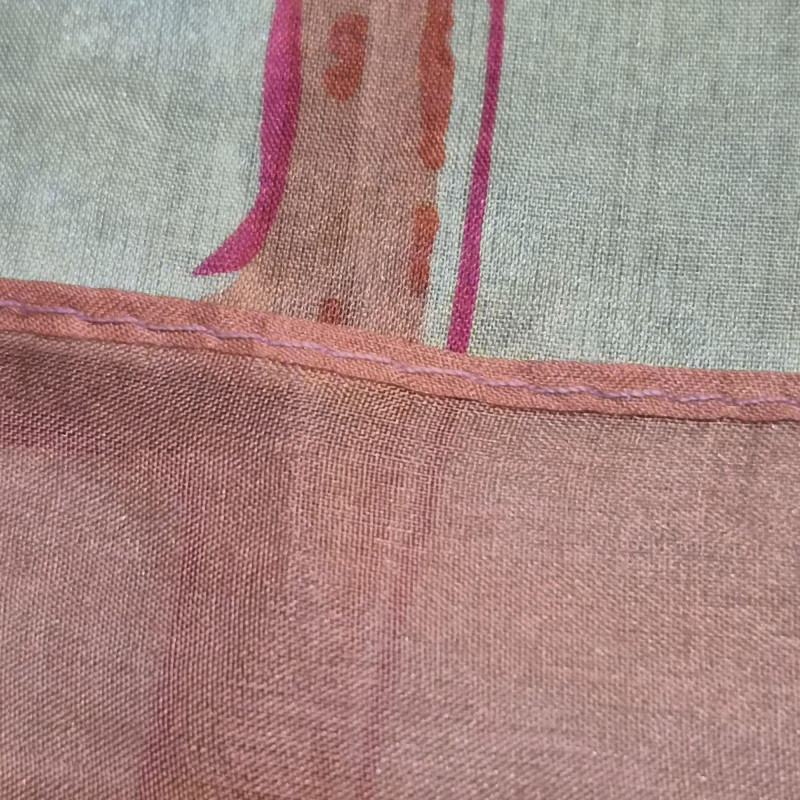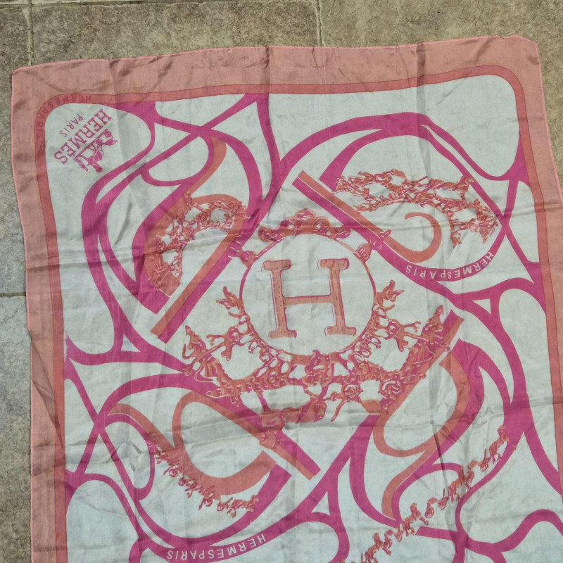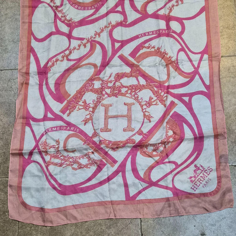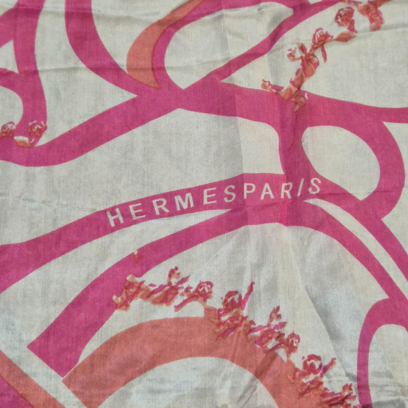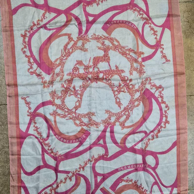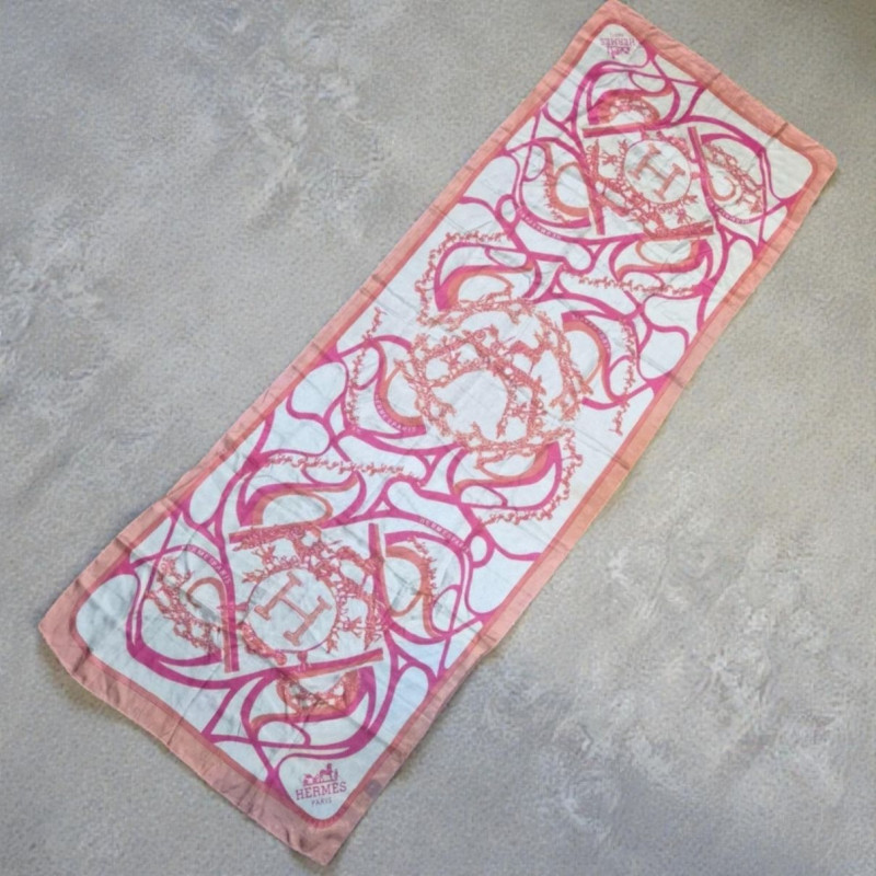 Hermès “Pink Ribbons & Horse Motif” Sheer Silk Scarf, 68" x 25". A beautifully airy vintage Hermès Paris sheer 100% silk scarf showcasing a flowing horse‑and‑ribbon motif in pink hues against a soft white background. The long rectangular silhouette (68" x 25") drapes effortlessly, highlighting the signature balance of movement, artistry, and refinement. Lightweight and feminine, this piece brings a whisper of color and classic equestrian charm to any ensemble. Pre-owned and in lovely condition.