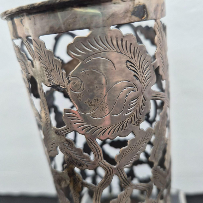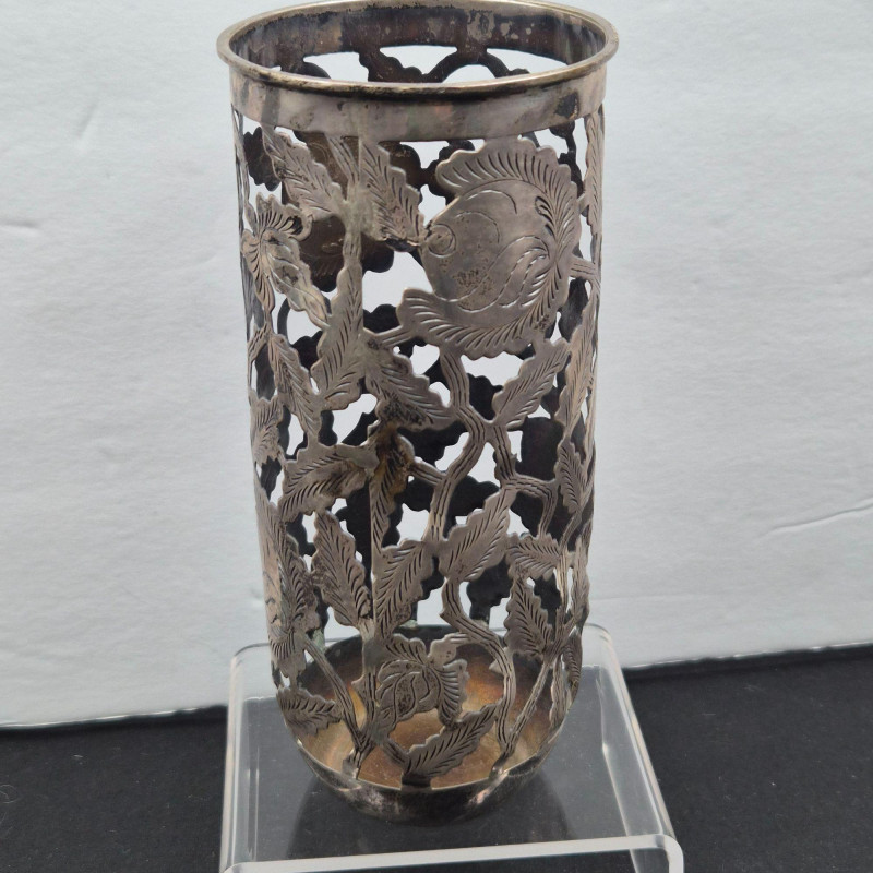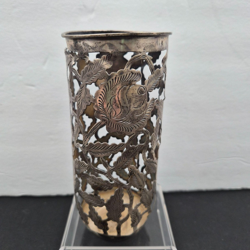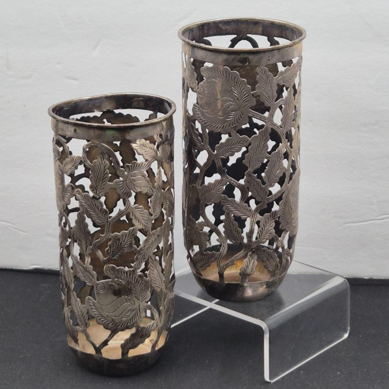 A handsome pair of Mexican sterling silver sleeves by Farfán, offered without glasses. Each sleeve is bottom‑stamped Farfan and feature traditional shaping with subtle decorative etched character. Measuring approximately 6" tall x 2.75" wide, they present well with minor denting and patina consistent with age. Together they weigh roughly 150 grams. A solid addition for collectors of Mexican silver or anyone seeking refined, functional table accents with artisan pedigree.