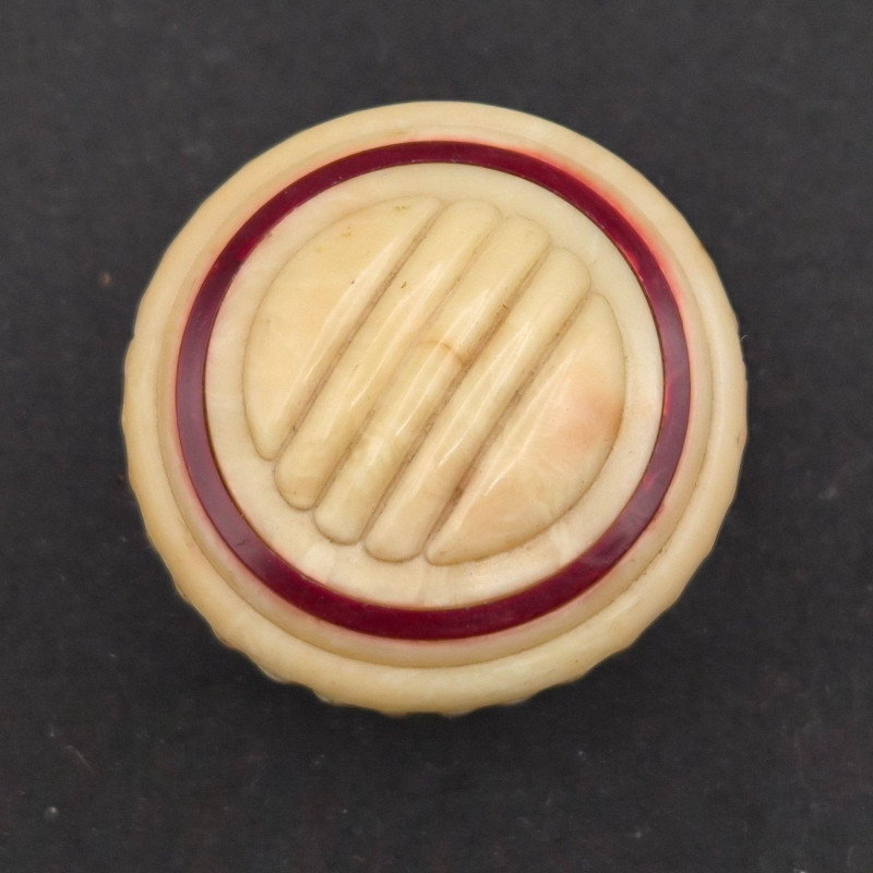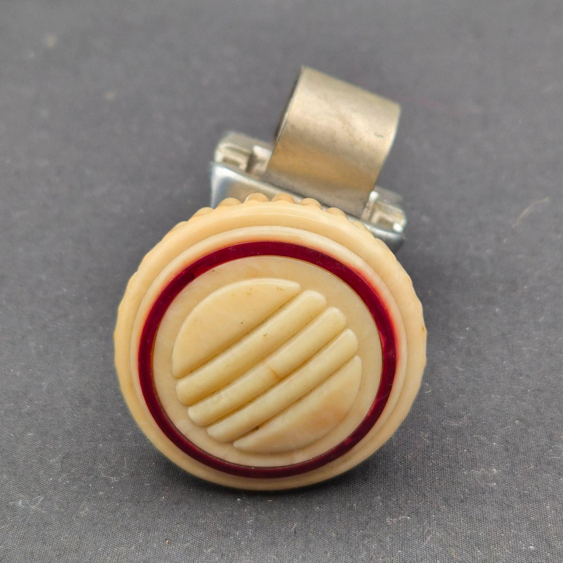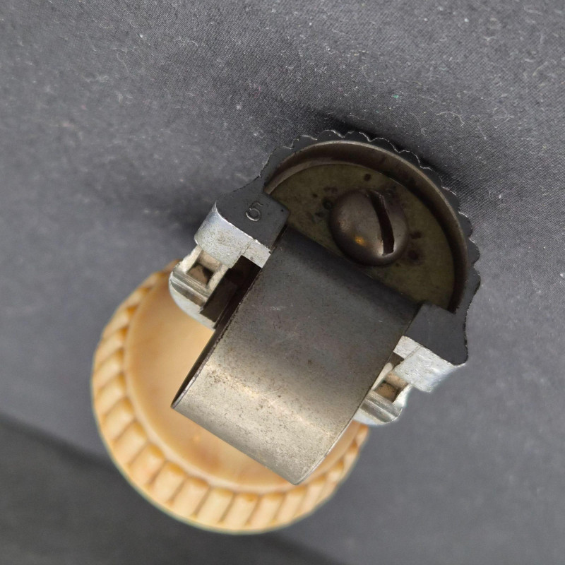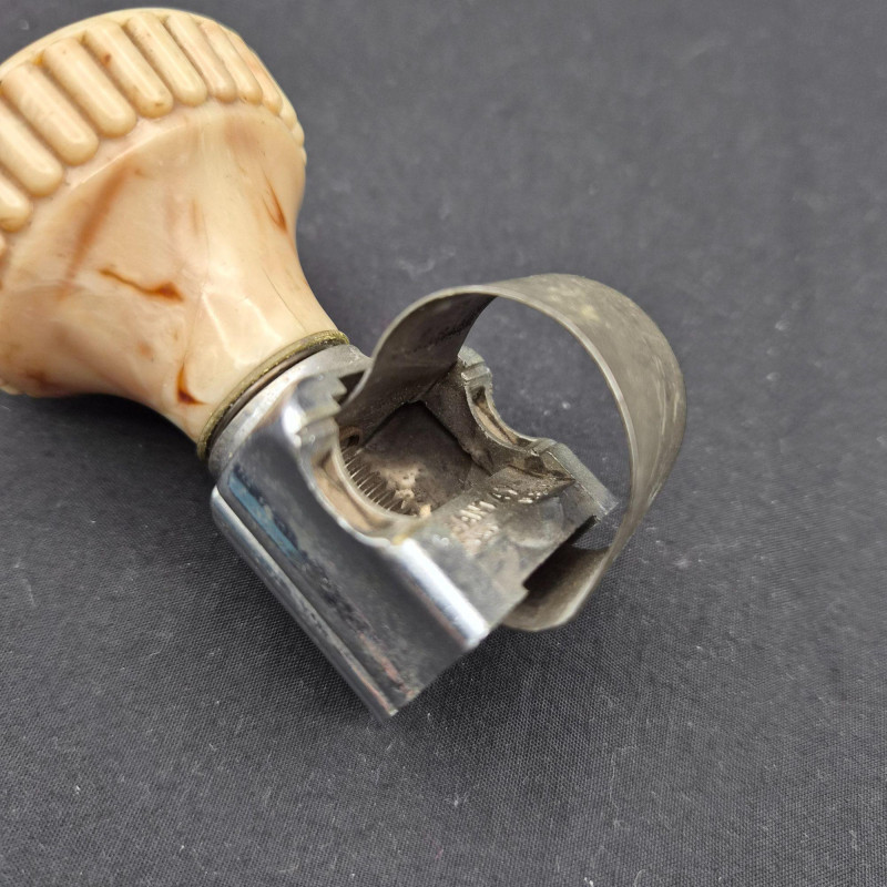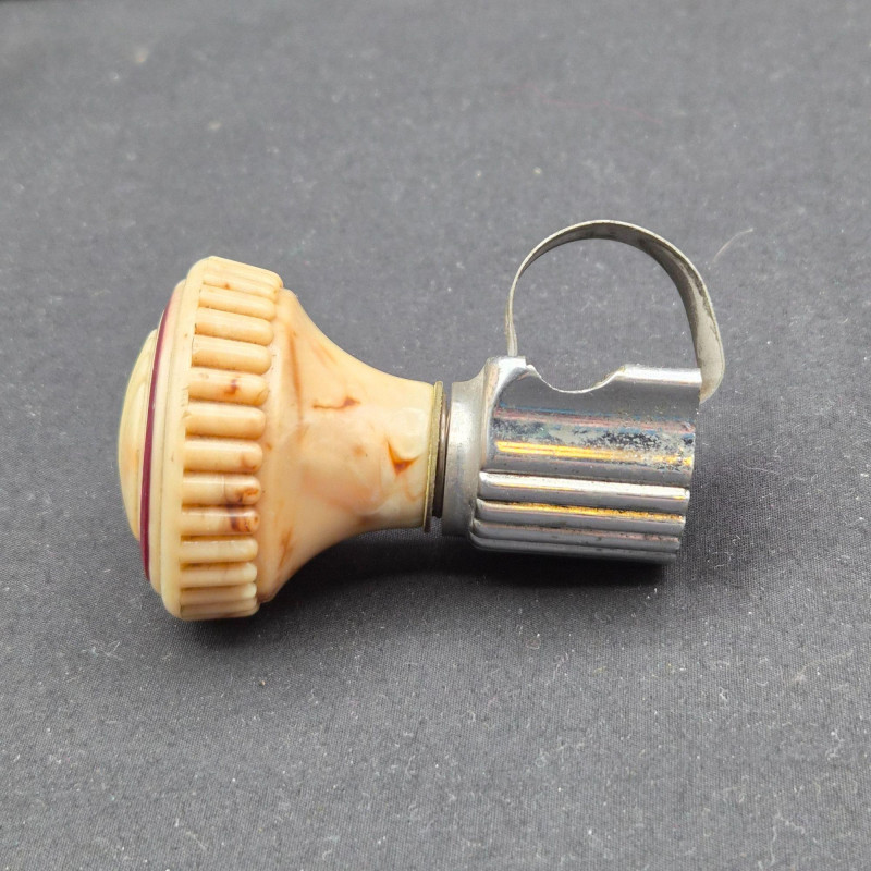 A classic 1950s Bakelite steering wheel spinner knob, known by period nicknames such as “Brodie knob,” “necker knob,” or “suicide knob.” This vintage example features marbled beige Bakelite with a maroon stripe and a ribbed grip, paired with its original metal clamp for mounting. Designed to allow the driver to turn the wheel quickly with one hand, these knobs were especially useful in vehicles before power steering became standard. Popular throughout the 1940s and 1950s, they became iconic aftermarket accessories—favored by hot‑rodders, truck drivers, and sometimes even given out as dealership promotional items. A nostalgic piece of mid‑century automotive culture and a standout collectible for fans of vintage tools, hot rod history, or Bakelite design.