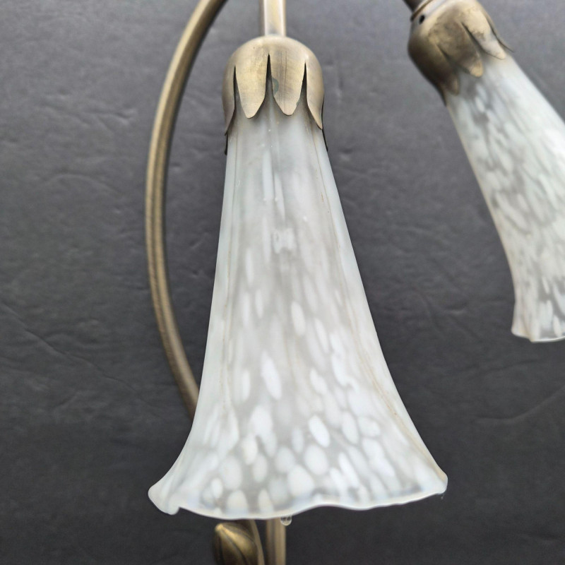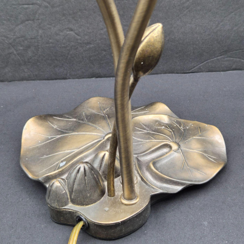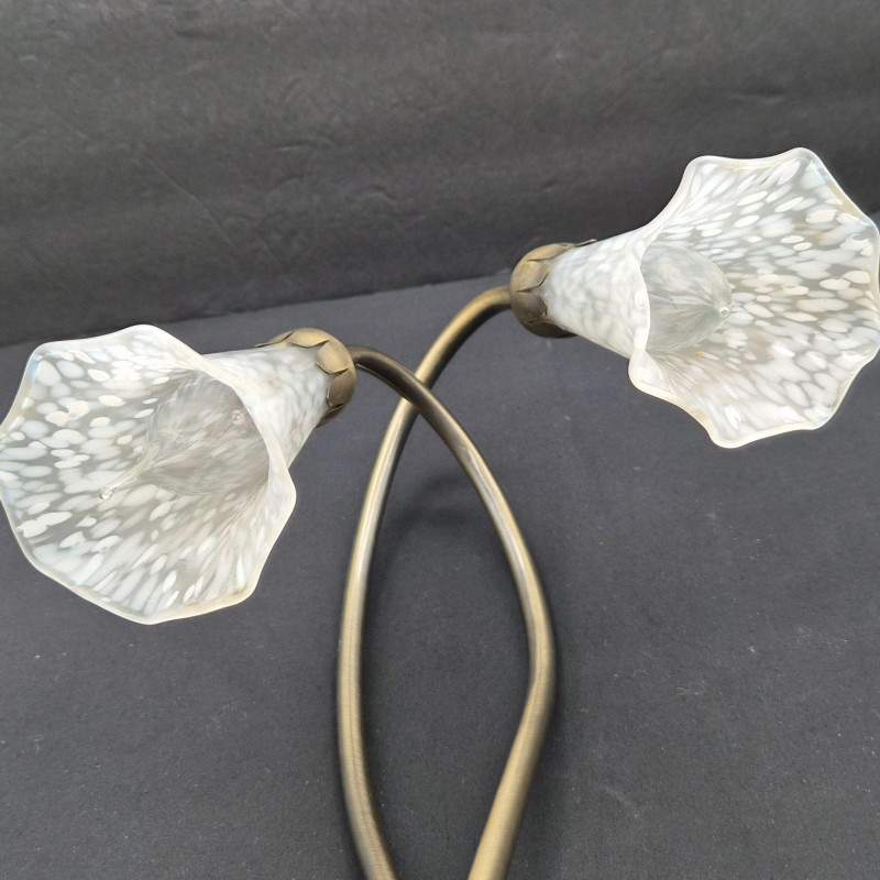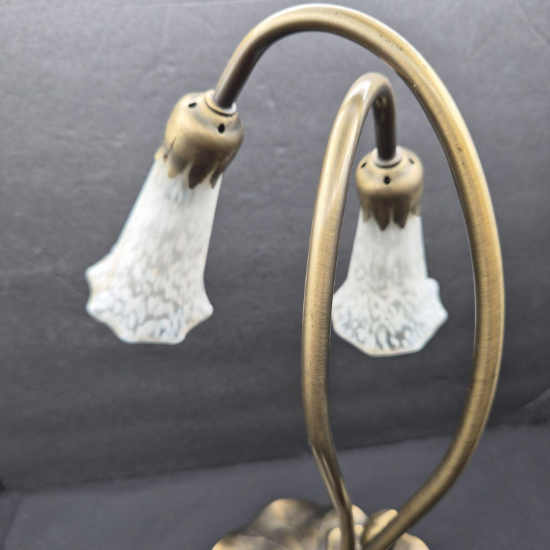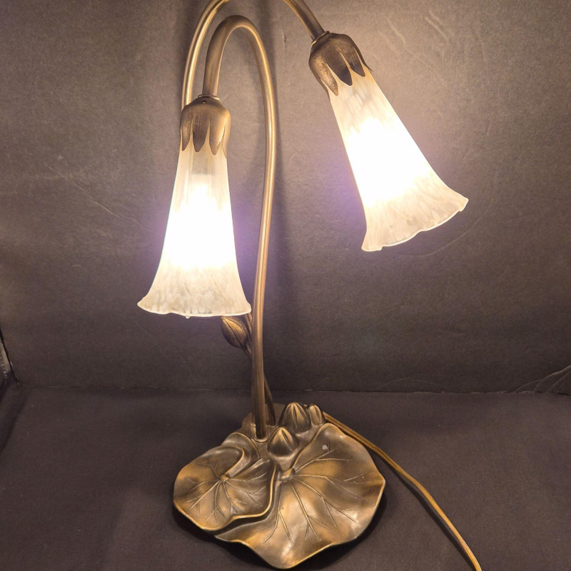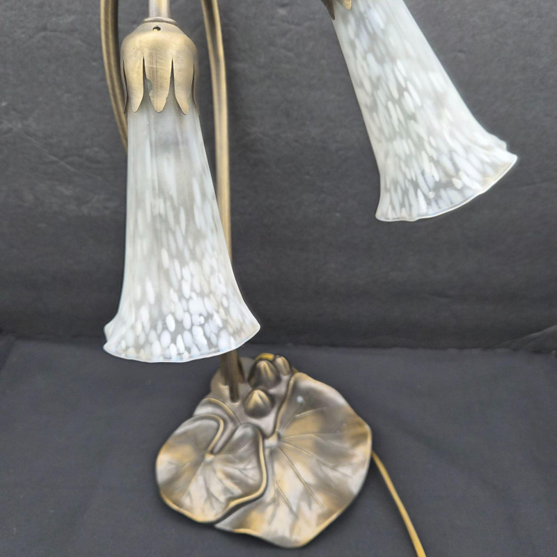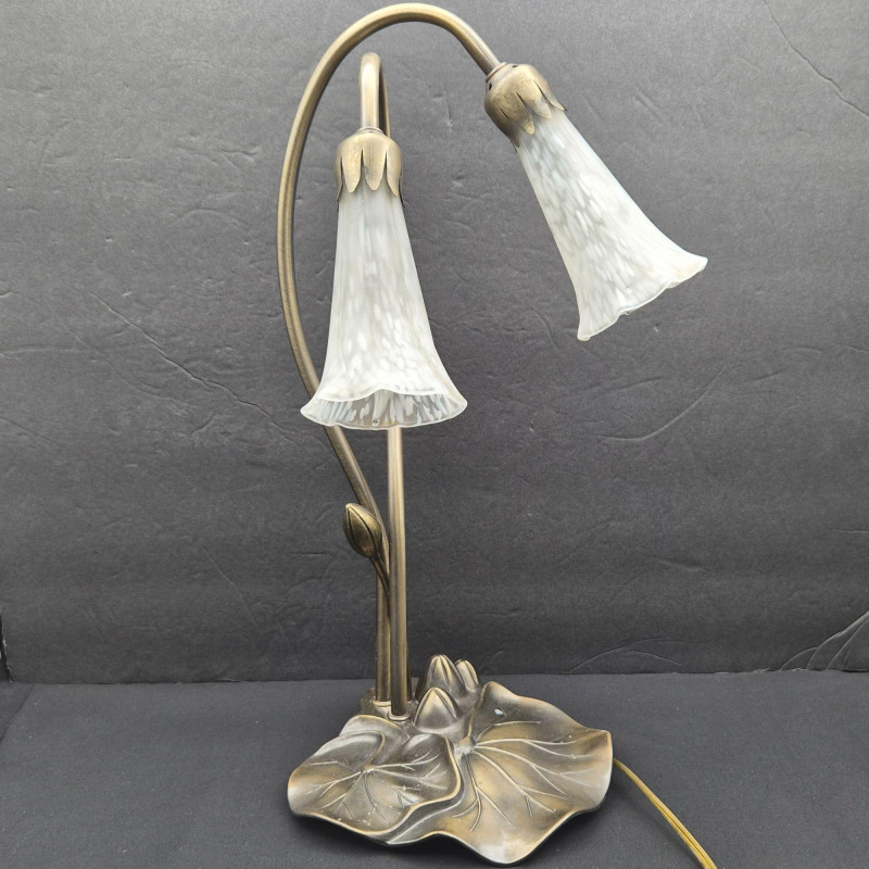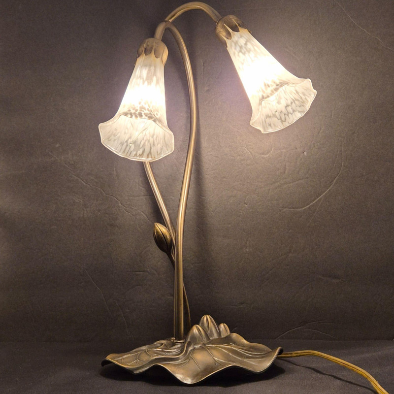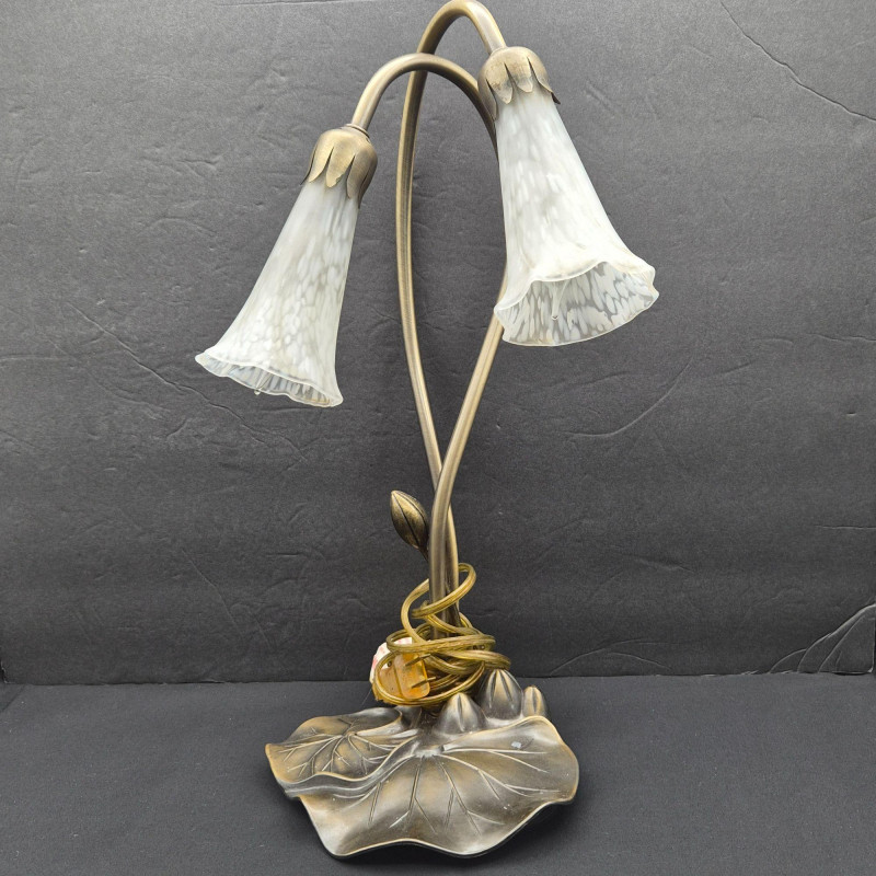 A charming vintage electric table/desk lamp in the classic Tiffany‑style lily motif, featuring two fixed metal arms rising from a sculpted lily pad base. Each arm holds a white frosted stretch‑dot glass lily shade, creating a soft, atmospheric glow when lit. The stems are fixed (not bendable), preserving the lamp’s original form and silhouette. A lovely accent for Art Nouveau–inspired décor, bedside lighting, or collectors of lily‑style lamps. Fully working and ready for display.