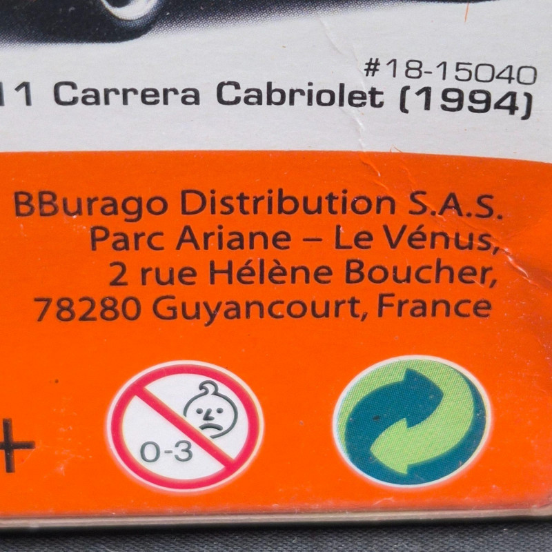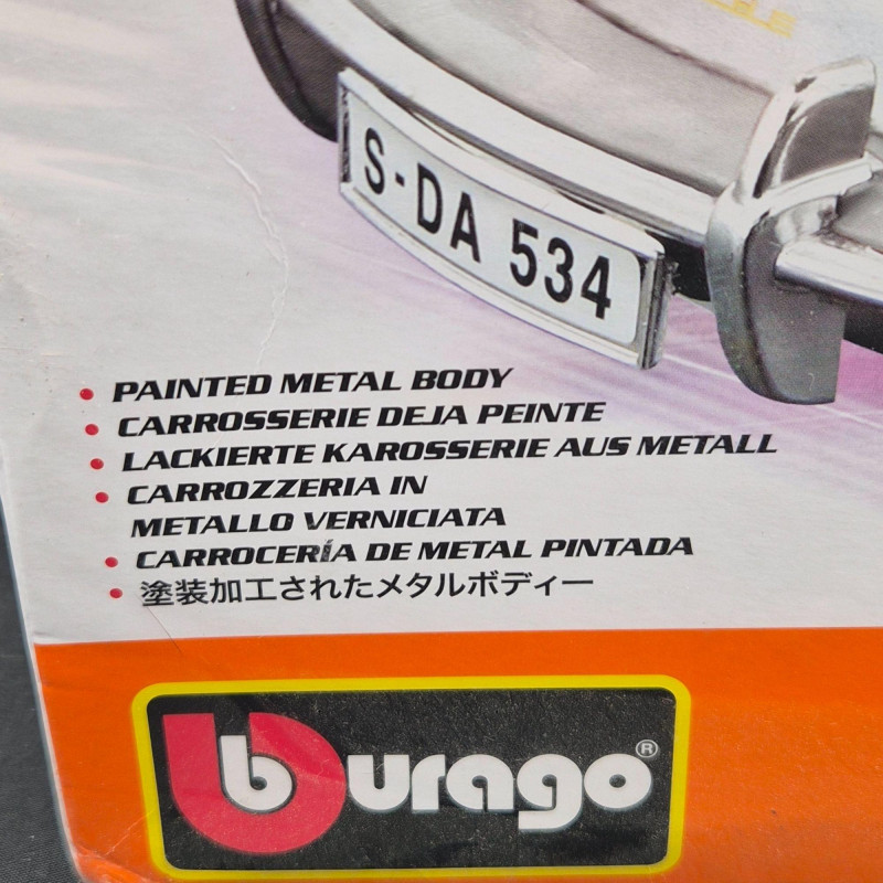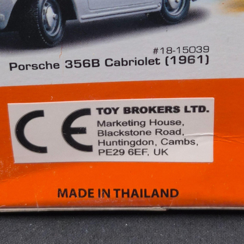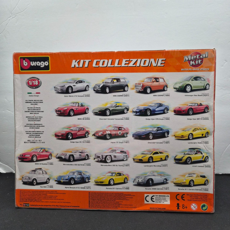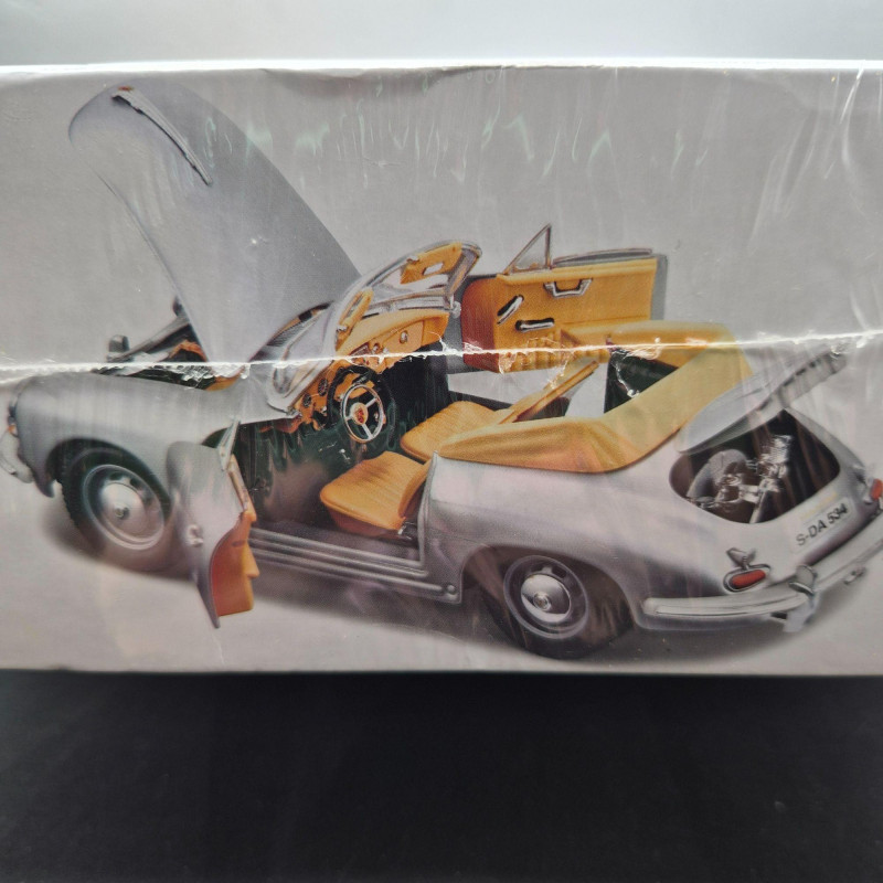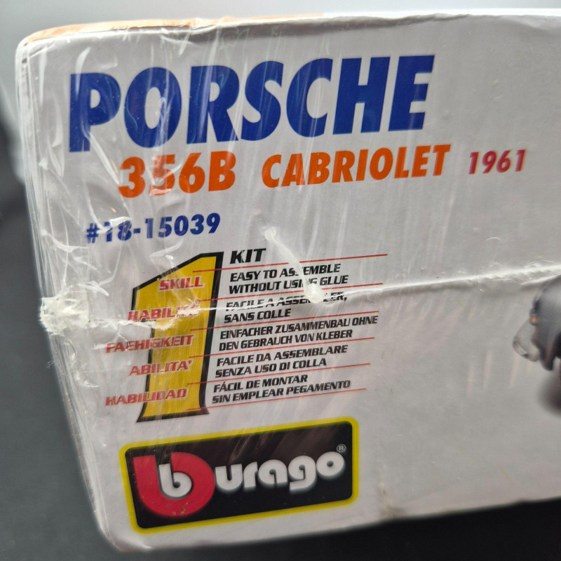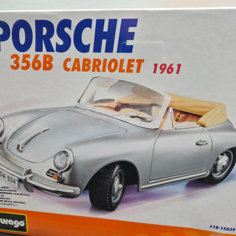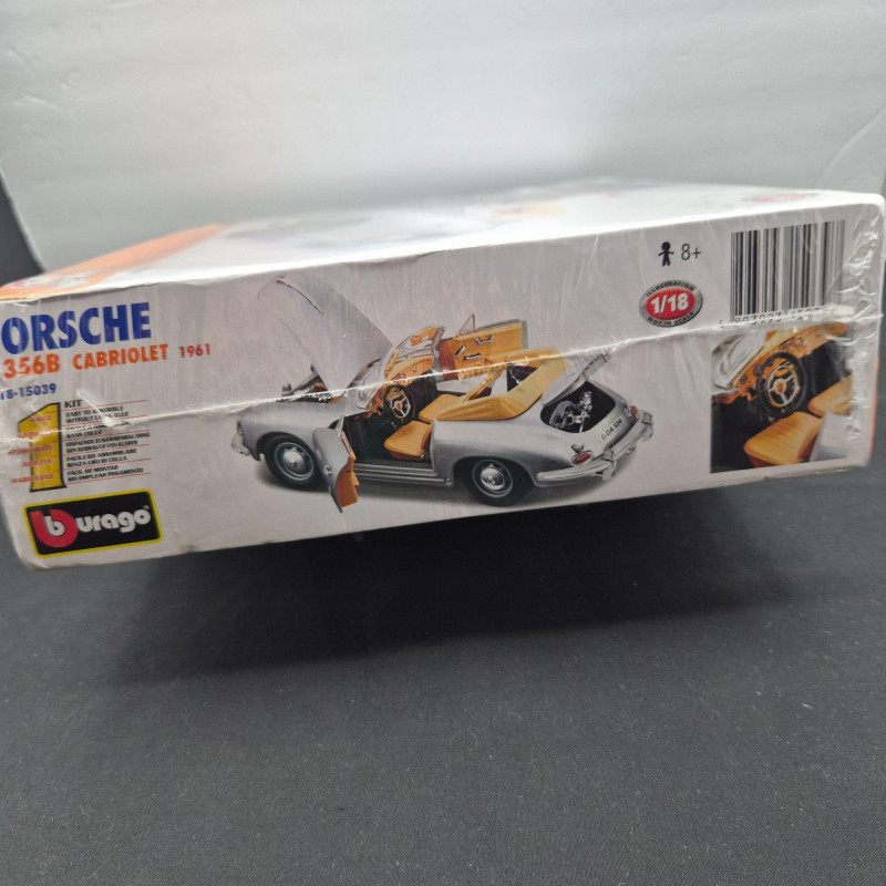 A sealed vintage Bburago metal model kit of the iconic 1961 Porsche 356B Cabriolet, presented in 1:18 scale. This kit features a painted metal body with fine detailing, including a silver convertible exterior, tan soft top, and illustrated packaging that reflects the car’s timeless design. The box is marked #18‑15039 and includes multilingual labeling, emphasizing its Italian design pedigree. A standout piece for collectors of die‑cast models, Porsche enthusiasts, or anyone drawn to mid‑century automotive elegance. The kit remains factory sealed, ideal for display or preservation.