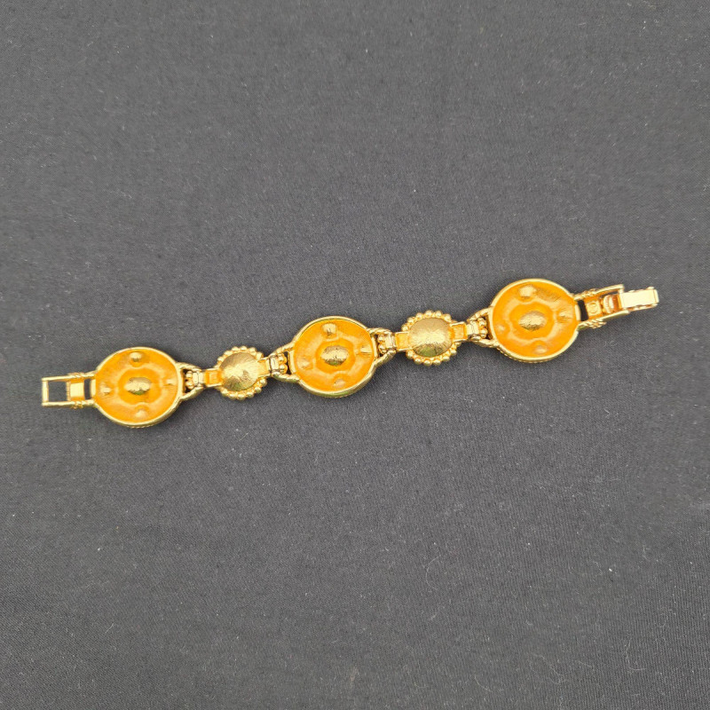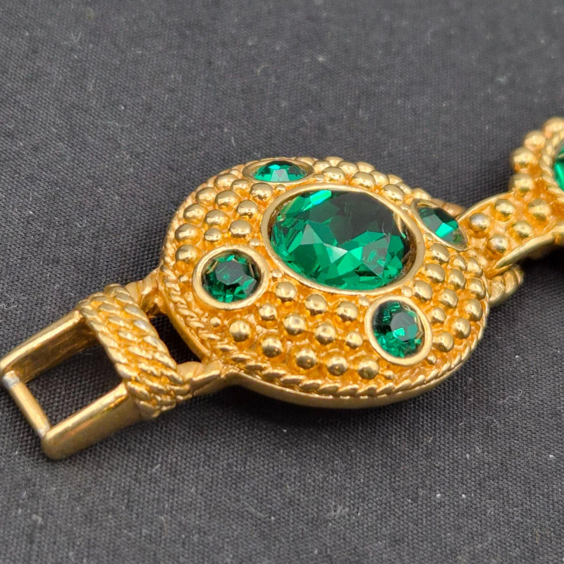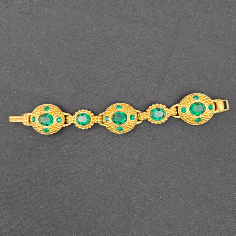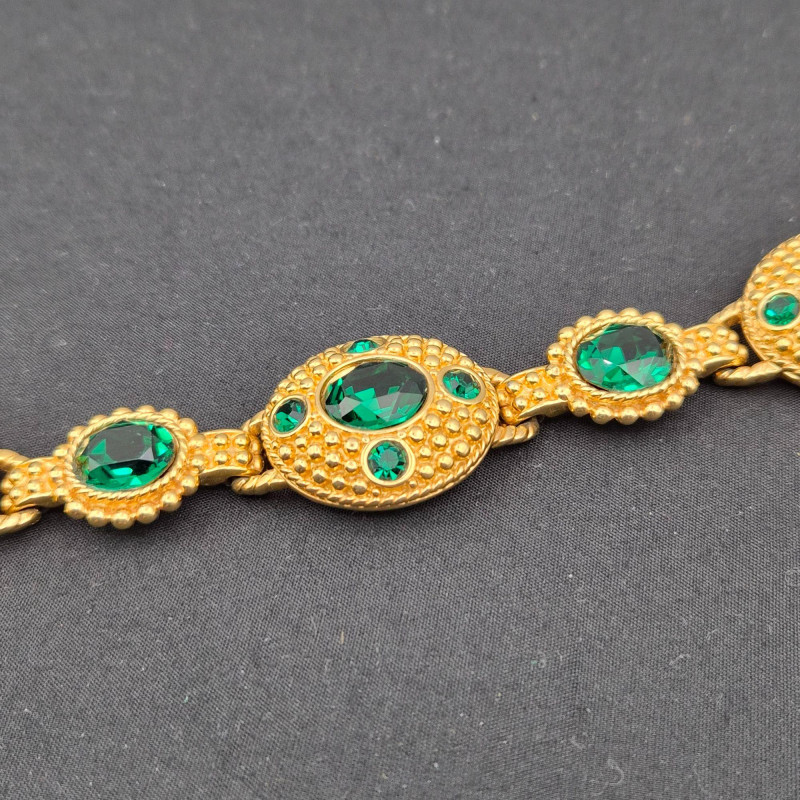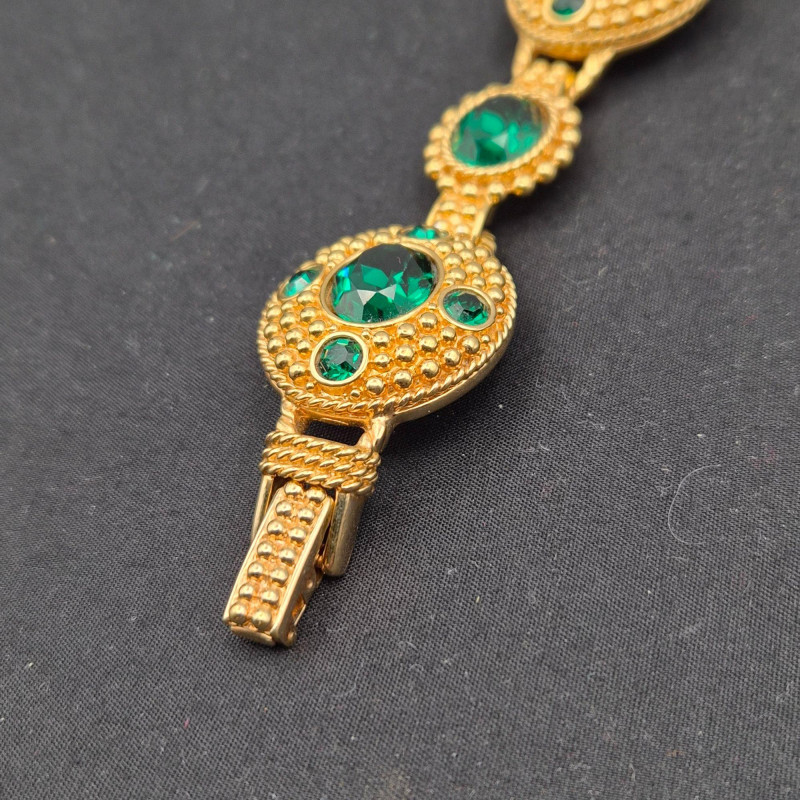 A dazzling, large statement piece: Swarovski gold tone bracelet featuring five alternating panel links set with sparkling faceted green crystals. The design showcases Swarovski’s signature attention to detail, with each crystal nestled in a richly textured gold tone setting. Measures approximately 7" in length and secures with a fold-over clasp. The piece bears the Swarovski swan mark, confirming its authenticity and quality. A vibrant, eye-catching bracelet perfect for collectors, gift-givers, or anyone drawn to bold, elegant sparkle.