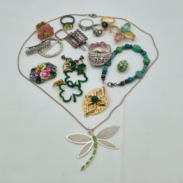 A cheerful, personality‑packed assortment of vintage to modern fashion jewelry: rings, brooches, earrings, a necklace, scarf slide, and hair clips—all bursting with color, whimsy, and springtime charm. This mix brings together floral motifs, bright stones, playful shapes, and eye‑catching details, perfect for anyone who loves expressive, feel‑good accessories. Expect a joyful blend of: A delightful, mood‑lifting collection ideal for spring styling, crafting, gifting, or curating a playful jewelry display.