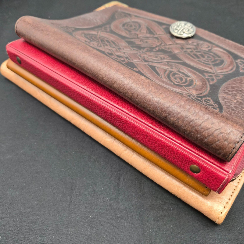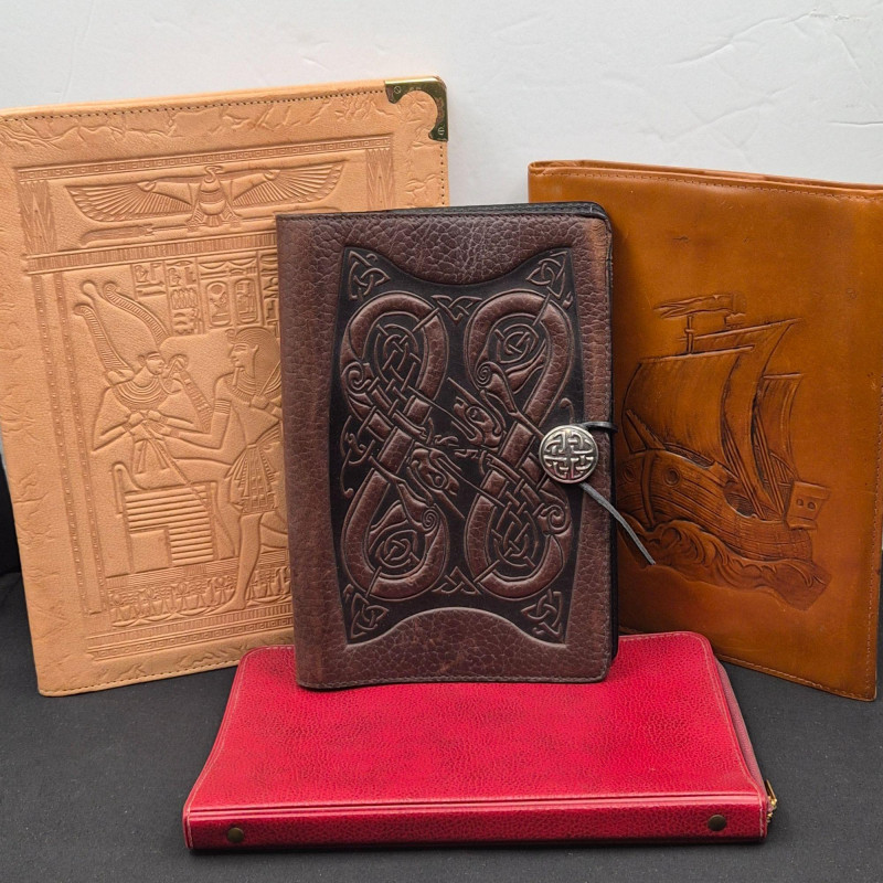 A grouping of four leather cover sleeves, each with its own distinctive style and embossing. Light age wear consistent with use. A versatile set for books, Bibles, journals, or decorative display.