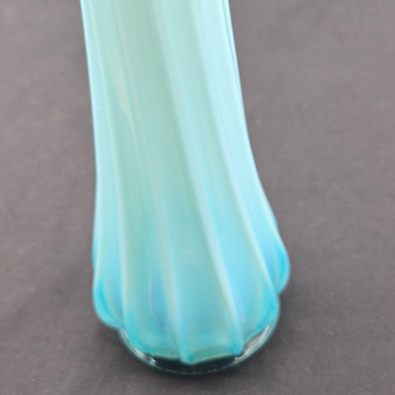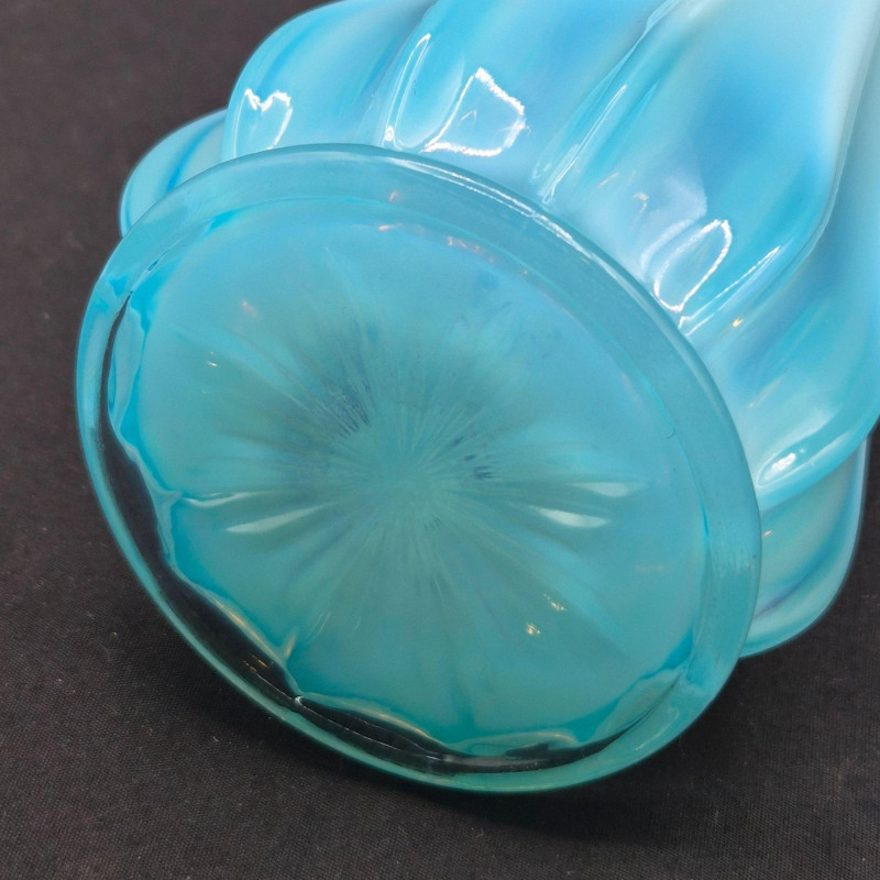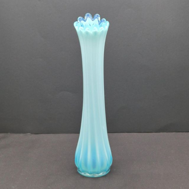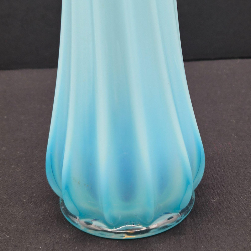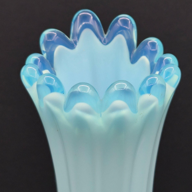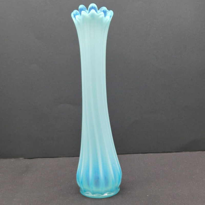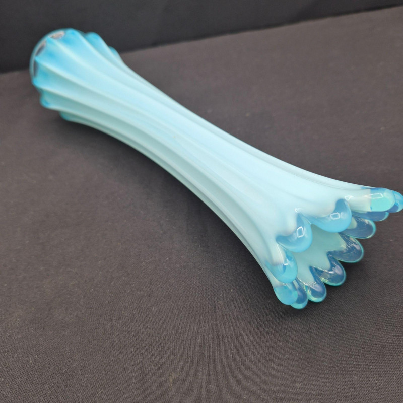 A stunning example of mid-century American art glass, this Fostoria “Heirloom” swung vase features a milky blue opalescent finish with dramatic 12-finger fluted edges and a gently scalloped rim. The color transitions from a deeper blue at the base to a translucent glow at the top, catching light beautifully. Measuring approximately 11.5" tall x 2" wide, this slender vase is a sculptural statement piece—elegant on its own or paired with other opalescent glassware. Produced circa 1959–1970, it embodies the graceful experimentation of Fostoria’s decorative line.