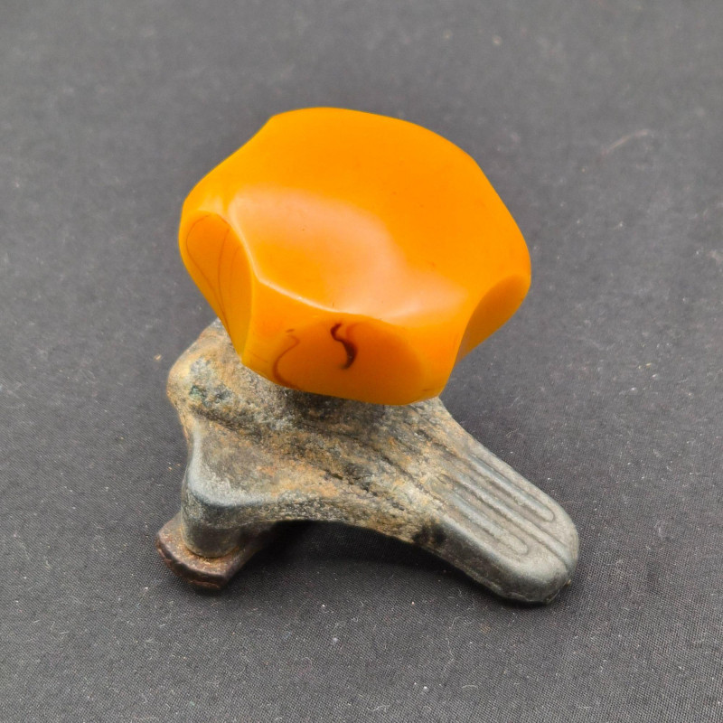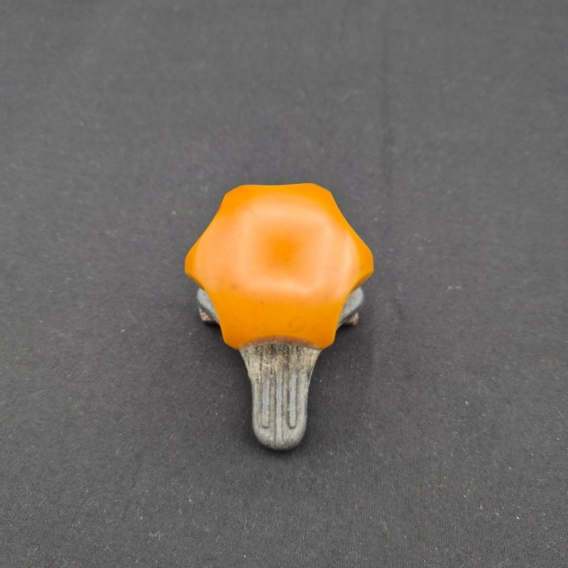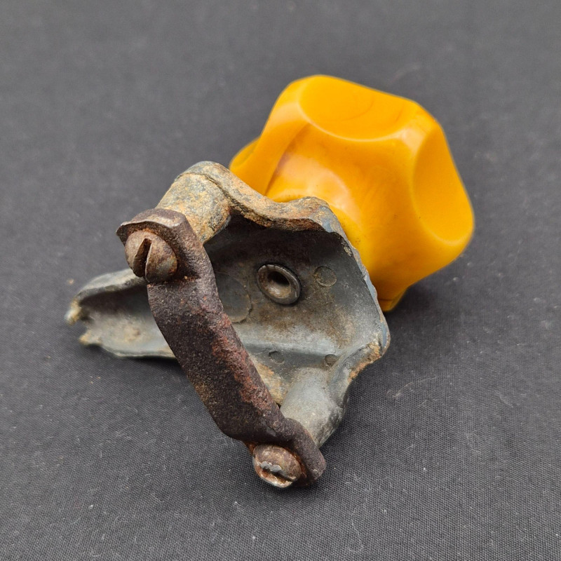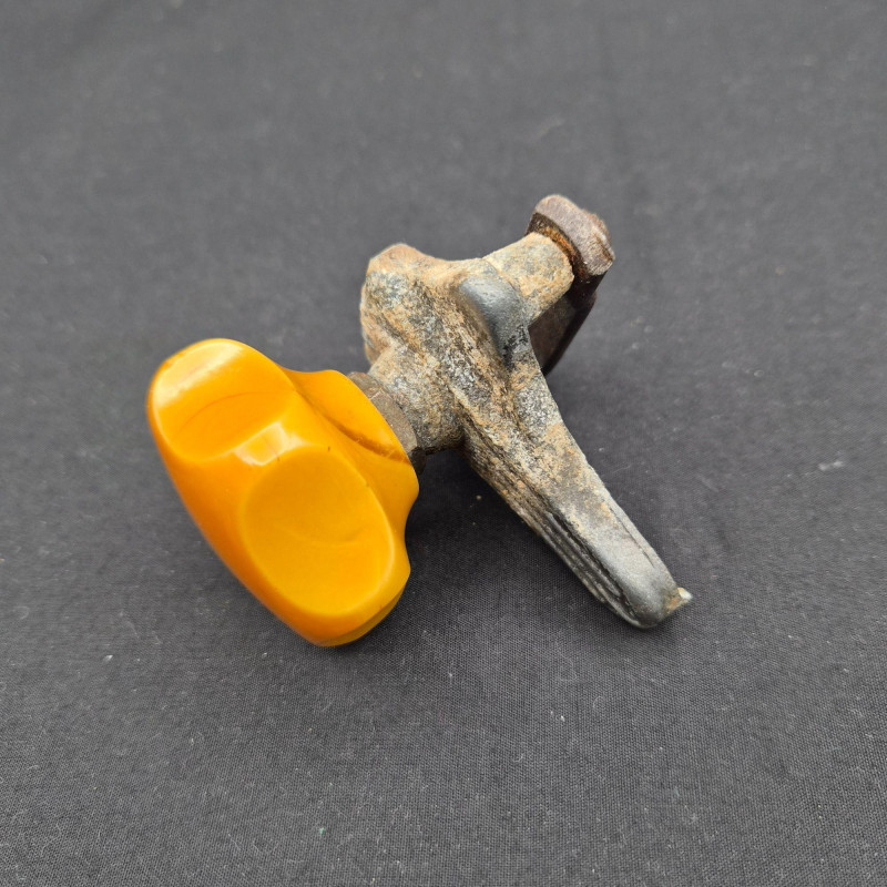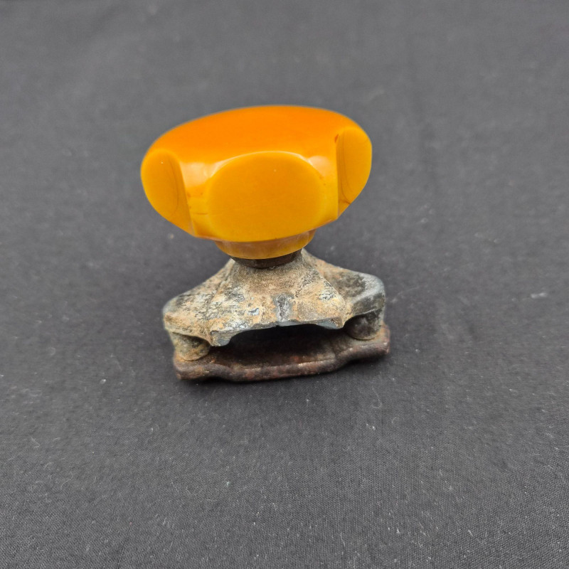 Classic mid-century steering wheel spinner knob, often referred to as a Brodie knob, necker knob, or suicide knob. This example features a faceted butterscotch Bakelite top with dark marbling and a metal base showing age-appropriate wear and oxidation. The textured grip and mounting hardware suggest it was designed for practical use in older vehicles, allowing for one-handed steering before power steering became standard. A nostalgic piece of automotive history and a standout collectible for fans of vintage tools, hot rod accessories, or Bakelite design.