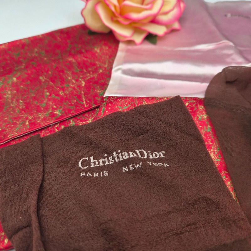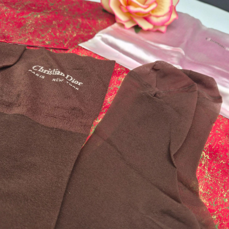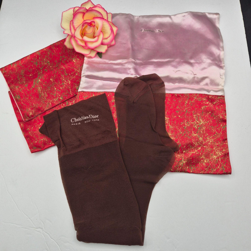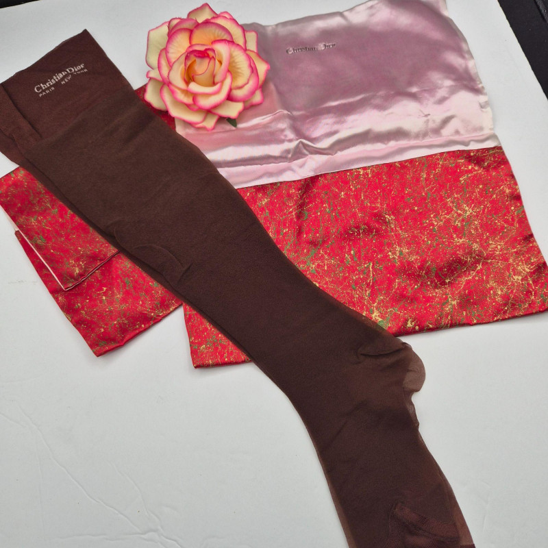 A charming mixed lot of vintage hosiery accessories and a handmade floral accent, including: A lovely combination for collectors of vintage fashion, Dior enthusiasts, or crafters seeking unique materials.