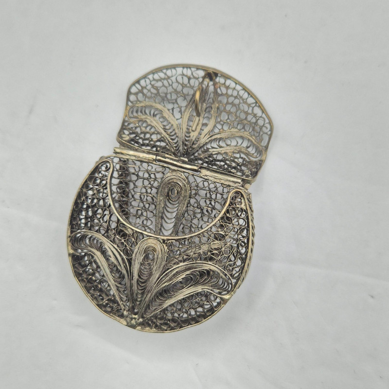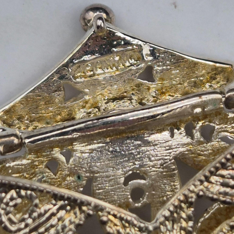 A beautifully coordinated pair of ornate silver‑plated pieces, each showcasing delicate filigree craftsmanship: Together, these pieces offer a blend of whimsy, artistry, and collectible appeal, perfect for lovers of detailed metalwork or unique vintage adornments.