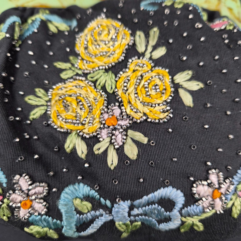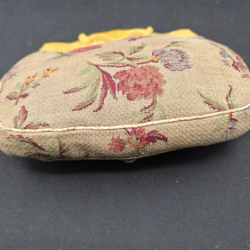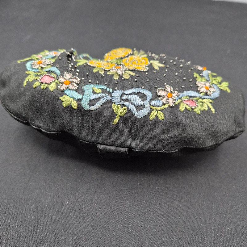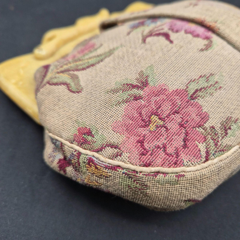 An elegant and delicate pair of 1940s clutch purses, each showcasing the period’s love of texture, florals, and decorative frames. Together they offer a lovely mix of tactile fabrics, vintage florals, and collectible frame work, perfect for display or gentle use.