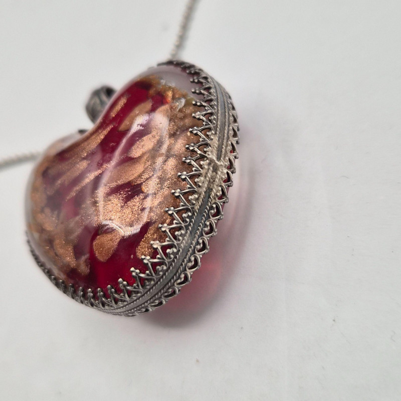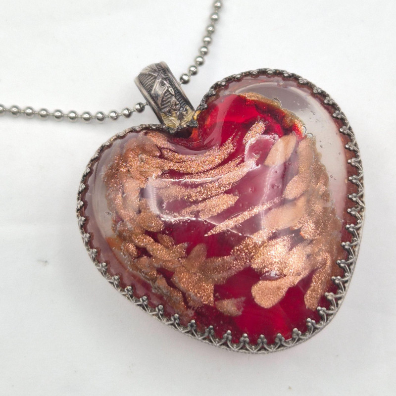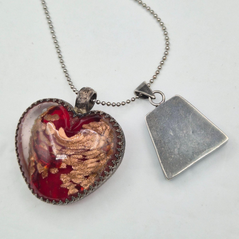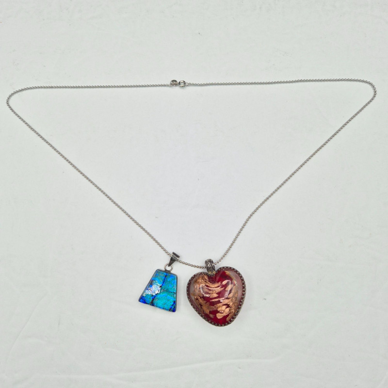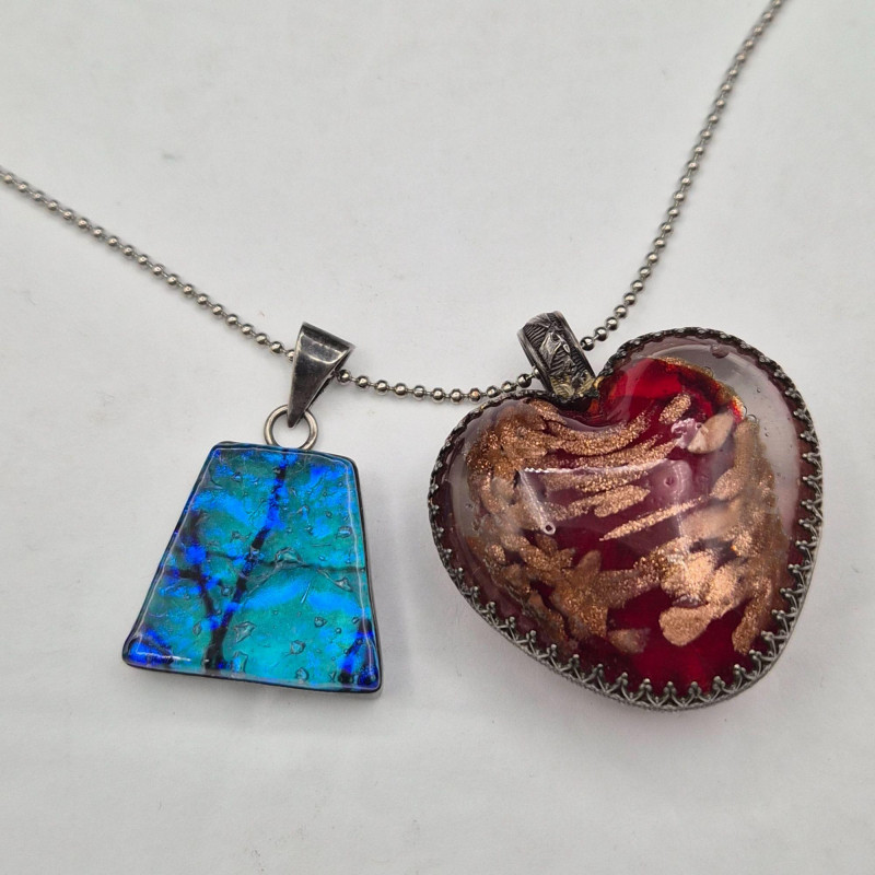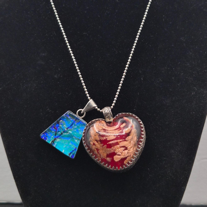 A striking pair of handcrafted art glass pendants, suspended from a 22-inch silver ball chain, offering bold color and unique design: Together, they create a playful yet elegant duo, ideal for collectors, stylists, or anyone drawn to expressive, artisan jewelry.