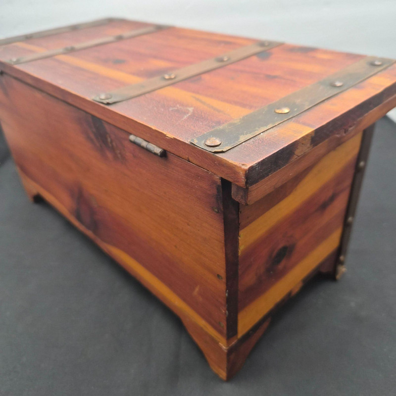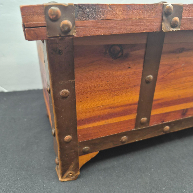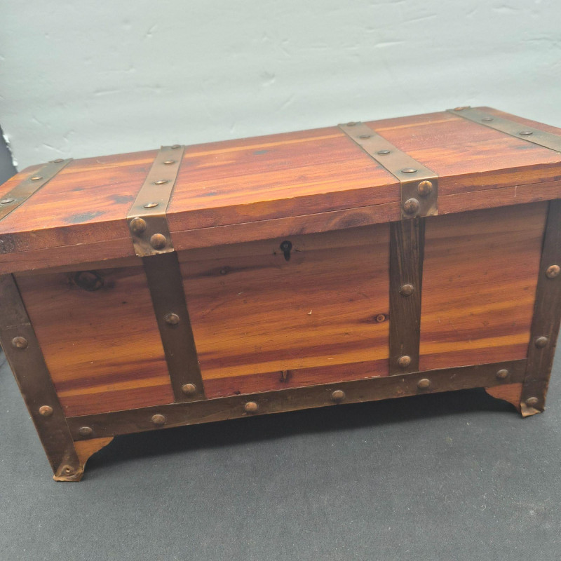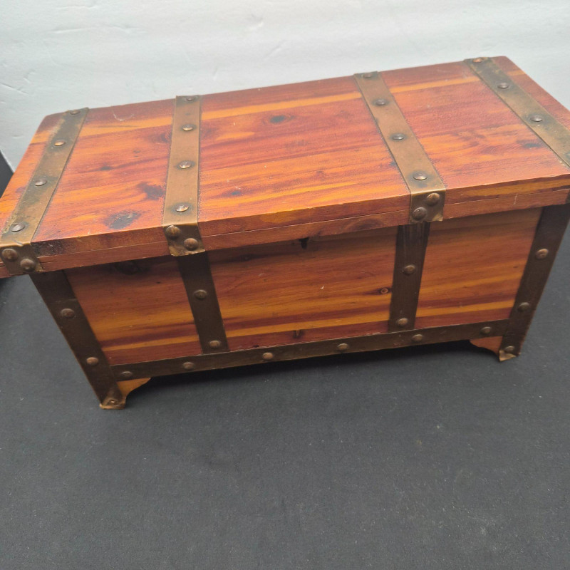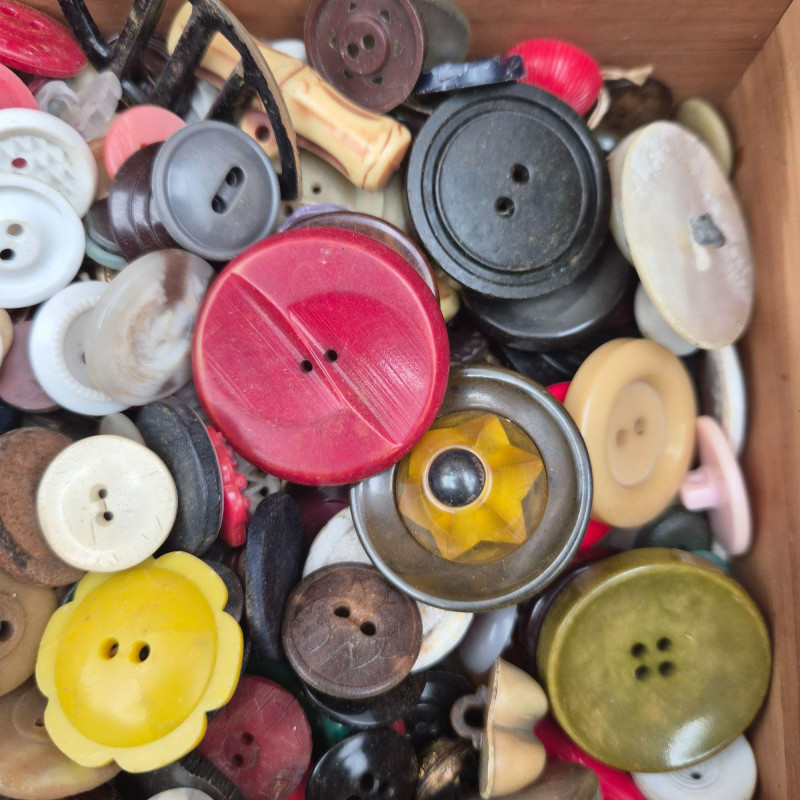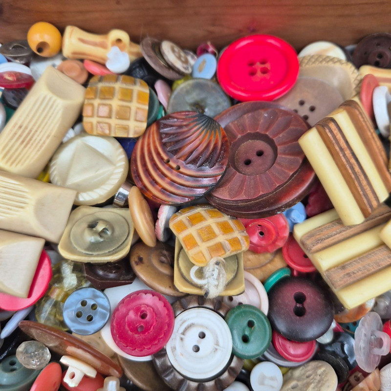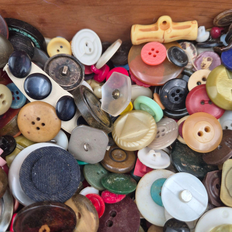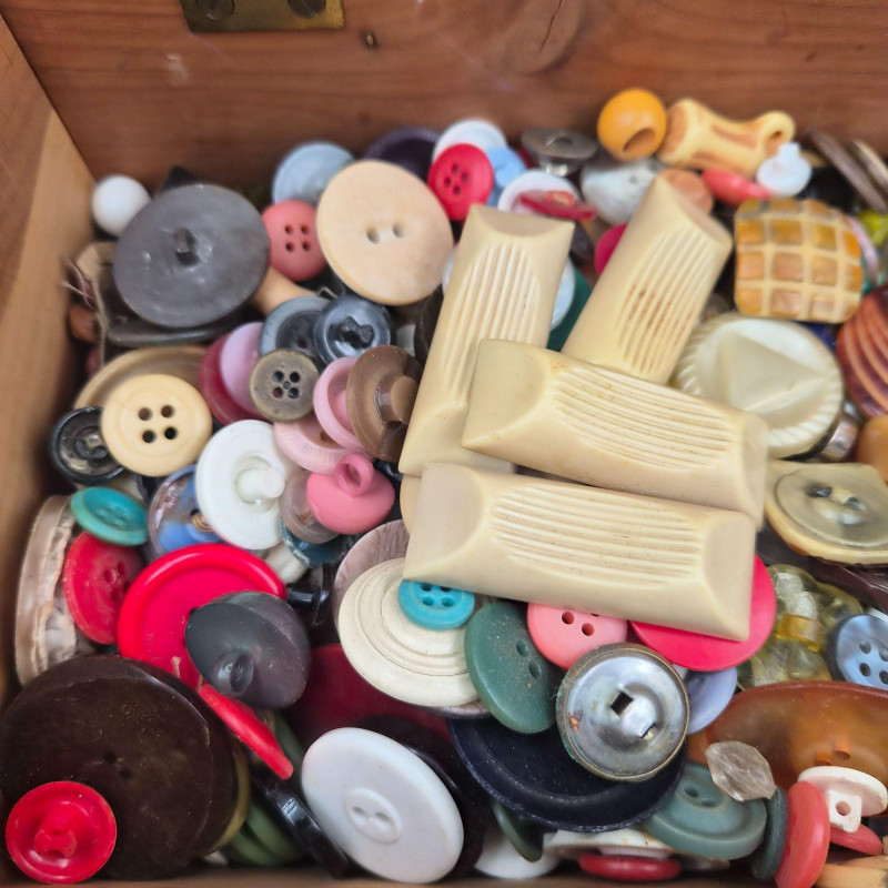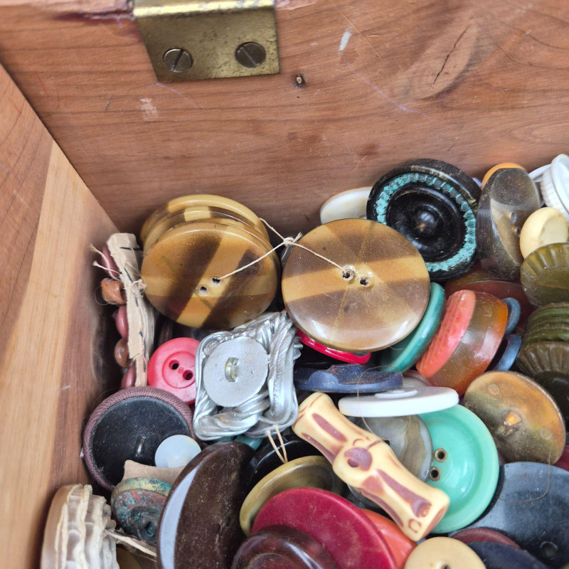 A handsome handmade cedar trunk with rustic charm, measuring approximately 14" x 7" x 6.5", filled with vintage buttons of all kinds, many are Bakelite and collectible. The box features: Inside, discover a delightful mix of colors, shapes, and materials—perfect for collectors, crafters, or anyone drawn to the tactile joy of vintage notions.