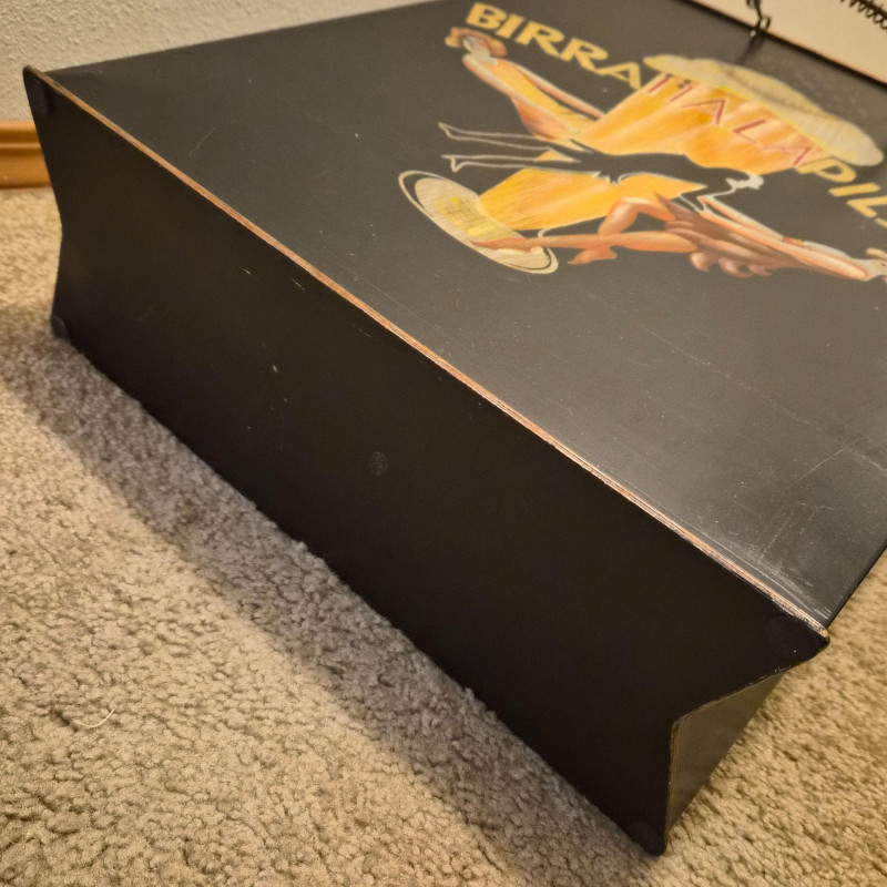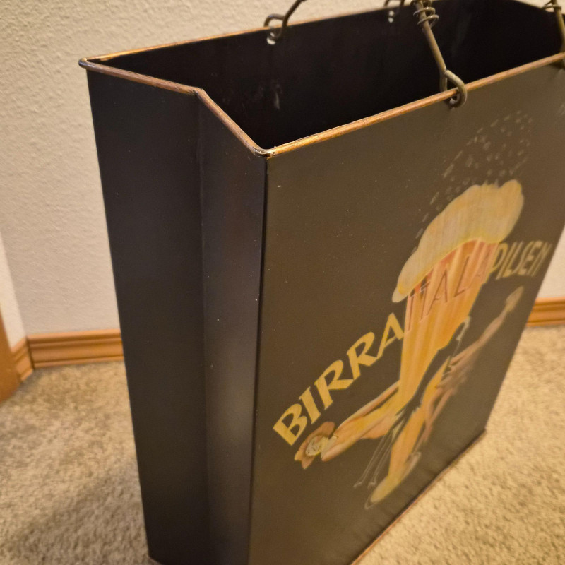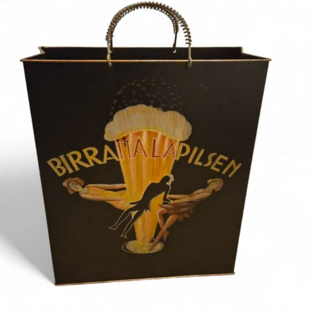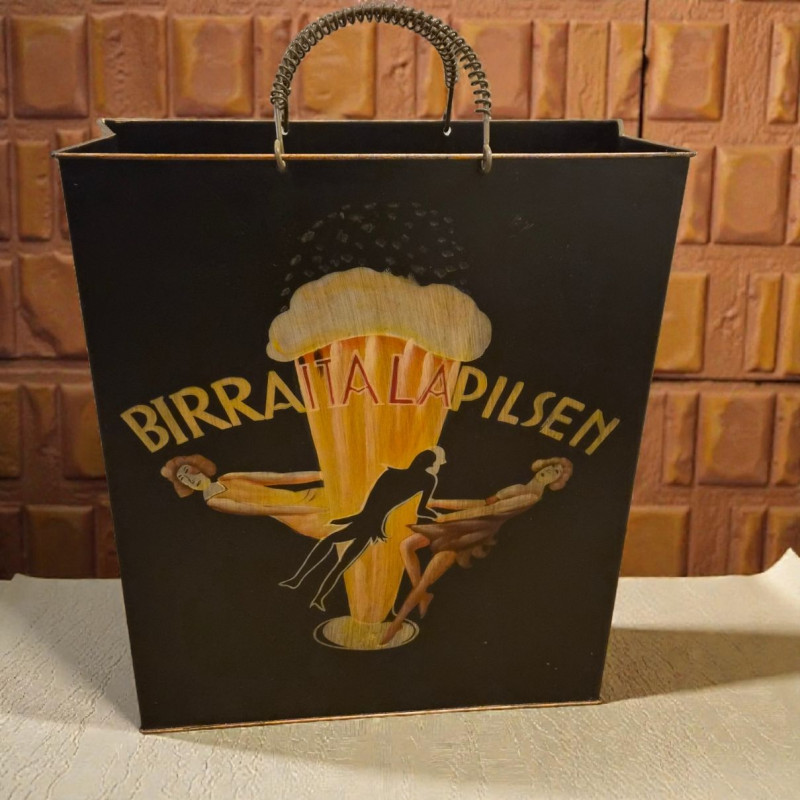 A bold and vintage‑style Birra Italia Pilsen metal wastebasket, equally suited for storage, décor, or workshop organization.