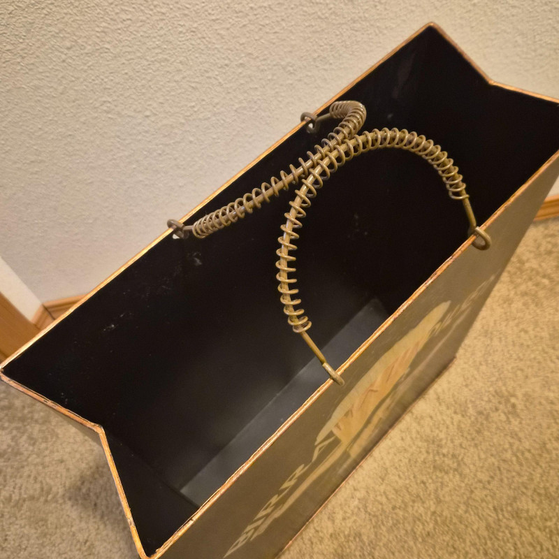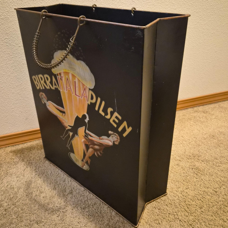 Features classic deco-style brewery graphics on both sides and on a sturdy metal body, measuring 16" × 19" × 6" - a profile that offers generous capacity without taking up much floor space. Metal wrapped double handles.