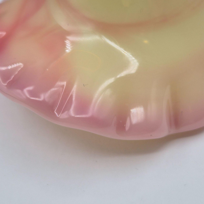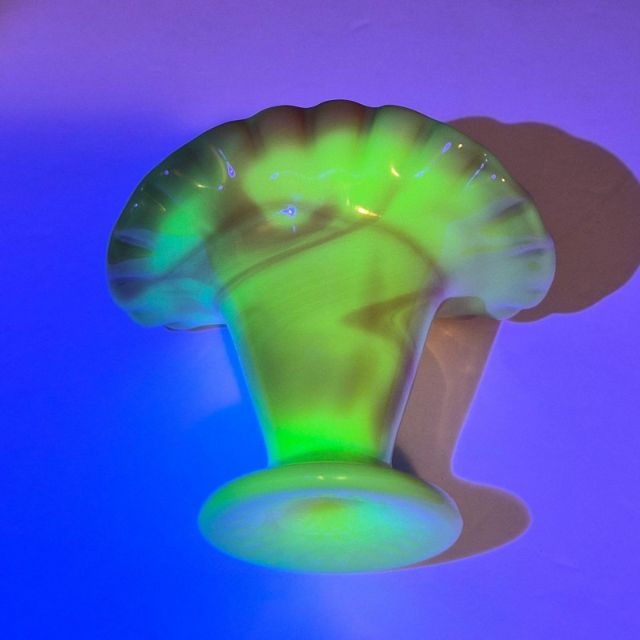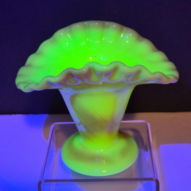 A petite yet radiant treasure, this Fenton uranium glass bud vase glows with soft charm and vintage allure. Measuring 4.5" long x 3.75" tall x 3.5" deep, it features a custard yellow base that transitions gracefully into a rosy pink ruffled rim, creating a delicate ombré effect. The body showcases a twisted swirl design, adding movement and texture, while the uranium content gives it a brilliant green fluorescence under UV light—a hallmark of collectible glass from the early 20th century. Perfect for display under blacklight or as a standalone accent, this vase blends romantic colorwork with scientific curiosity, making it a standout for collectors of Fenton, uranium glass, or art glass miniatures.