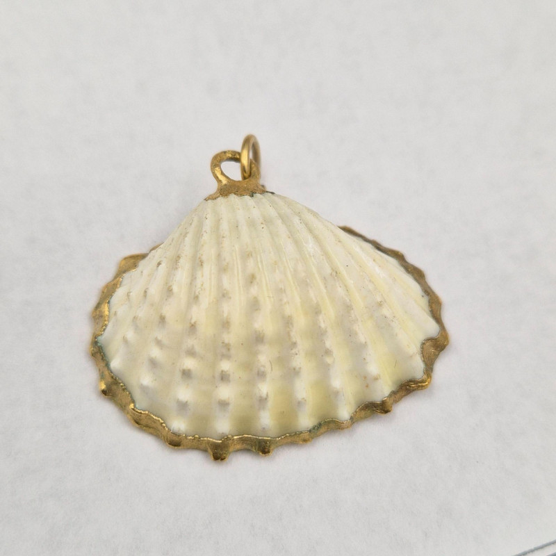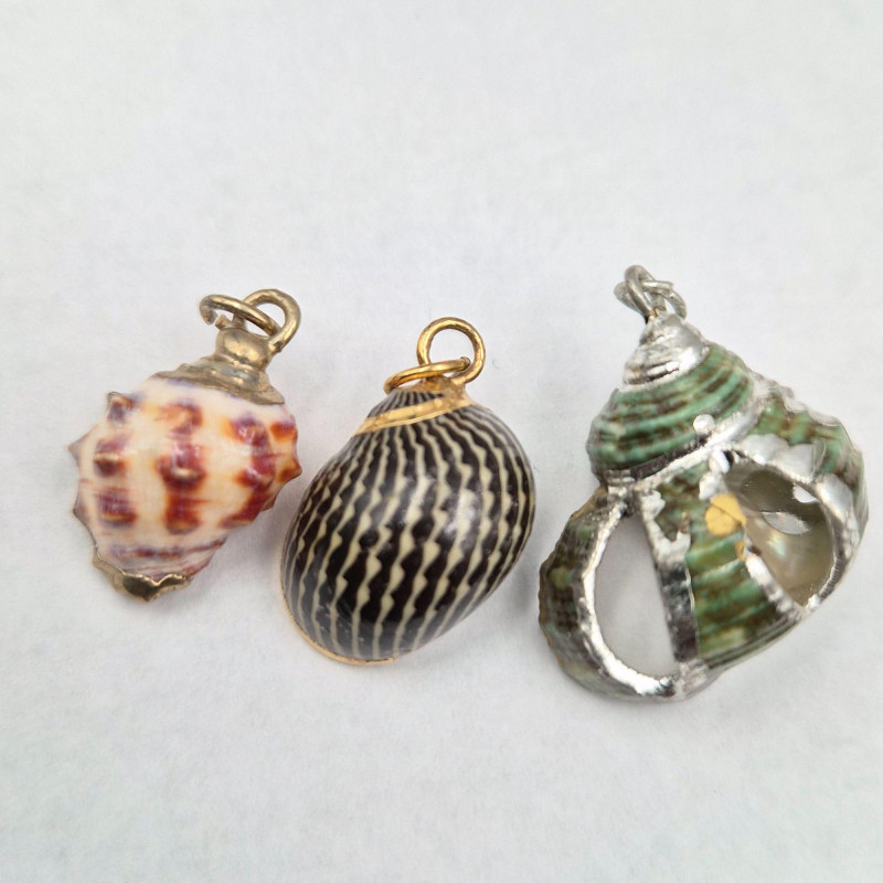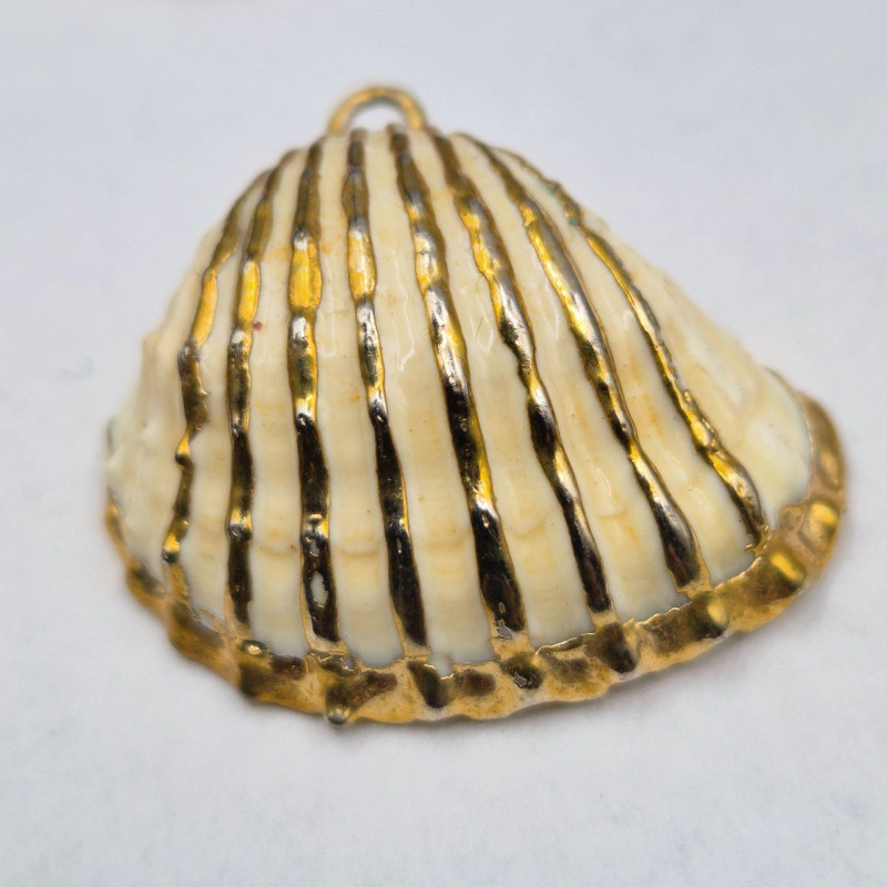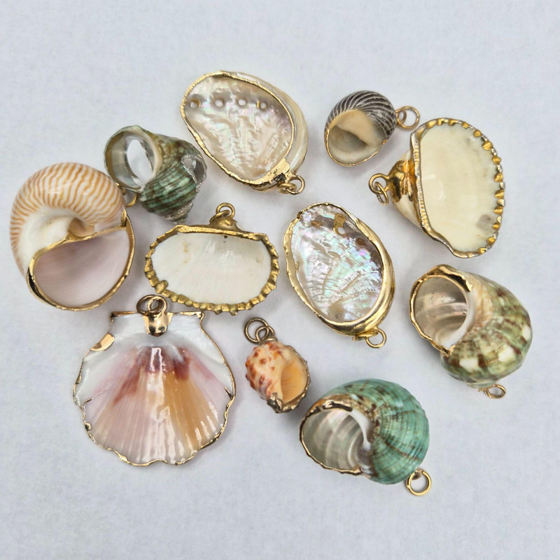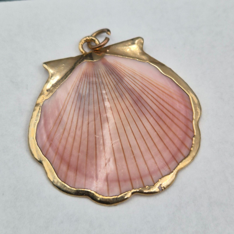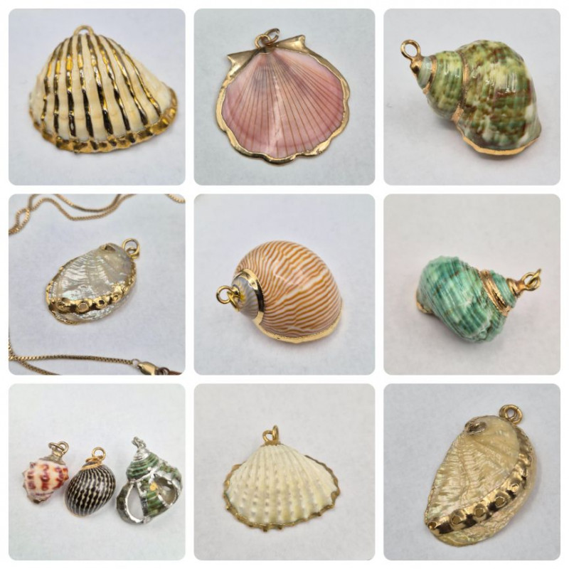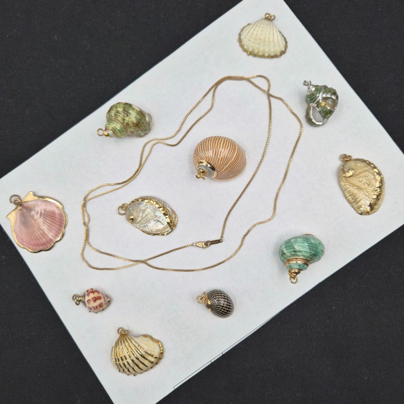 A delightful and beach‑inspired jewelry lot featuring an elegant Krementz gold‑filled box chain, measuring 28" long, paired with an assortment of eleven real beach shell pendants. Each shell is finished with gold gilt accents, with one uniquely done in silver for contrast. This collection offers a mix of natural texture and metallic shine—charming, summery, and wonderfully versatile.