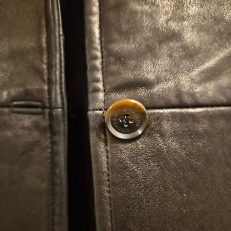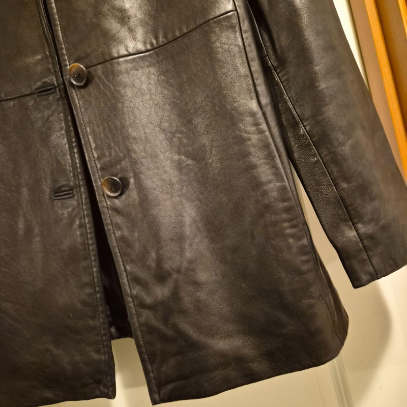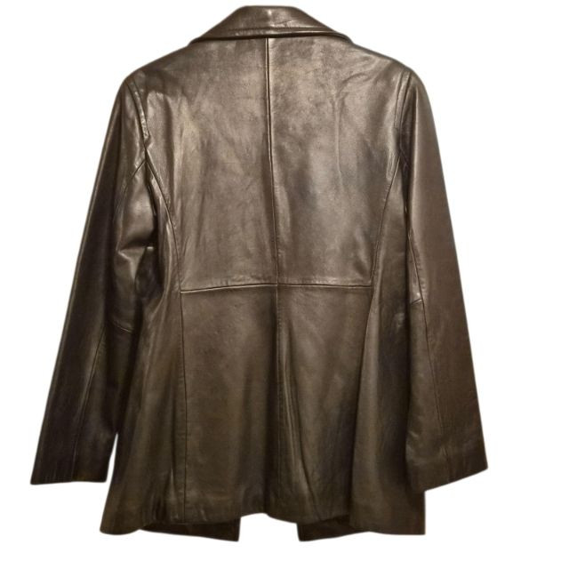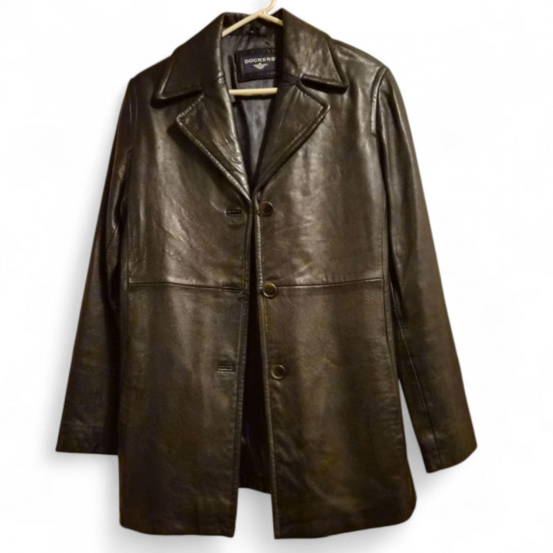 A timeless Dockers women’s black genuine leather jacket with a sleek, structured silhouette. Features a three‑button front, satin lining, and a flattering 29" length that rests just below the hip. Soft, durable leather and classic tailoring make this an easy wardrobe staple—polished enough for work, effortless for everyday wear. A versatile, well‑made piece with enduring style.