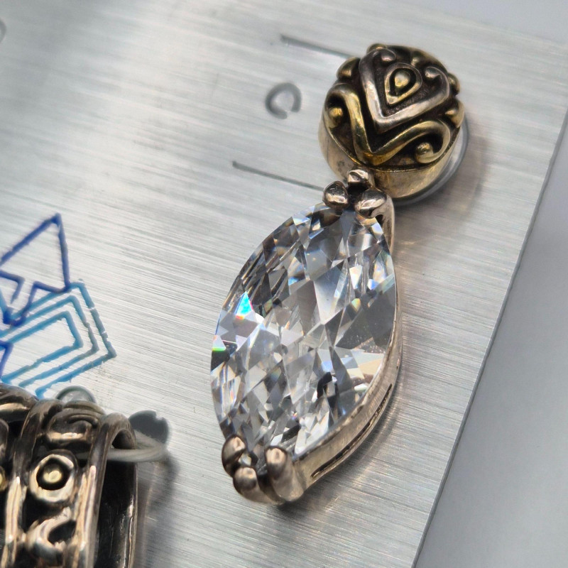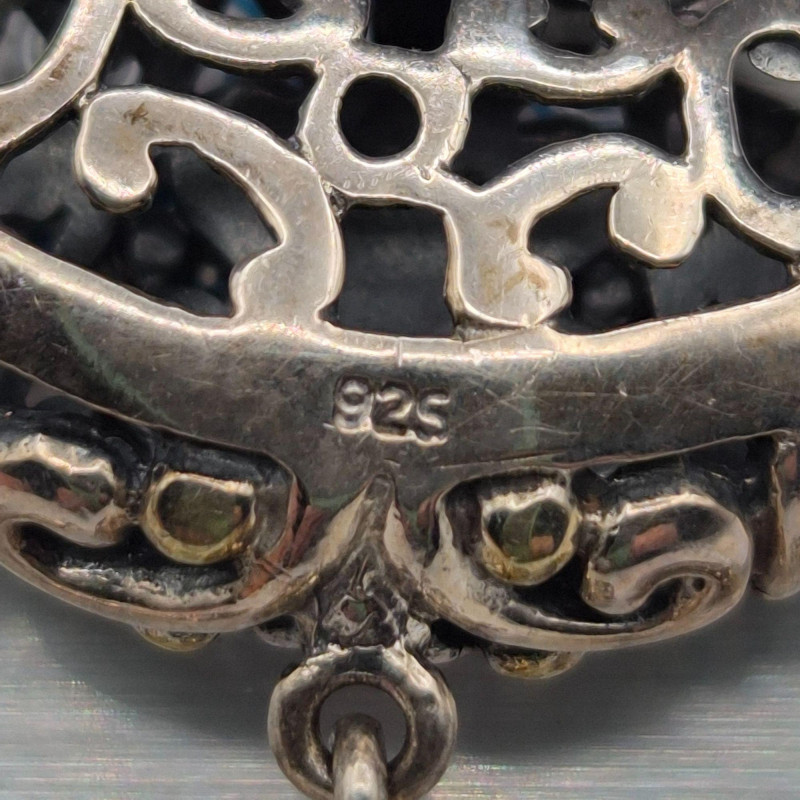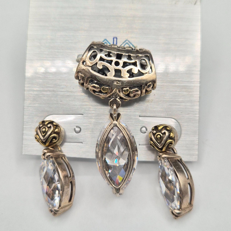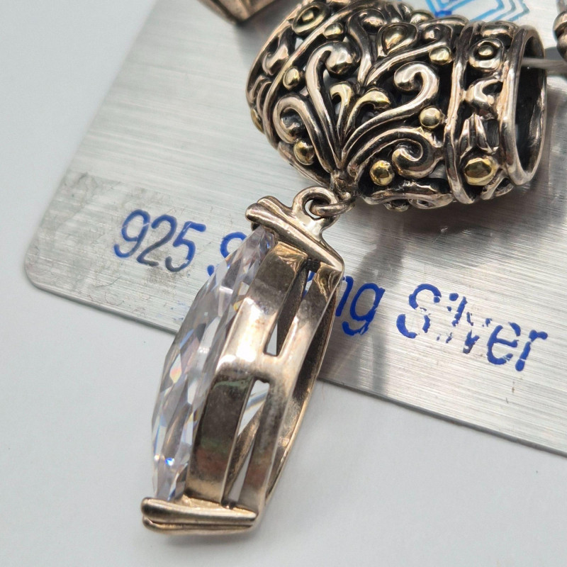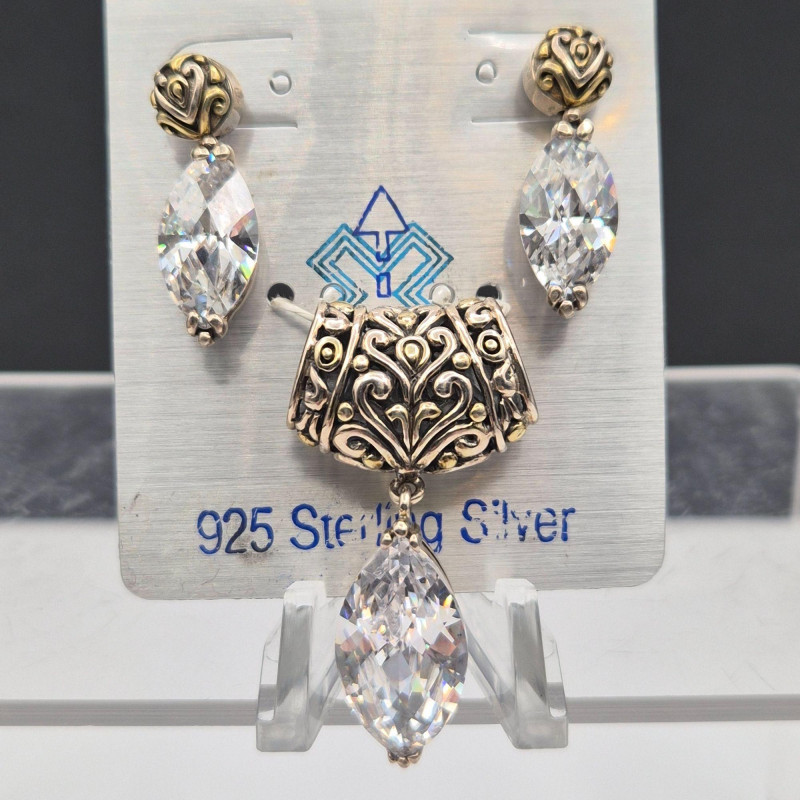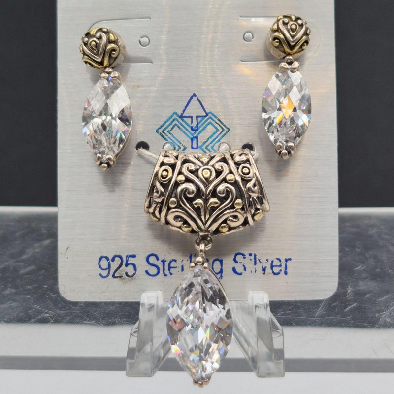 A dazzling runway‑worthy sterling silver jewelry set, bursting with crisp, icy sparkle. This ornate trio includes a pair of 1" earrings and a coordinating 1.5" x .75" pendant, each designed with brilliant ice‑clear stones that catch the light with exceptional fire. The set remains on its original card and has never been worn, preserving its pristine, gift‑ready condition. Crafted in Thailand, known for its skilled silverwork, the pieces feature intricate detailing that elevates their shine and presence. Perfect for evening wear, special occasions, or anyone who loves jewelry with bold, luminous glamour.