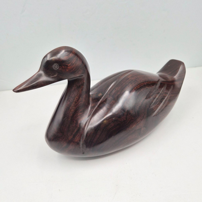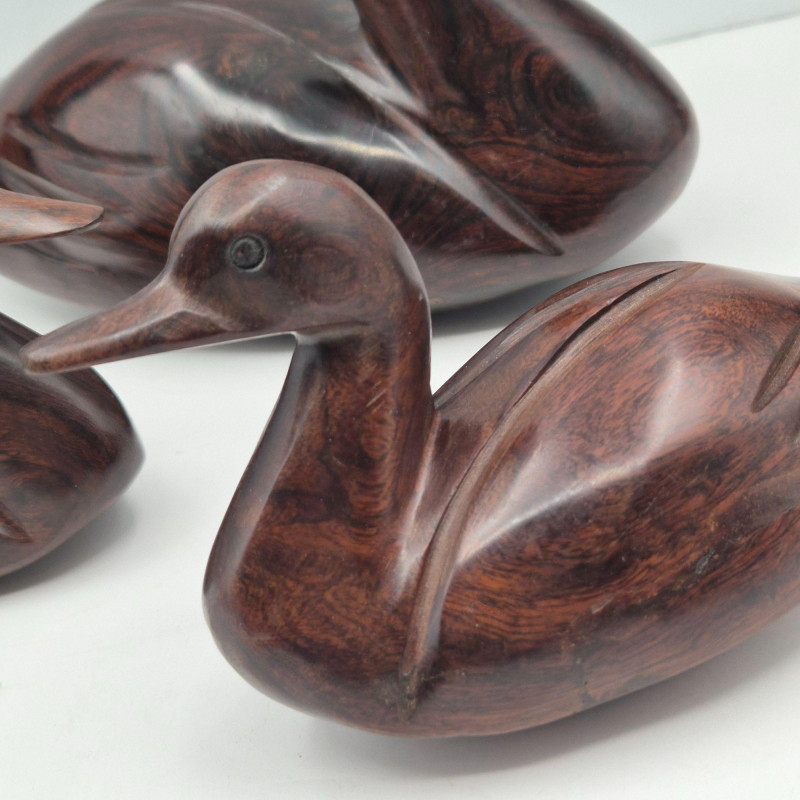 Handsome, Hearty, and Full of Natural Character - This trio of solid ironwood carved ducks brings rich texture and organic warmth to any shelf or tabletop. Each piece is hand‑carved from dense, dark ironwood, giving them a smooth, weighty presence and beautifully varied grain patterns. Their forms are simple yet expressive—classic décor pieces that blend seamlessly with rustic, lodge, mid‑century, or nature‑inspired interiors. The group includes three sizes: None are signed, but all display the hallmarks of skilled craftsmanship. A timeless, earthy set perfect for collectors of carved animals or anyone who loves the quiet charm of natural wood sculpture.