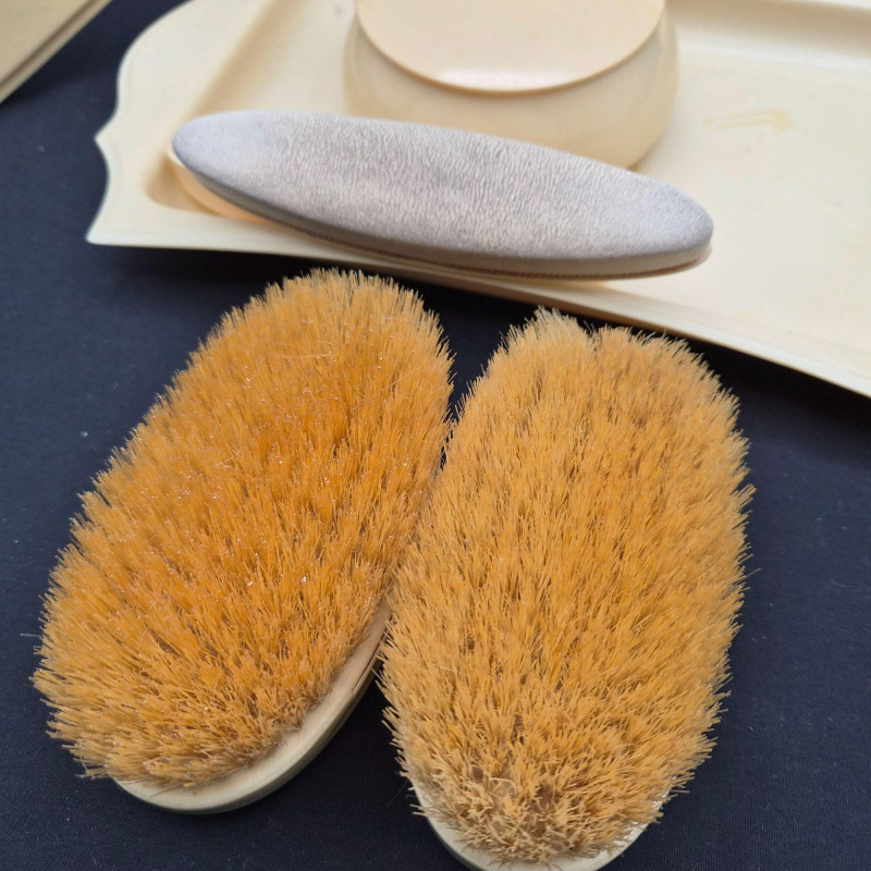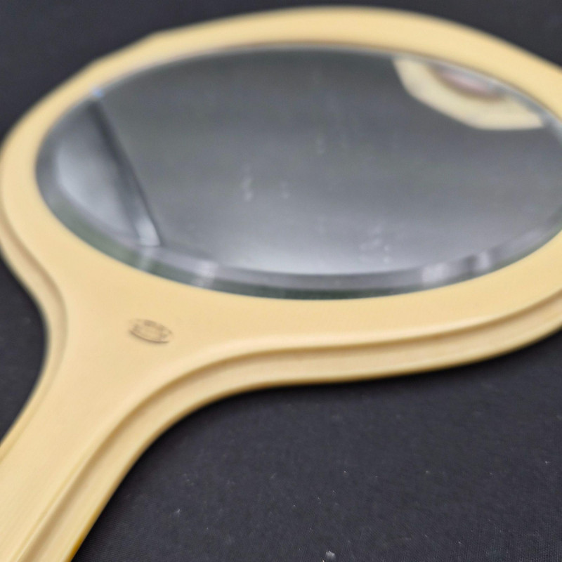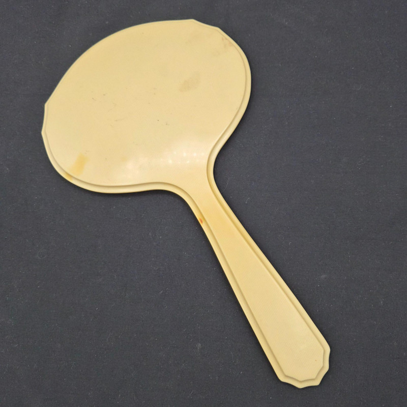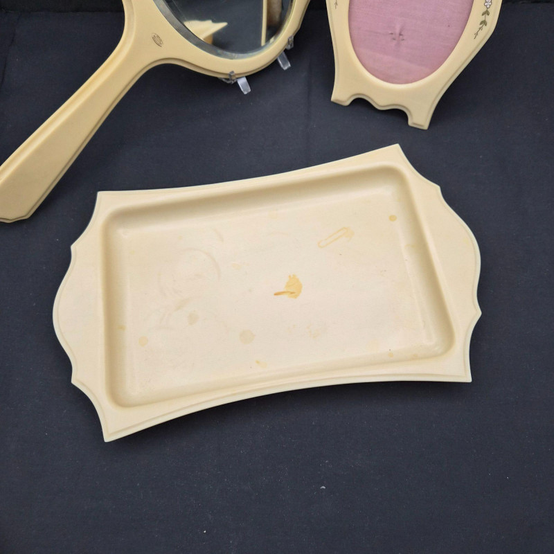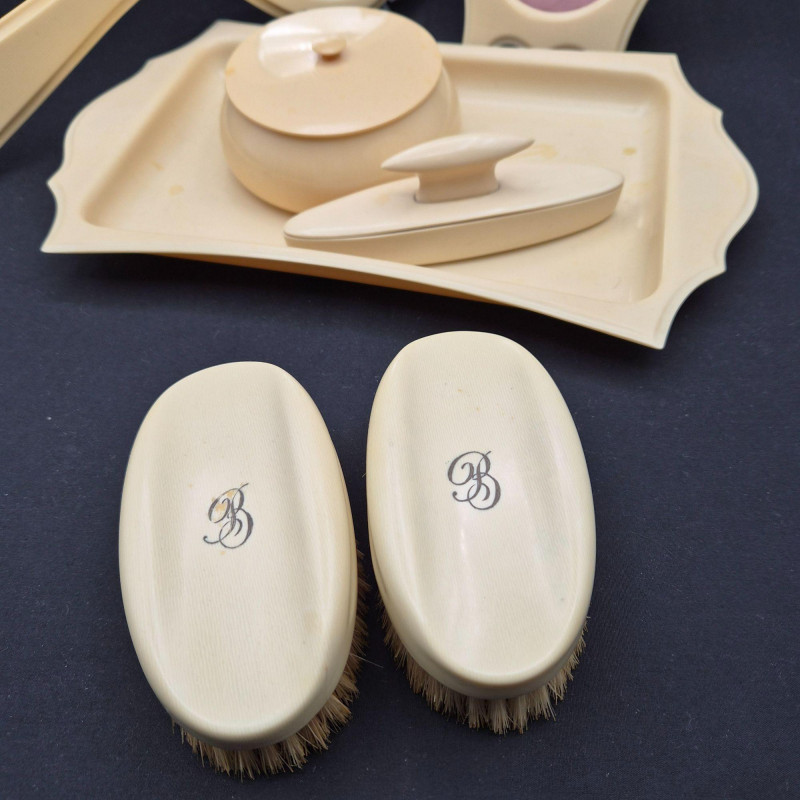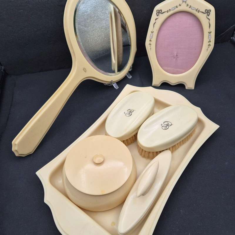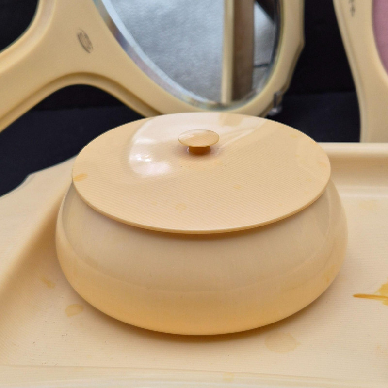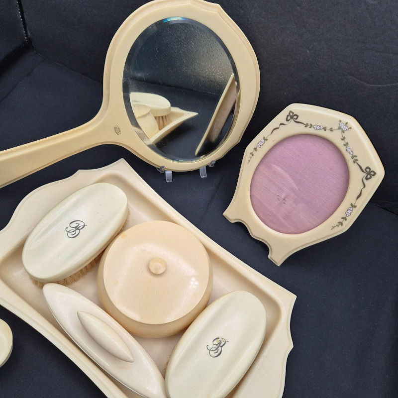 A classic multi-piece celluloid vanity set featuring coordinated grooming and display accessories: A lovely set for bedroom décor, staging, or collectors of timeless vanity accessories.