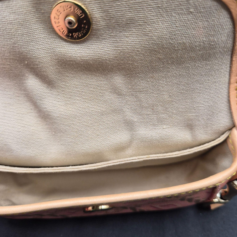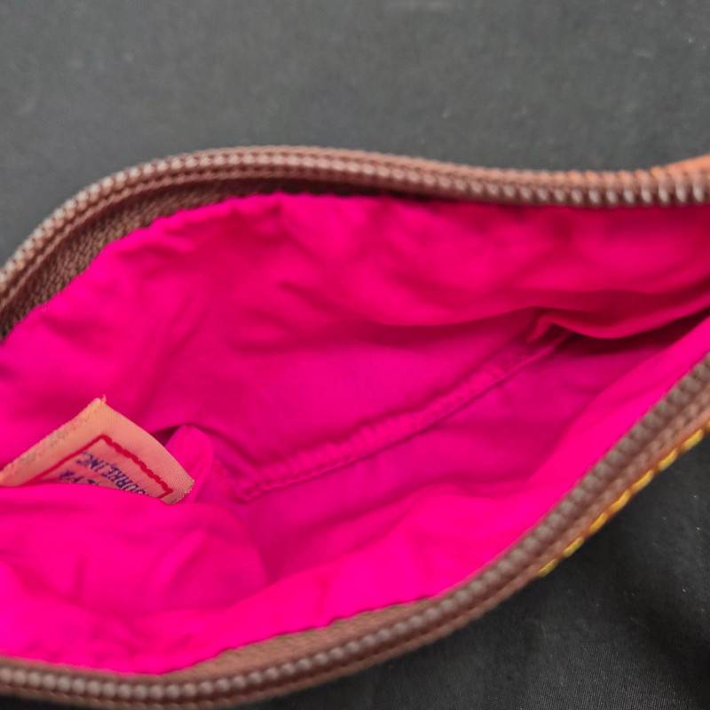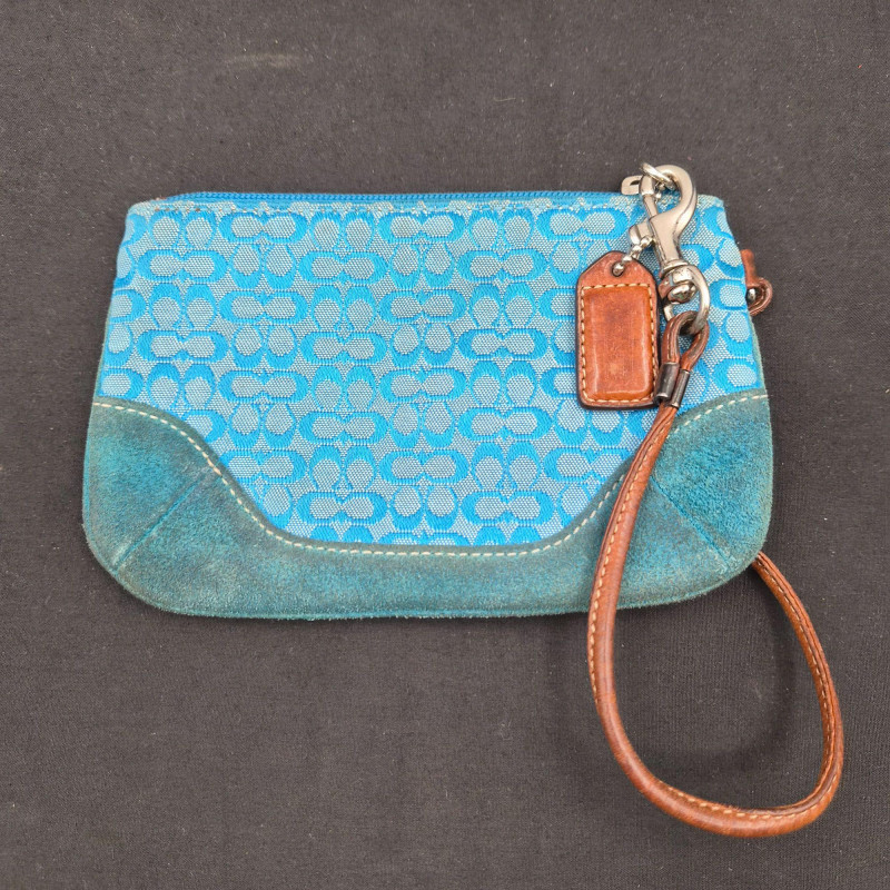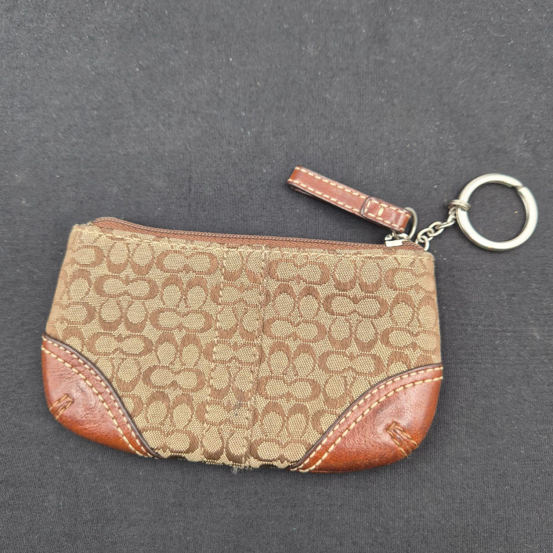 A stylish assortment of six small wristlets and coin‑purse keychains from Coach and Dooney & Bourke, featuring a variety of materials, colors, and signature patterns. Light age wear consistent with gentle use.