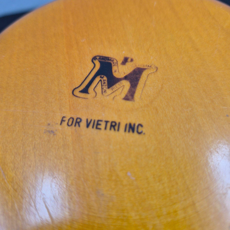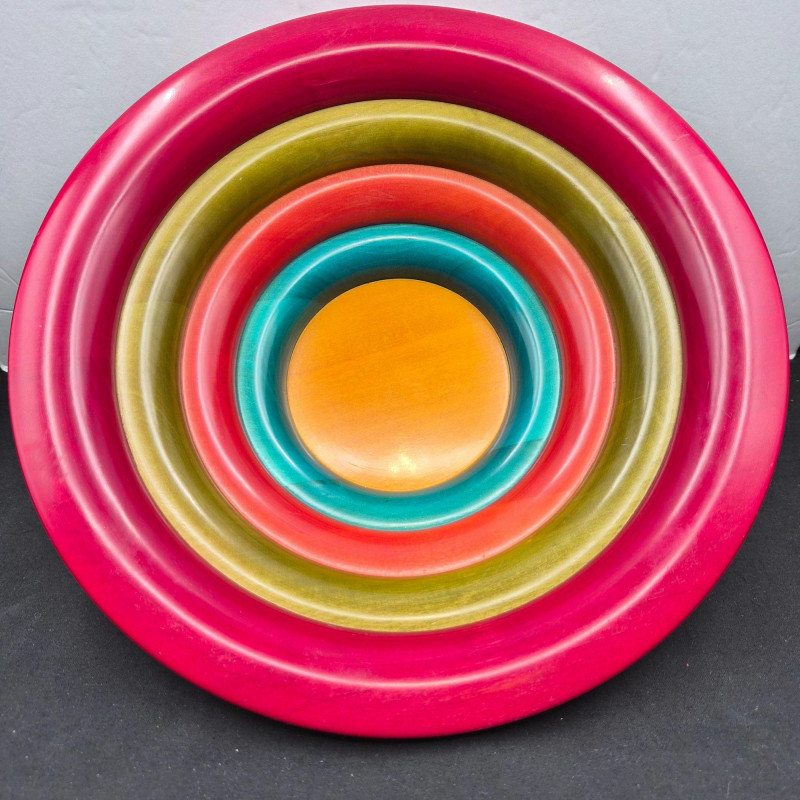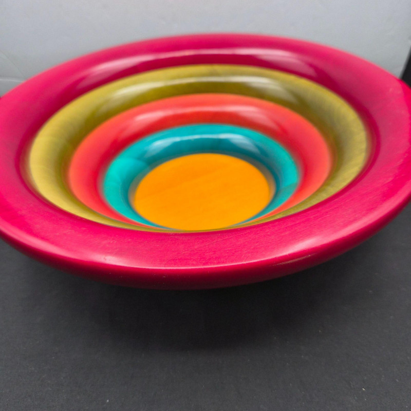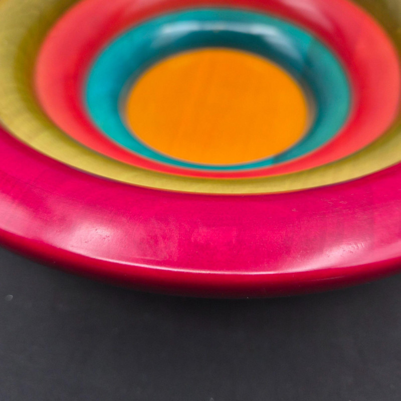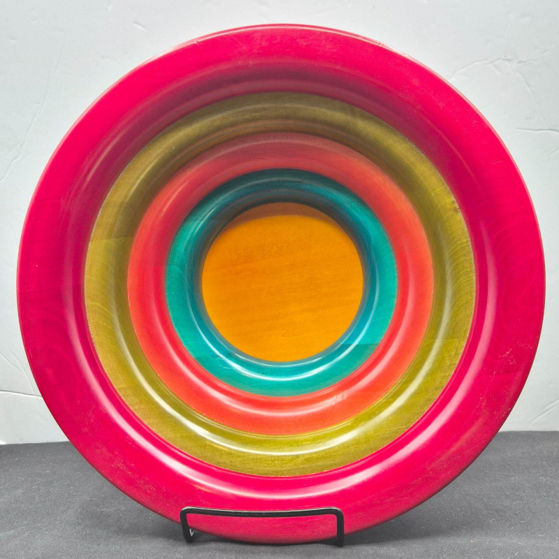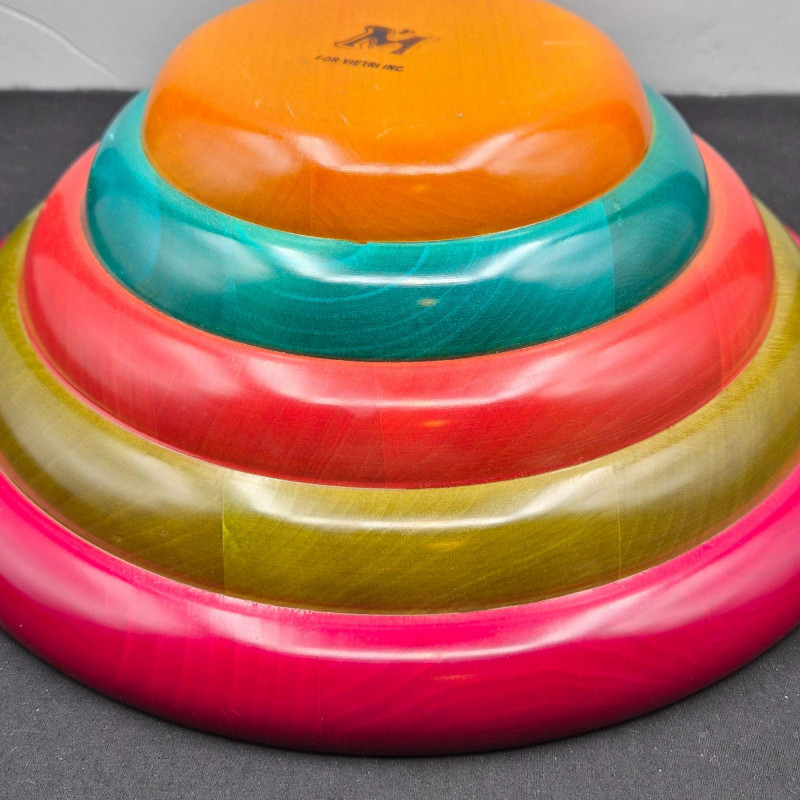 Italian multi‑colored ring wooden salad bowl designed by Pietro Manzoni for Vietri. A vibrant, artisan‑crafted piece showcasing layered color bands and Vietri’s signature Italian design aesthetic. Measures 11" in diameter x 4" tall. Beautiful as a functional serving bowl or as a striking decorative accent.