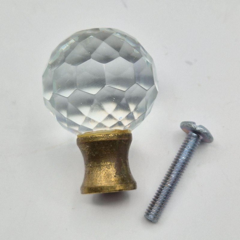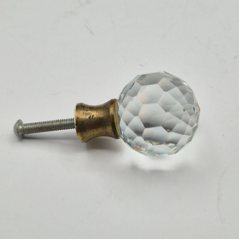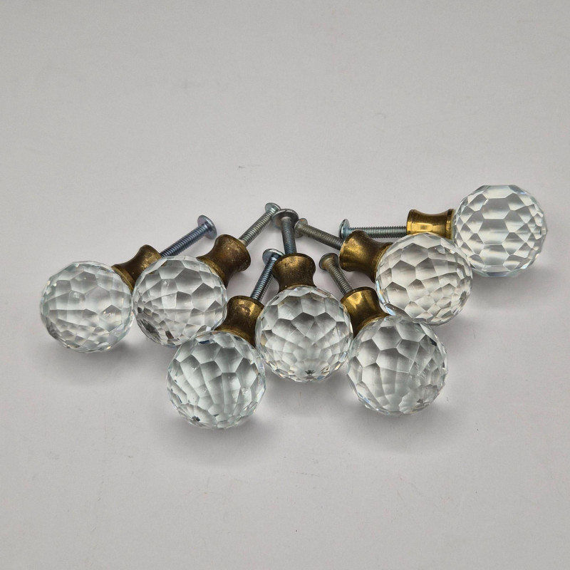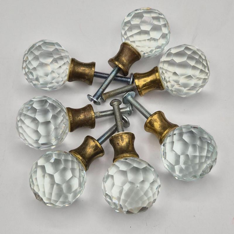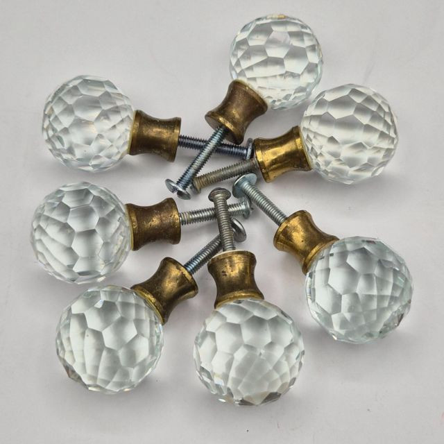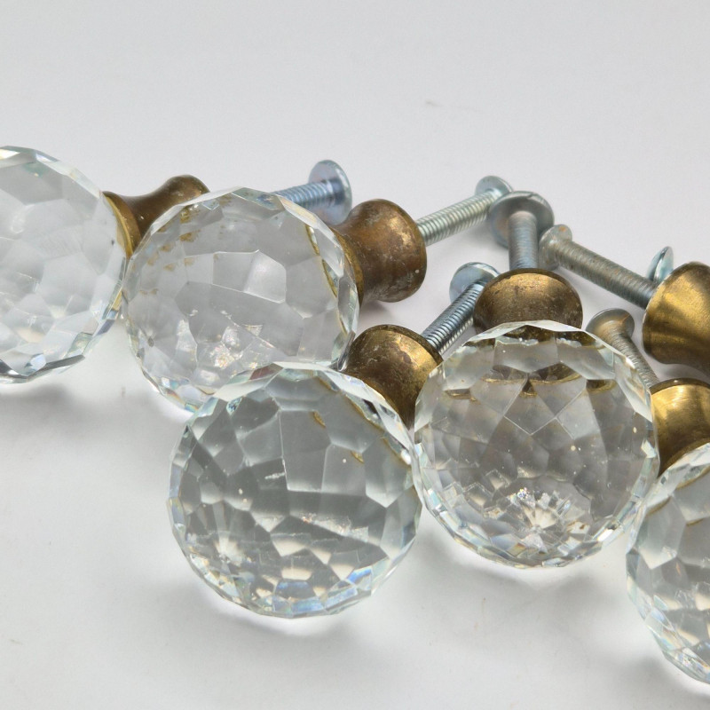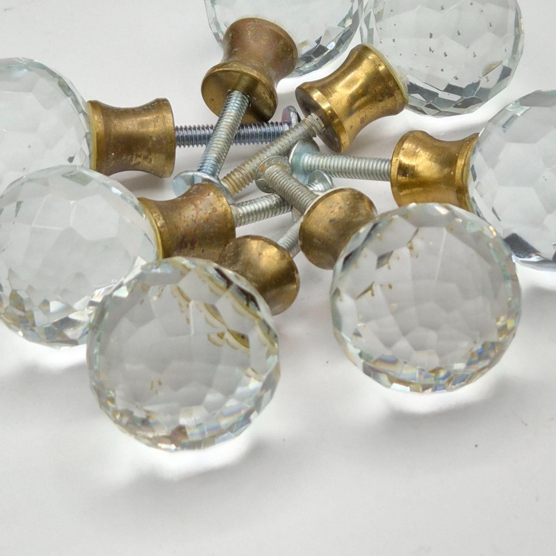 Set of seven round faceted crystal drawer knobs with classic brass fittings. Each knob includes its screw hardware, making them ready for installation on dressers, vanities, cabinets, or restoration projects.