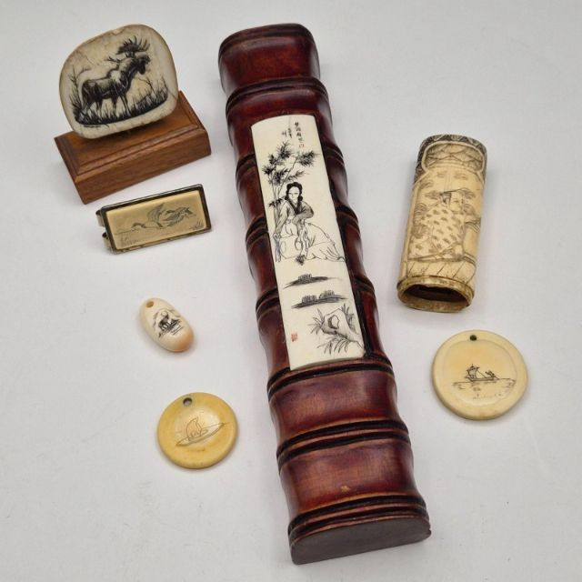 Lot # 115 - Scrimshaw & Hand‑Carved Bone Collection – Décor, Pendants & Money Clip
