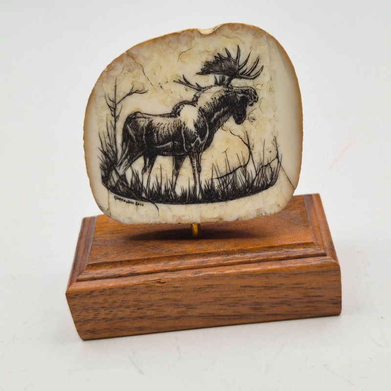 • Additional Pieces – Three carved pendants, a money clip by Anson, and a small moose scrimshaw on a wood base measuring approx. 2.75" W x 3" H x 1.25" D.