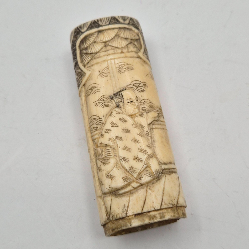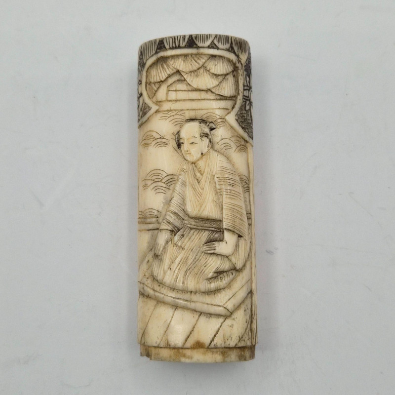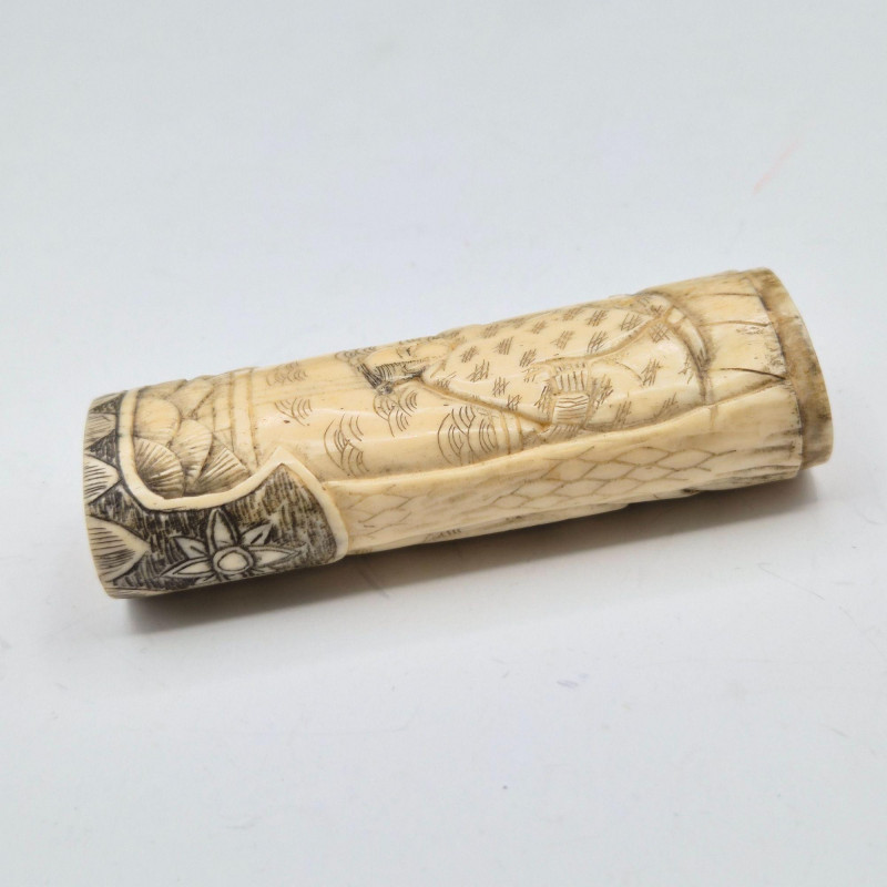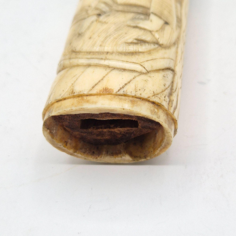 • Hand‑Carved Bone Figure (approx. 3.5") – Depicts two Chinese men; possibly once a lighter sleeve. Appears very old, fully hand‑carved, and may have originally had a base cap.