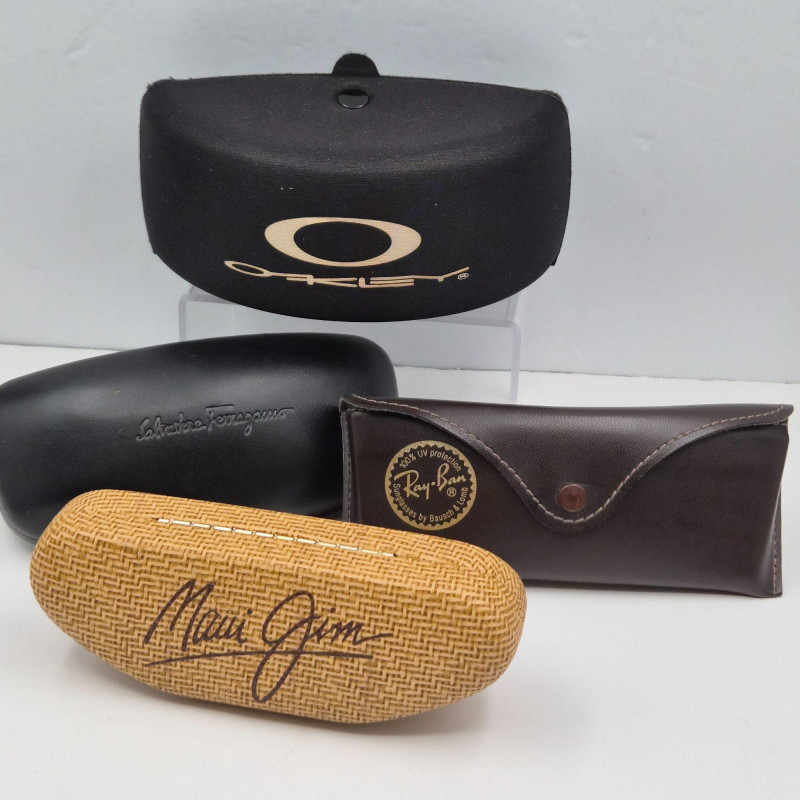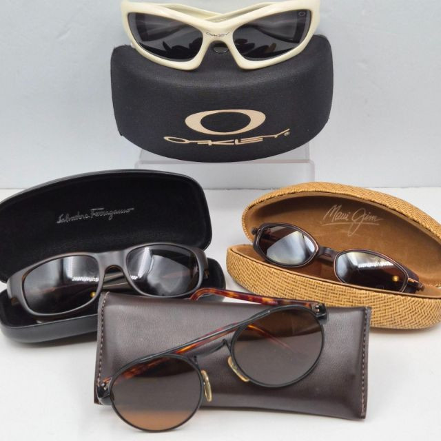 Variety lot of men’s sunglasses featuring well‑known brands and styles: Included are four clamshell cases from Maui Jim, Oakley, Ray‑Ban, and Salvatore Ferragamo.