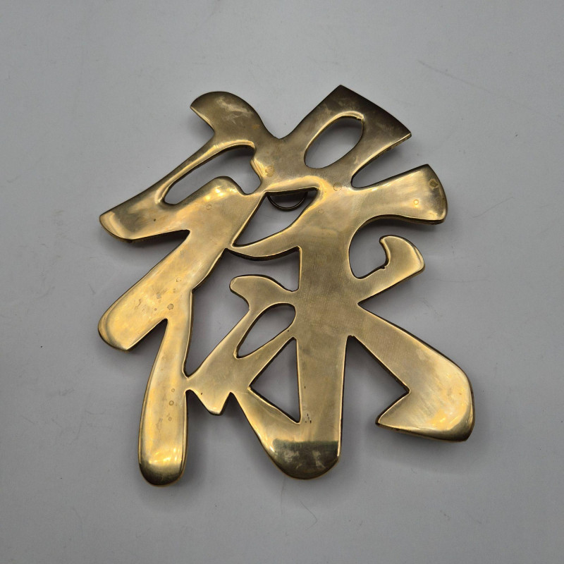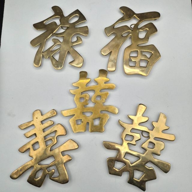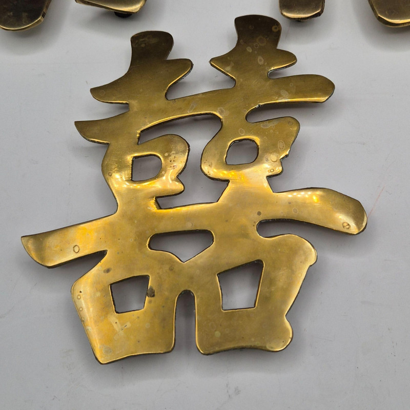 Set of five solid brass Asian‑symbol trivets that can be used as functional trivets or hung as wall décor. Each features a traditional character representing Long Life, Joy, Good Luck, Prosperity, and Double Happiness.