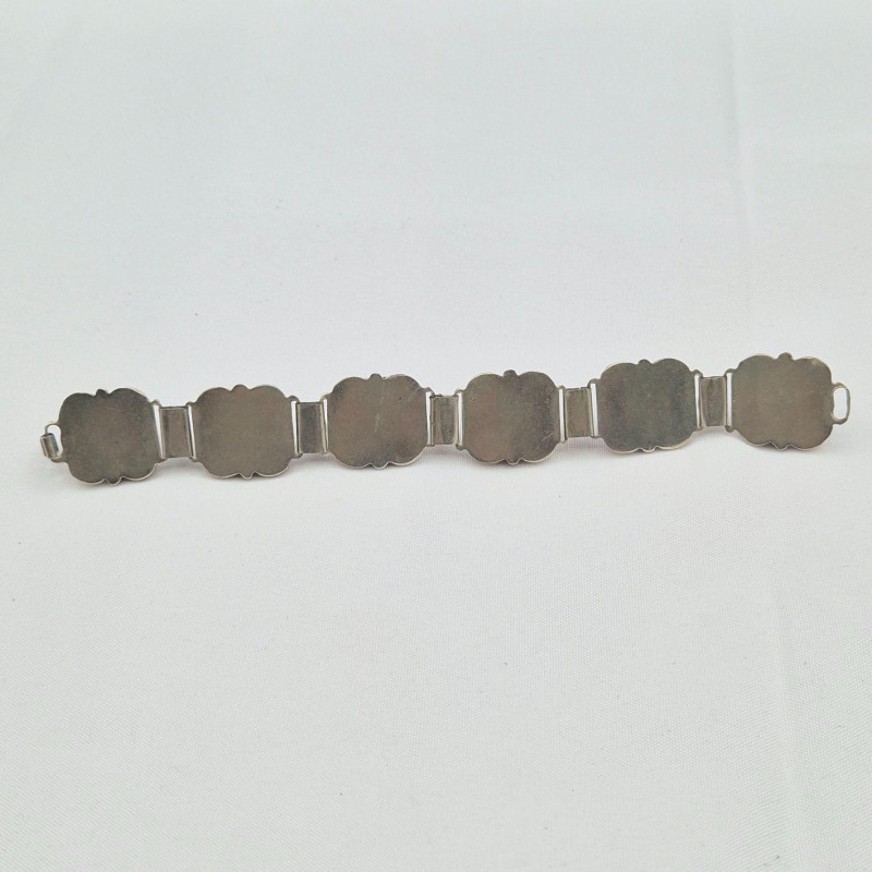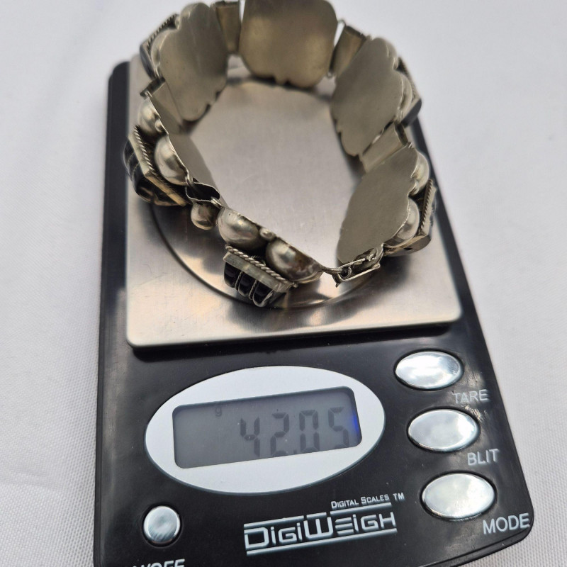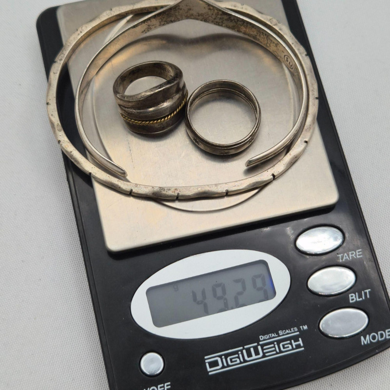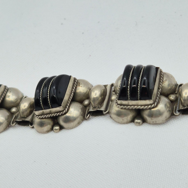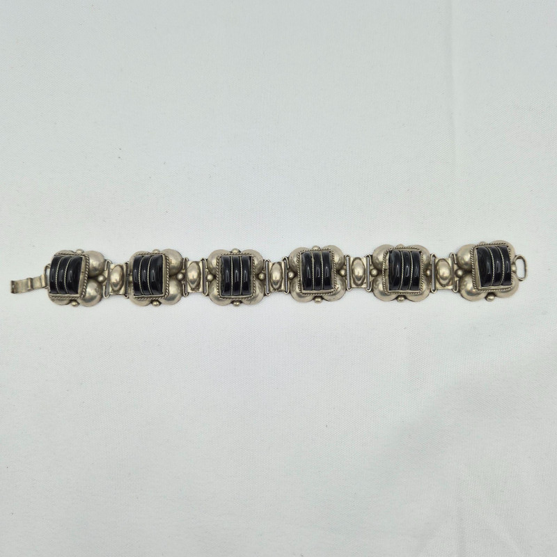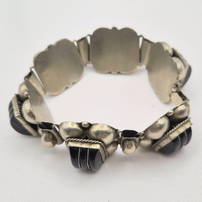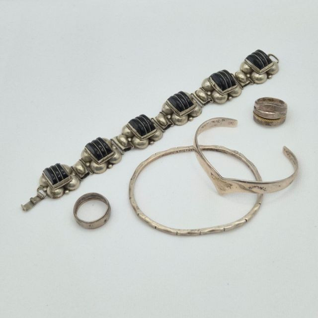 A character‑rich assortment of Mexico silver jewelry, showcasing handcrafted detail and a naturally aged patina that collectors love. This mix includes three bracelets and two rings, blending bold design with vintage charm. Only the stamped pieces were weighed, totaling 49.2 grams of silver. The unstamped onyx panel bracelet is included but not part of the weight measurement. A great lot for collectors of Mexico silver, lovers of natural patina, or anyone seeking distinctive vintage pieces.