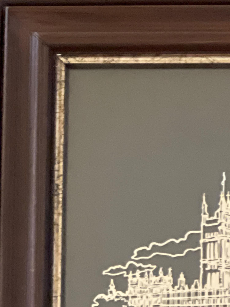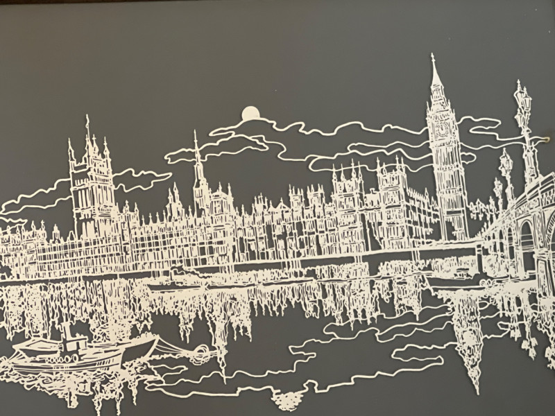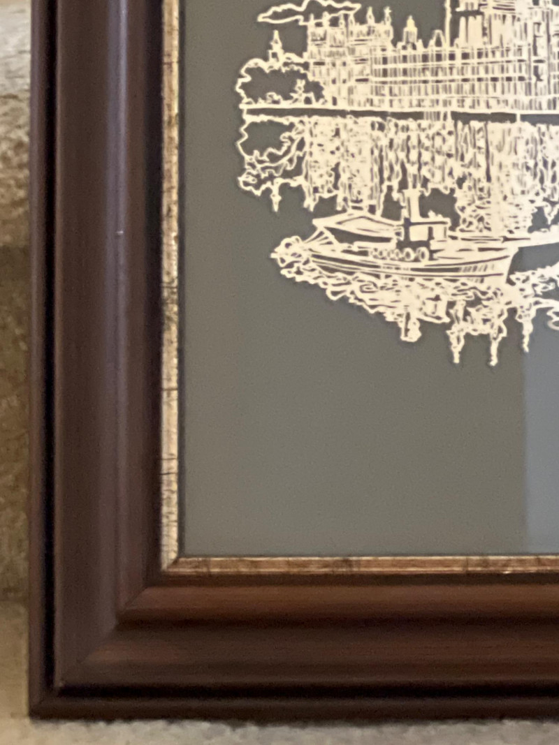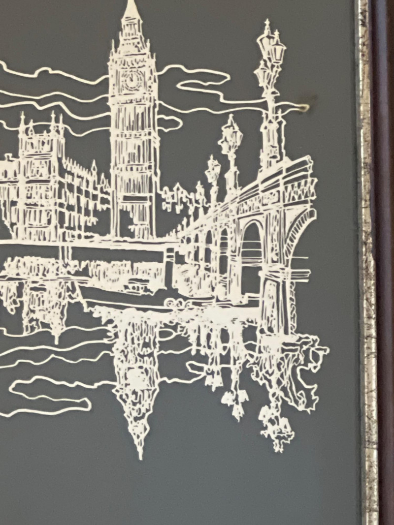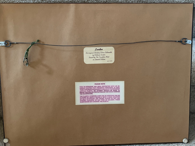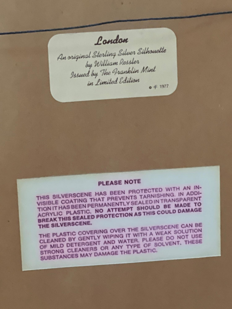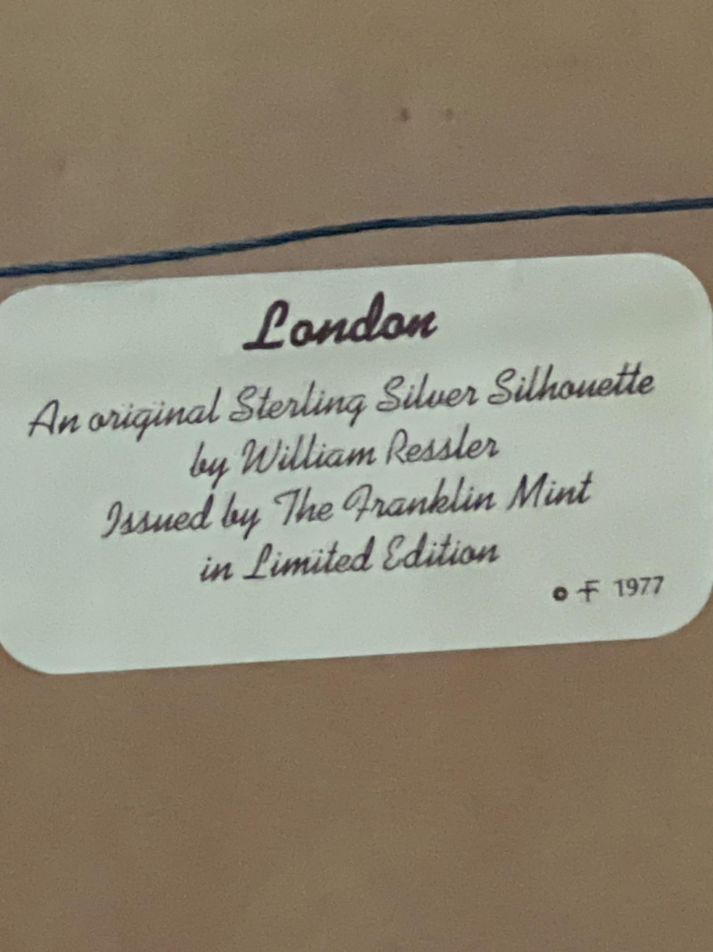 Limited‑edition Sterling Silver Silhouette of London, designed by artist William Ressler and issued by the Franklin Mint in 1977. The artwork features an intricately rendered skyline of London—including the Palace of Westminster and Big Ben—etched in sterling silver and presented in its original frame. A striking collectible combining fine metalwork with architectural artistry.