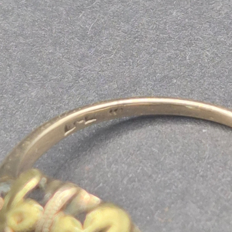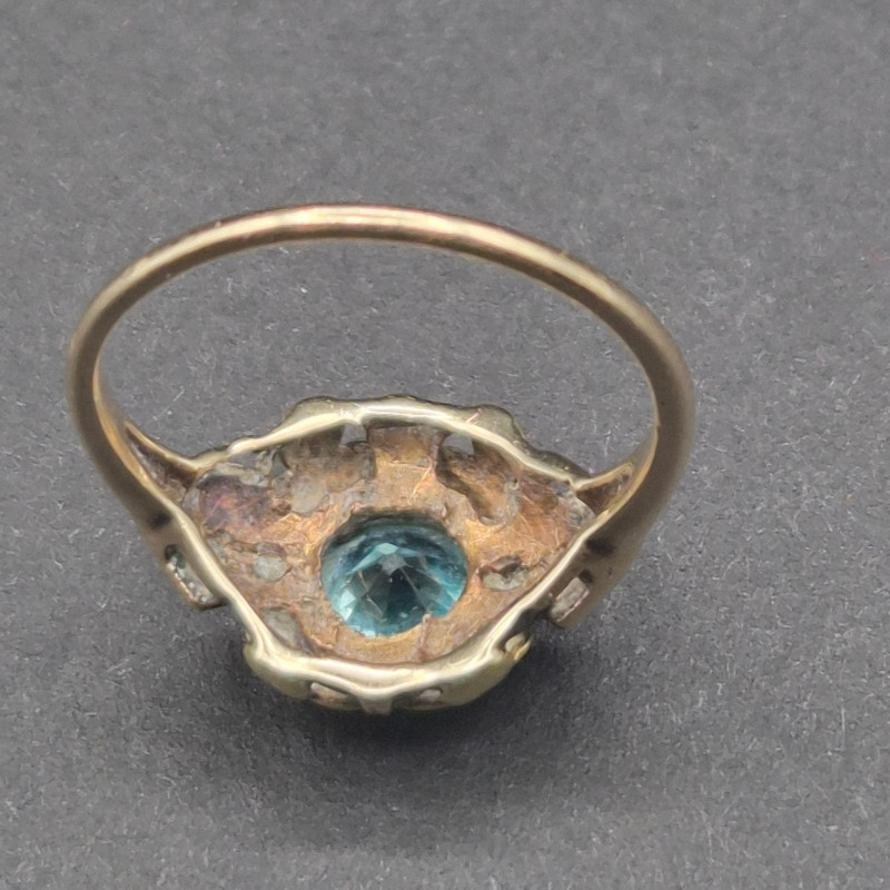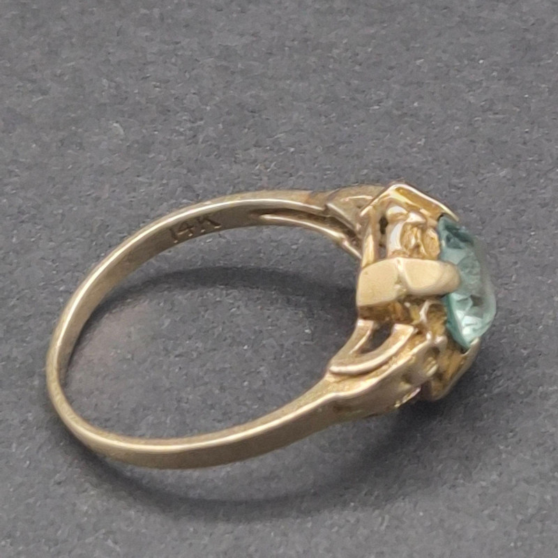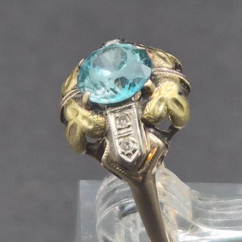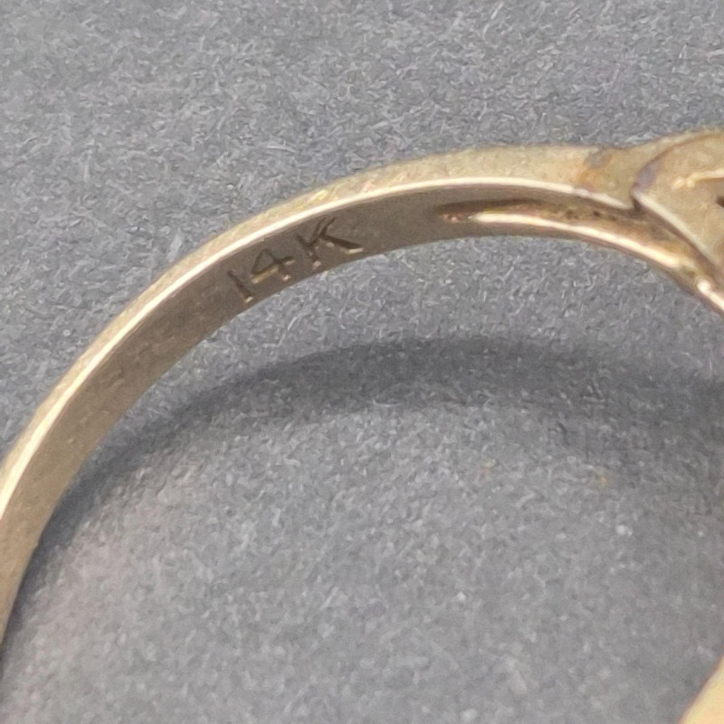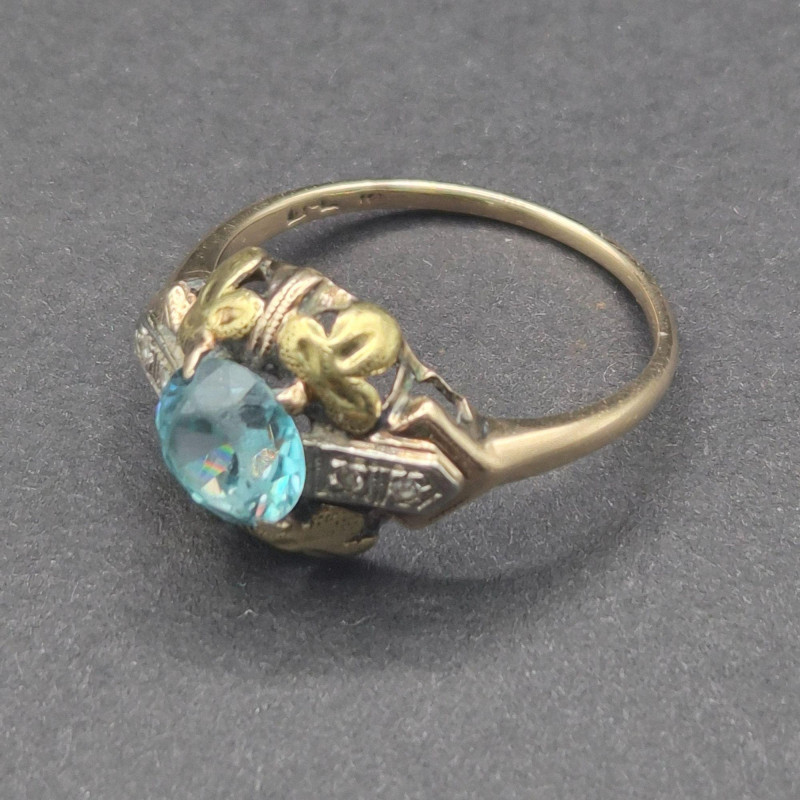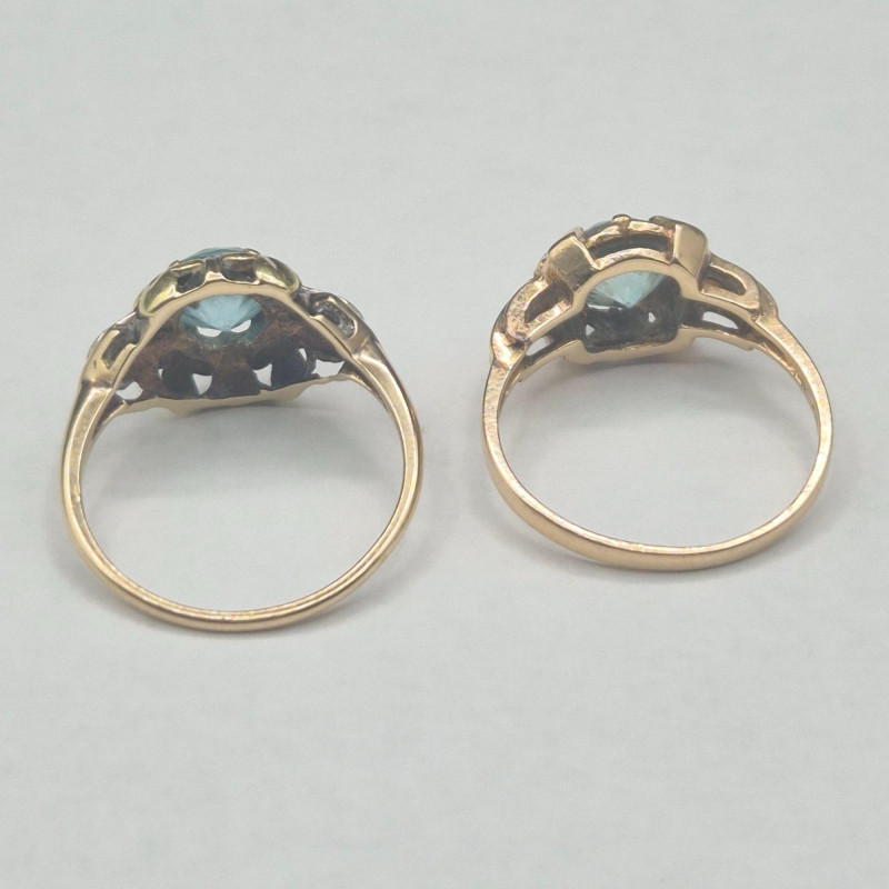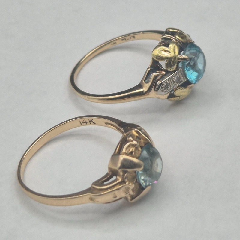 A pair of antique topaz rings that balance soft shimmer with rich depth, each crafted in warm gold and sized perfectly for a pinky or small finger. The lighter ring features a pale, icy topaz set in solid 14k gold, its hallmark crisp and clear. The companion ring holds a deeper-toned topaz accented by two bright side stones on either side, likely diamonds, in 10k gold with a partially legible stamp showing letters and a “10. Both measure size 5, ideal for a pinky or small finger. Total combined weight is 5.1 grams.