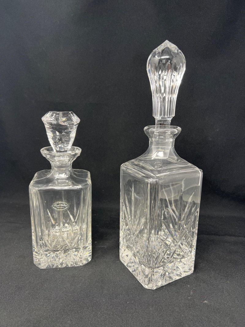 A graceful pairing of clear crystal carafes, each offering its own sculptural presence and light-catching detail.