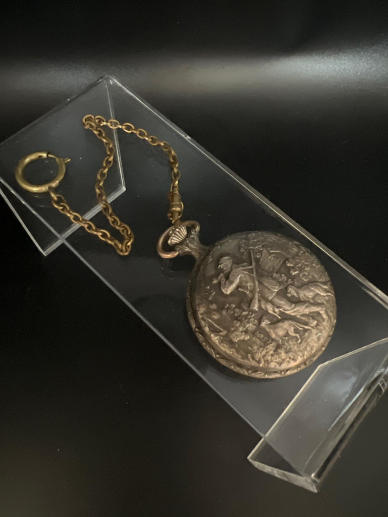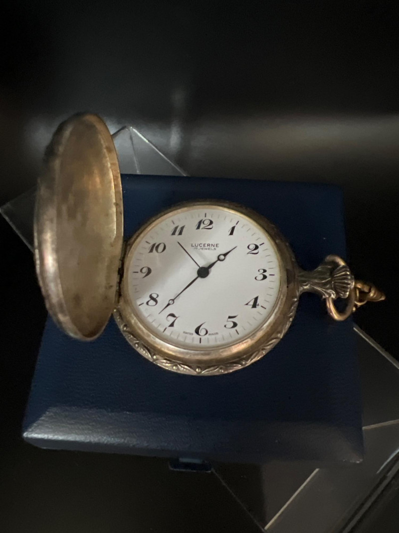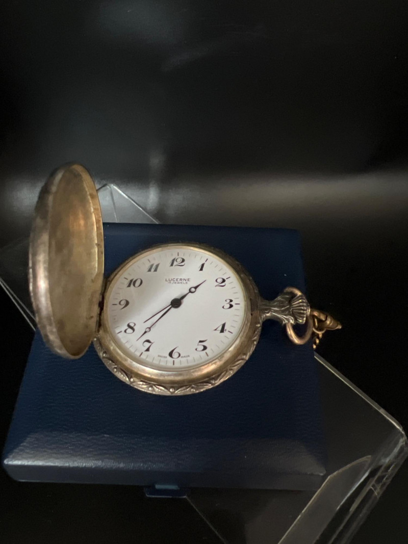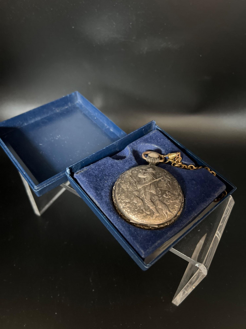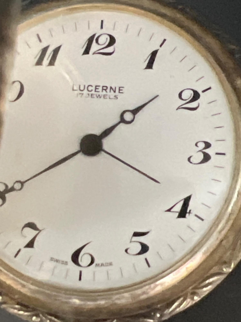 Vintage Lucerne 17‑jewel Swiss pocket watch featuring a classic white dial with black Arabic numerals and traditional black hands. Marked Lucerne and Swiss Made. Paired with a matching fob chain. The case front displays an ornate raised hunting‑scene relief depicting a hunter with rifle and dogs in a forested landscape — a desirable decorative style often associated with mid‑century souvenir and presentation pocket watches. The detailing is crisp and visually striking, adding both charm and collectible appeal. Tested and in working condition at time of cataloging. Light, expected vintage wear consistent with age. A handsome mechanical timepiece for collectors of Swiss pocket watches and decorative relief cases.