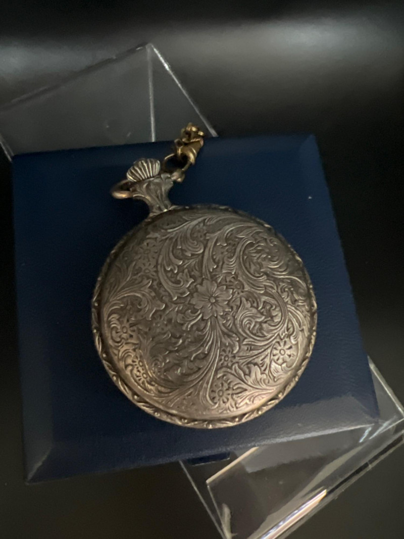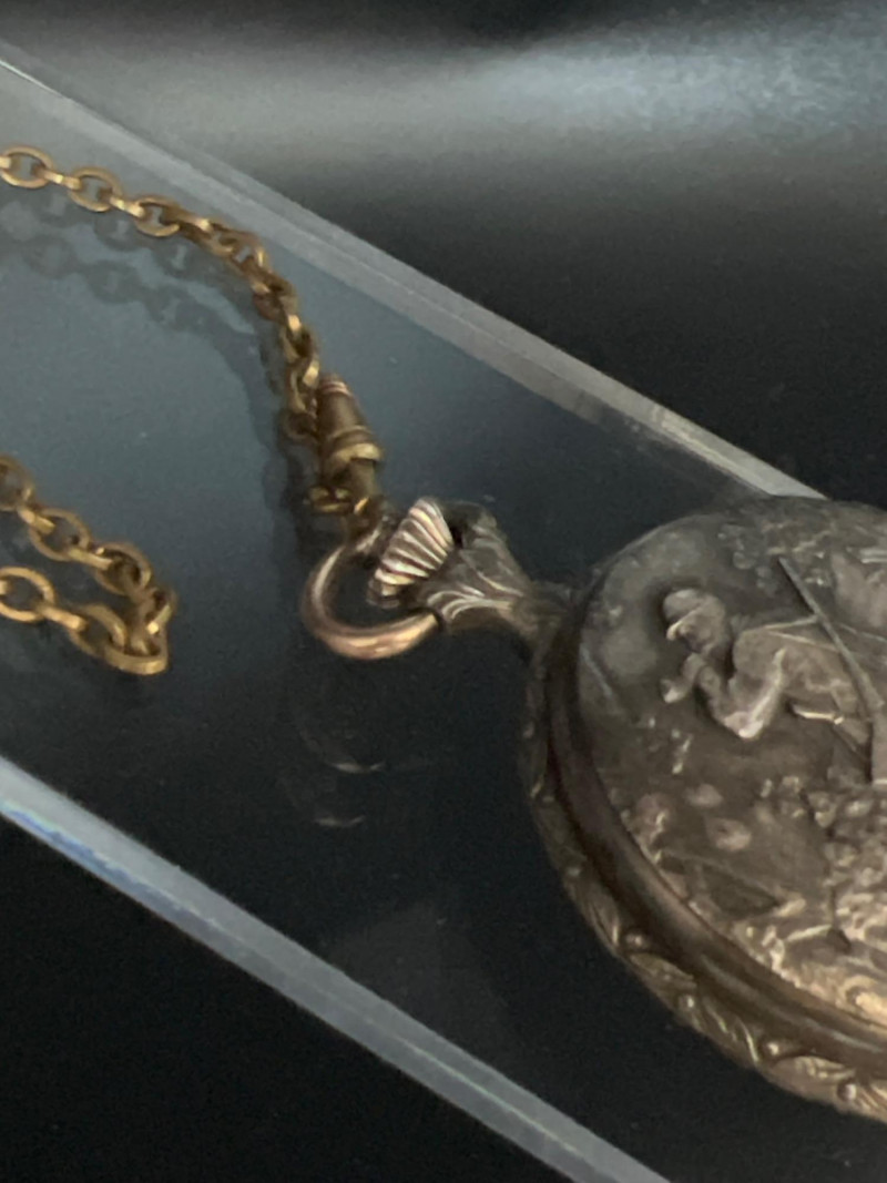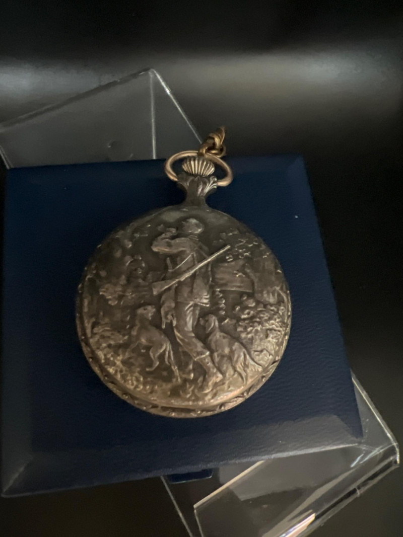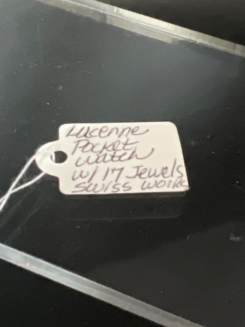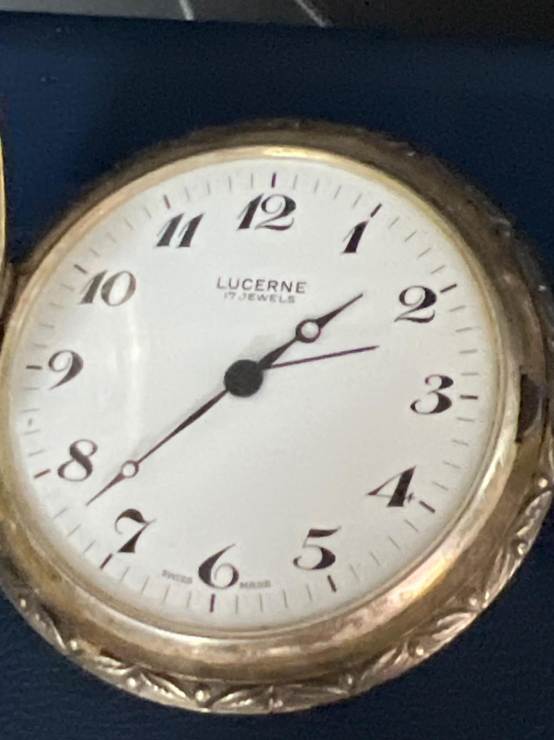 Vintage Lucerne 17‑jewel Swiss pocket watch featuring a classic white dial with black Arabic numerals and traditional black hands. Marked Lucerne and Swiss Made. Paired with a matching fob chain. The case front displays an ornate raised hunting‑scene relief depicting a hunter with rifle and dogs in a forested landscape — a desirable decorative style often associated with mid‑century souvenir and presentation pocket watches. The detailing is crisp and visually striking, adding both charm and collectible appeal. Tested and in working condition at time of cataloging. Light, expected vintage wear consistent with age. A handsome mechanical timepiece for collectors of Swiss pocket watches and decorative relief cases.