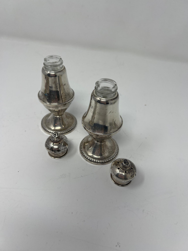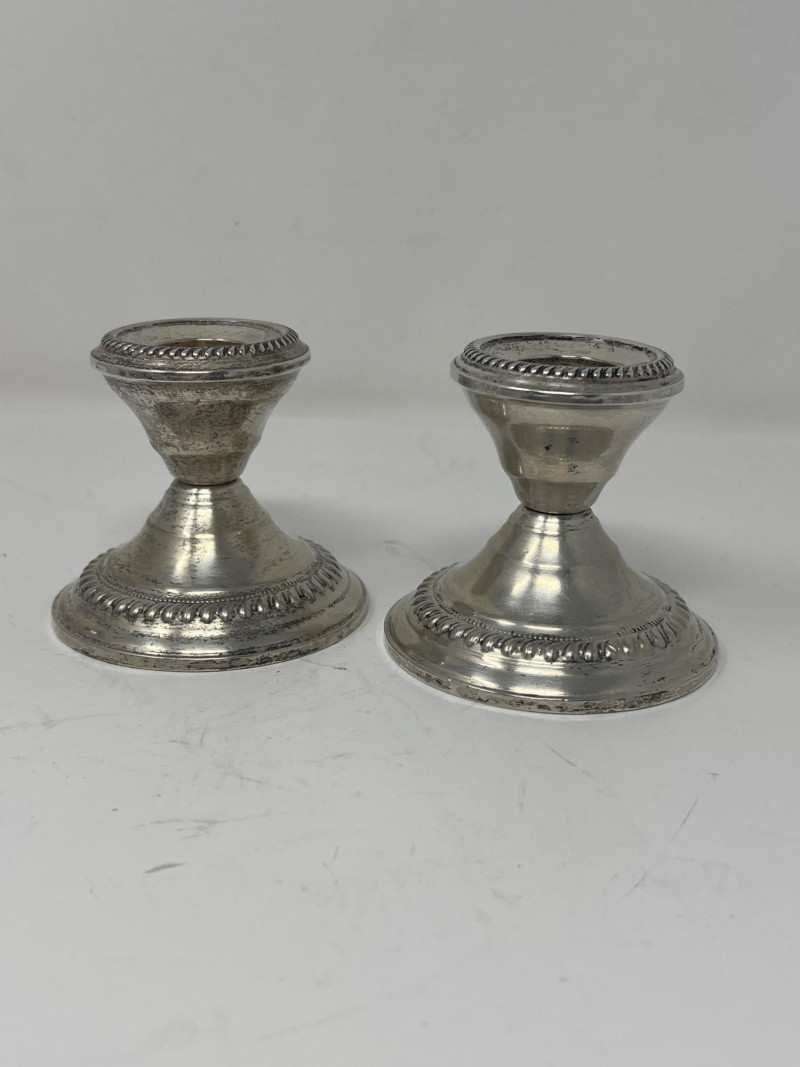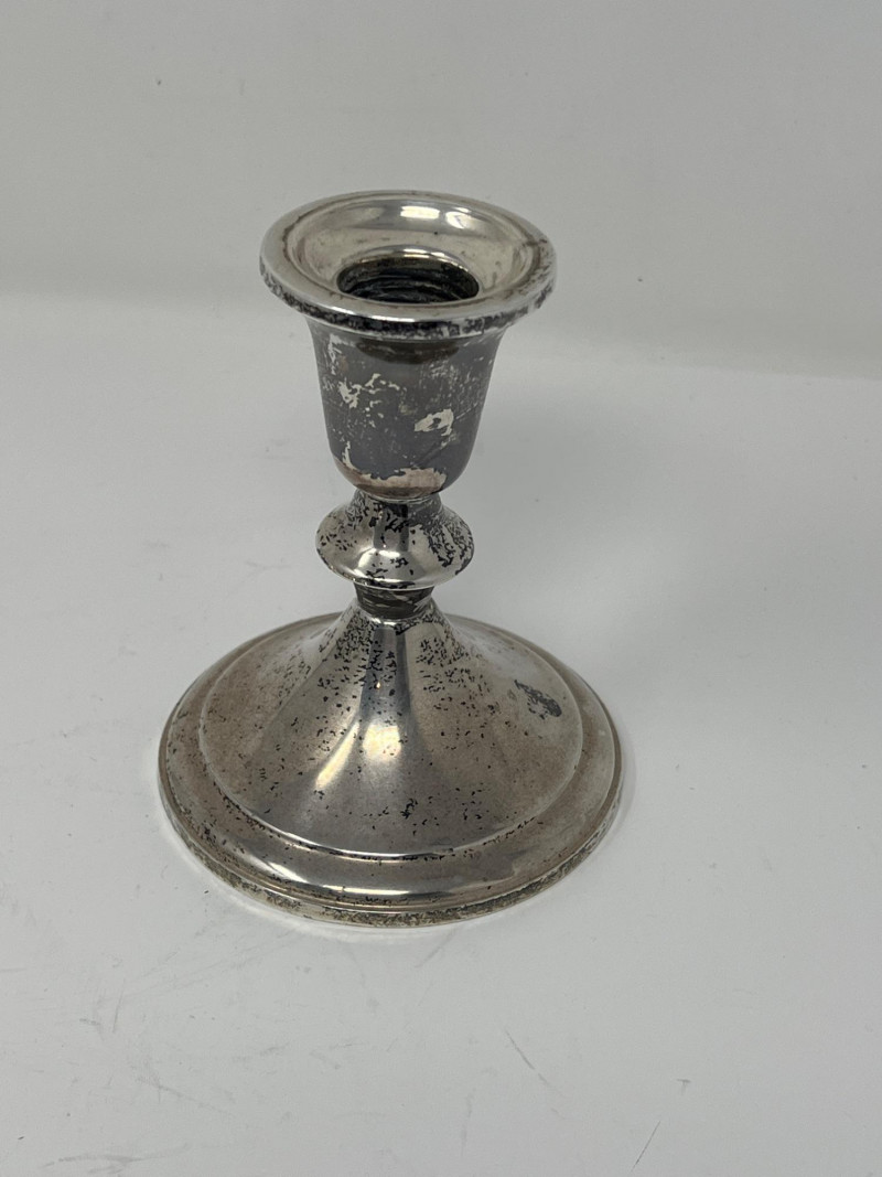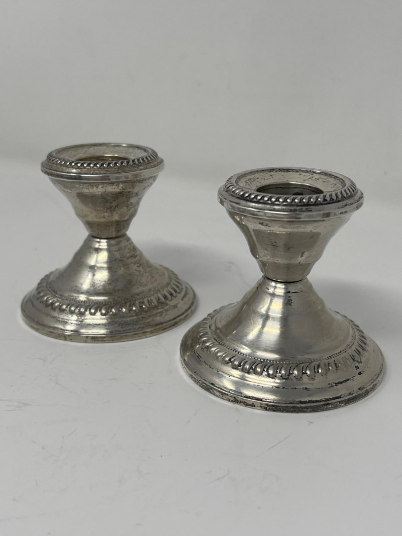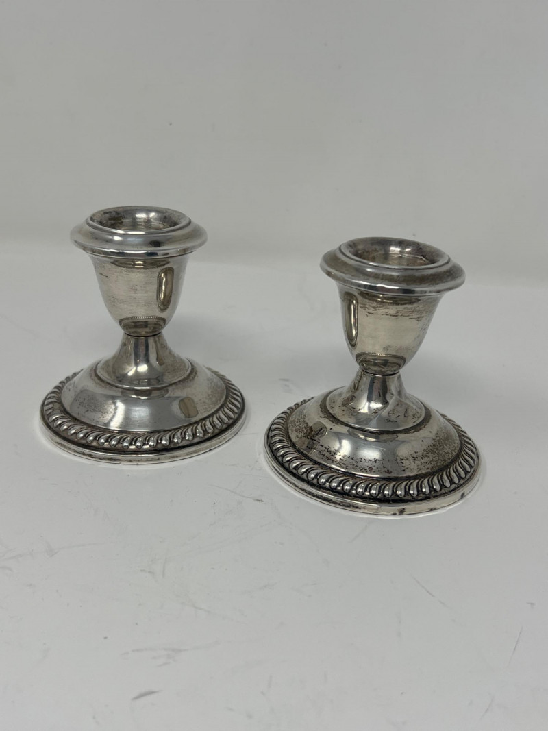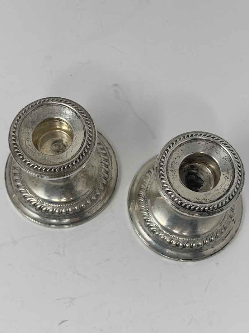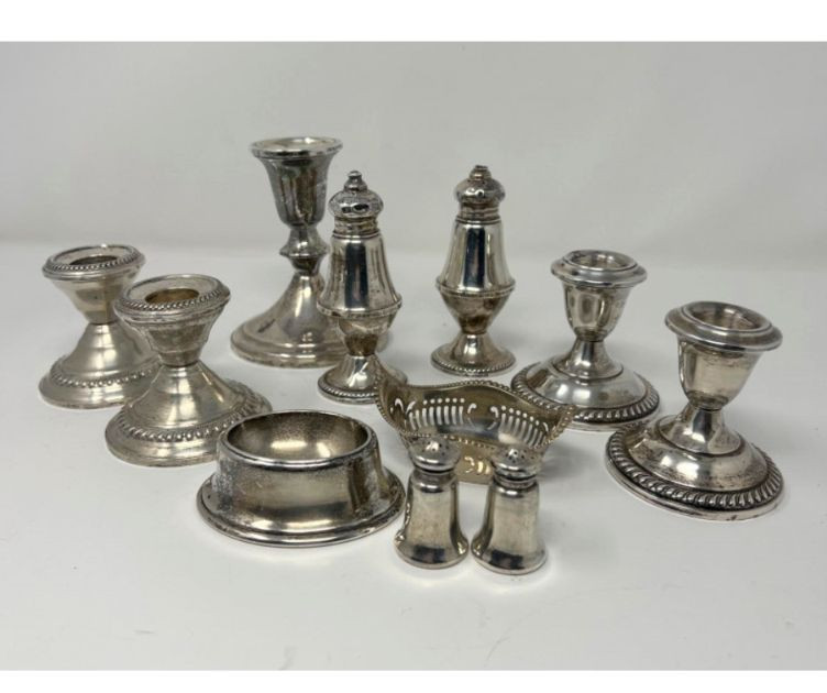 Mixed lot of sterling tableware including an assortment of classic dining and decorative pieces. The grouping features: 2 pairs of candlesticks in varying heights and designs (3.25 inches tall) marked "weighted sterling" 1 single candlestick (4.25 inches tall) marked Towle sterling 1 openwork basket - 3.25 inches length x 1.25 inches height (marked sterling) 1 pair of salt & pepper shakers - 4.25 inches height - marked weighted sterling) 1 pair of small salt & pepper shakers - 1.25 inches height - marked sterling 1 small salt bowl or egg holder? dish - 3.25 inches length x 1.25 inches tall (marked sterling) A versatile collection for display, polishing projects, or repurposing. Some pieces show expected age and patina.