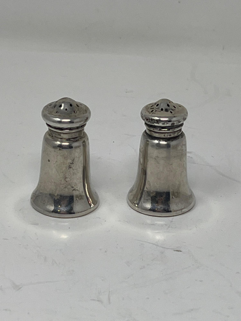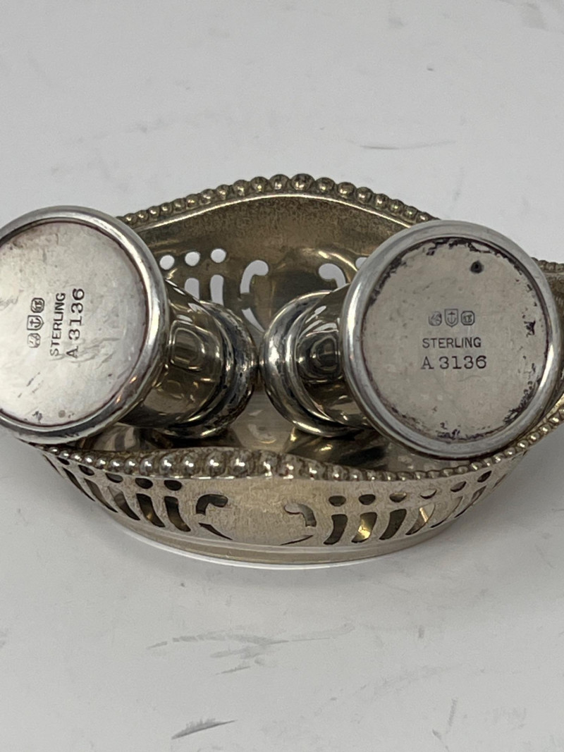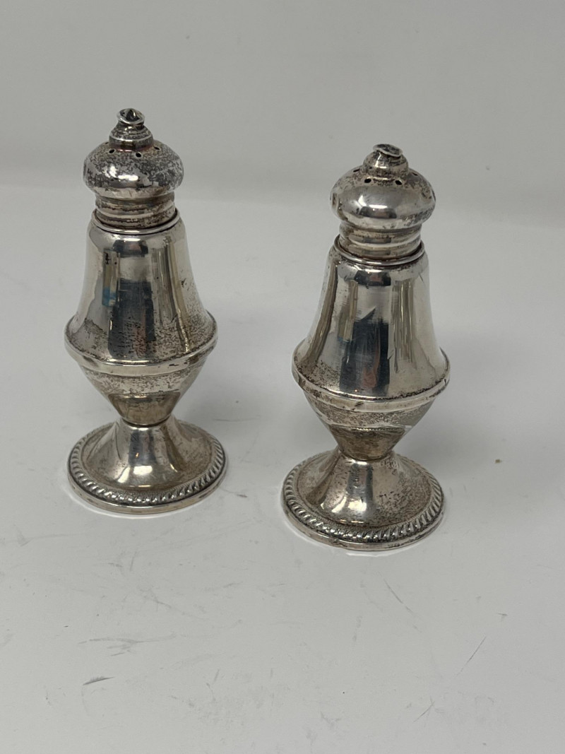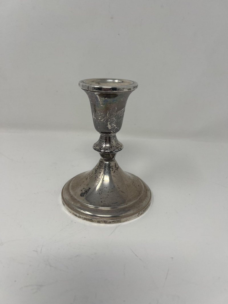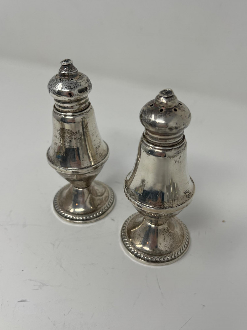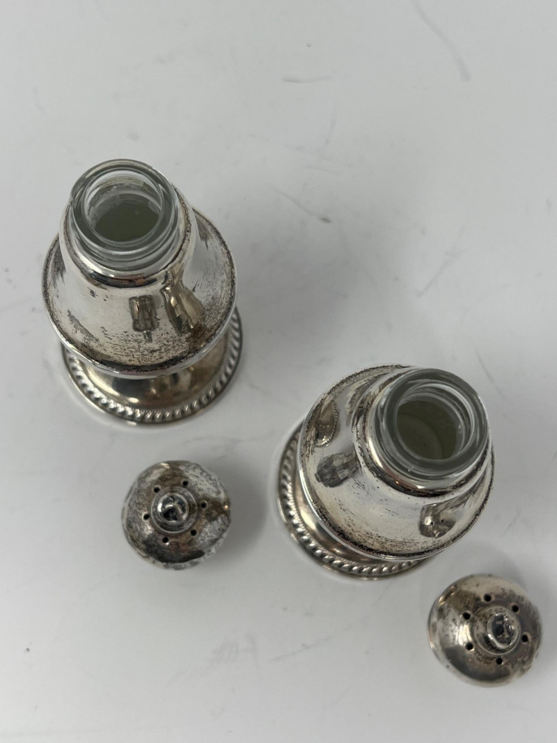 Mixed lot of sterling tableware including an assortment of classic dining and decorative pieces. The grouping features: 2 pairs of candlesticks in varying heights and designs (3.25 inches tall) marked "weighted sterling" 1 single candlestick (4.25 inches tall) marked Towle sterling 1 openwork basket - 3.25 inches length x 1.25 inches height (marked sterling) 1 pair of salt & pepper shakers - 4.25 inches height - marked weighted sterling) 1 pair of small salt & pepper shakers - 1.25 inches height - marked sterling 1 small salt bowl or egg holder? dish - 3.25 inches length x 1.25 inches tall (marked sterling) A versatile collection for display, polishing projects, or repurposing. Some pieces show expected age and patina.