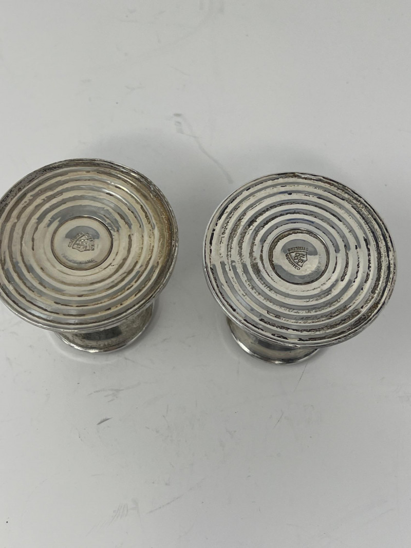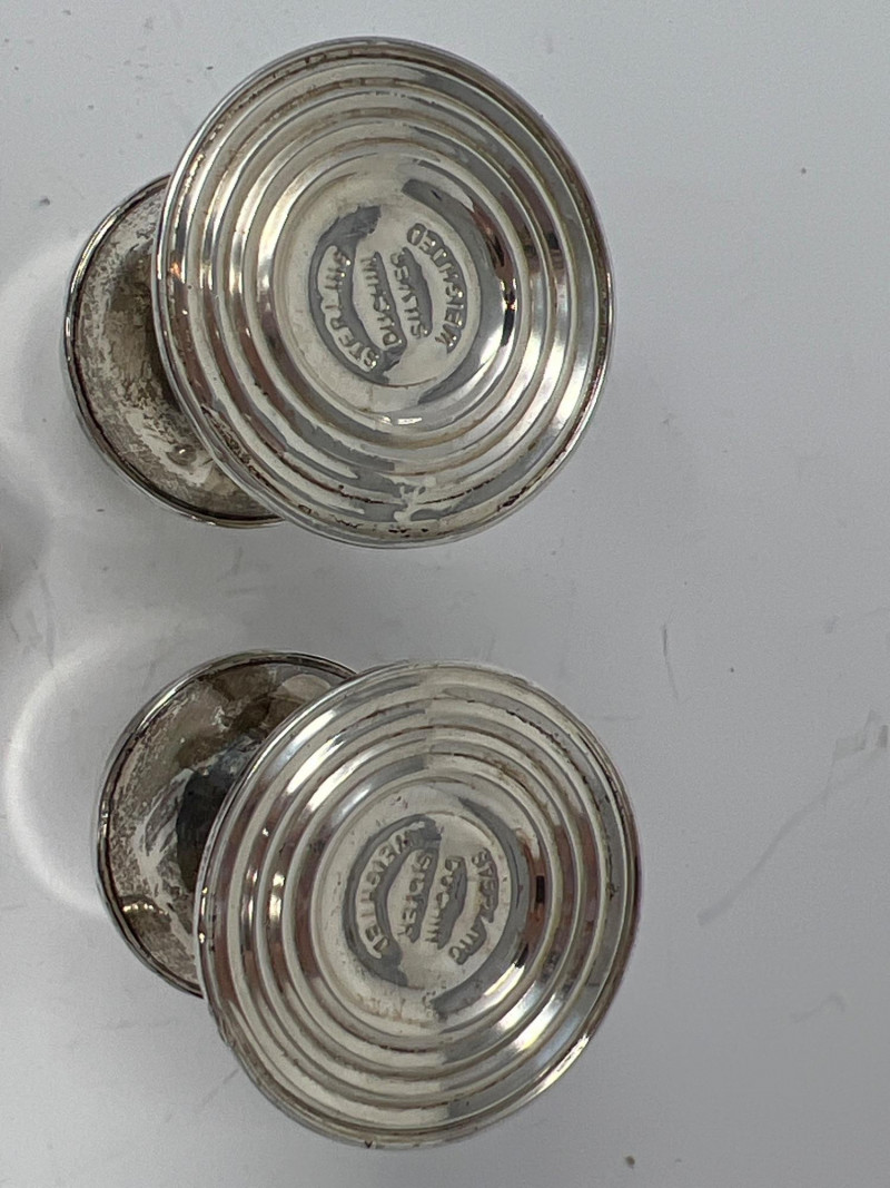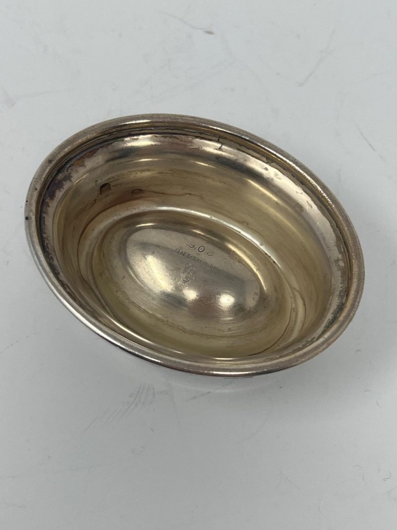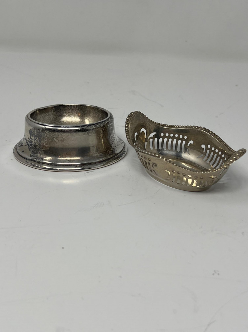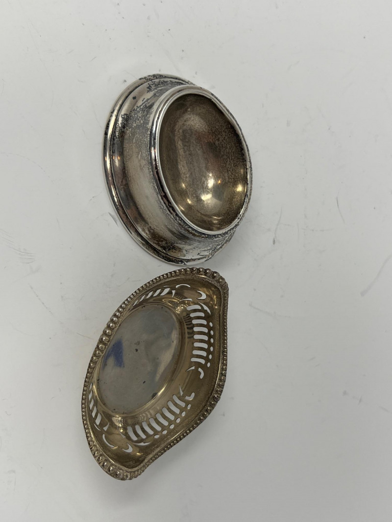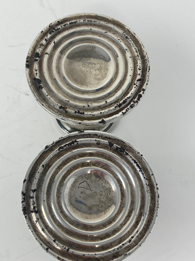 Mixed lot of sterling tableware including an assortment of classic dining and decorative pieces. The grouping features: 2 pairs of candlesticks in varying heights and designs (3.25 inches tall) marked "weighted sterling" 1 single candlestick (4.25 inches tall) marked Towle sterling 1 openwork basket - 3.25 inches length x 1.25 inches height (marked sterling) 1 pair of salt & pepper shakers - 4.25 inches height - marked weighted sterling) 1 pair of small salt & pepper shakers - 1.25 inches height - marked sterling 1 small salt bowl or egg holder? dish - 3.25 inches length x 1.25 inches tall (marked sterling) A versatile collection for display, polishing projects, or repurposing. Some pieces show expected age and patina.