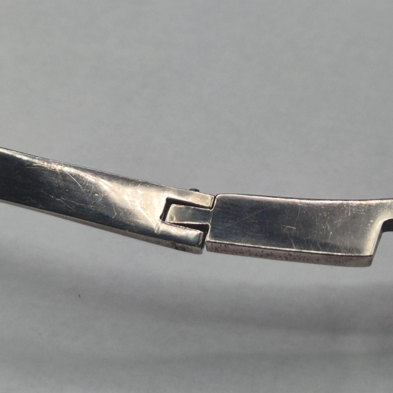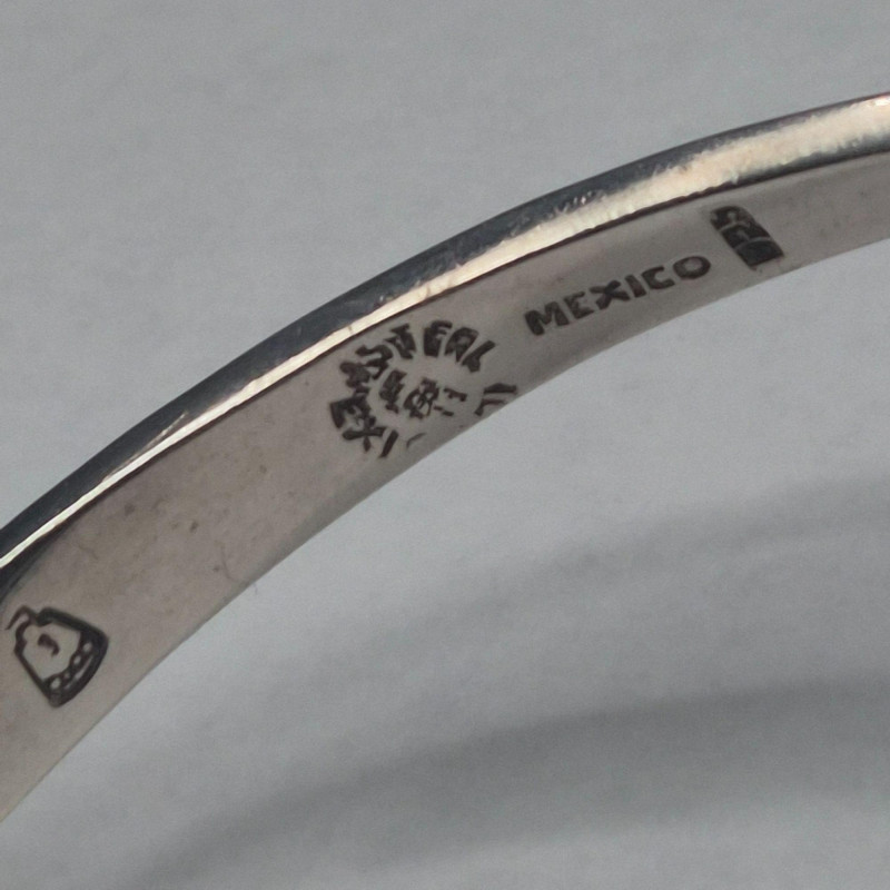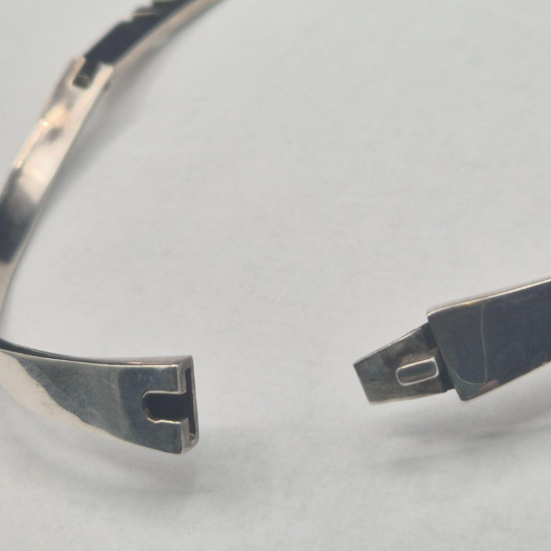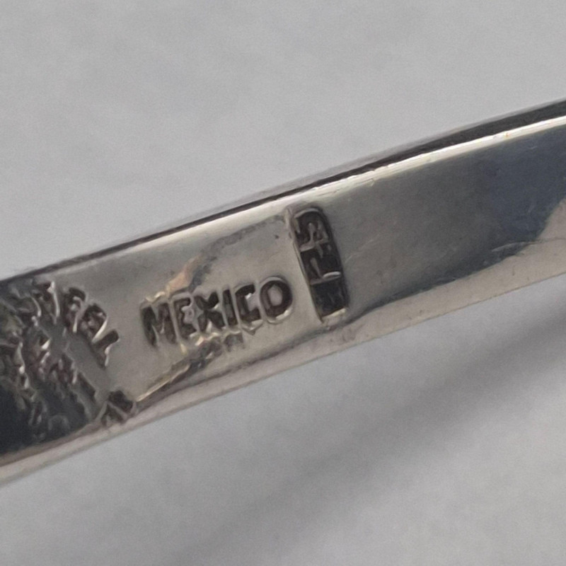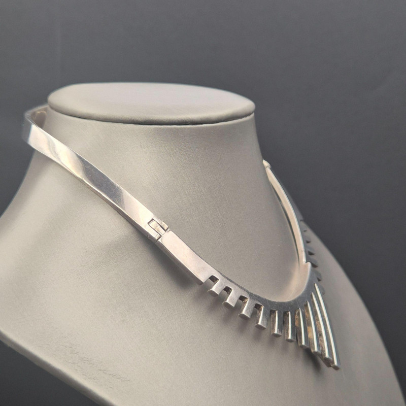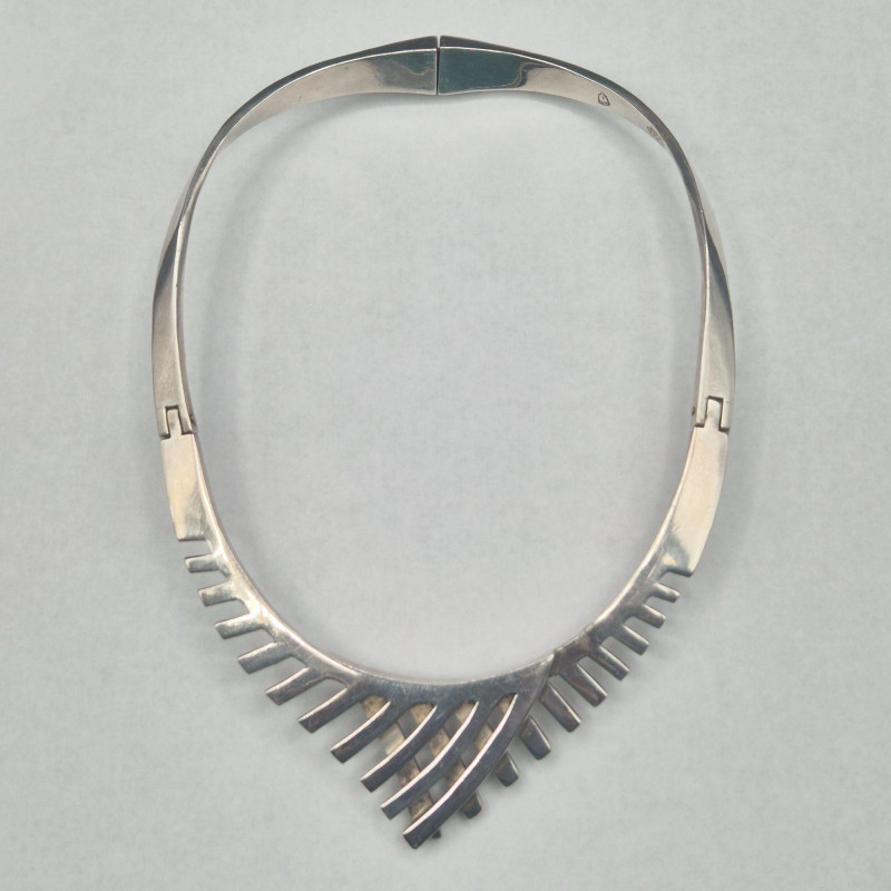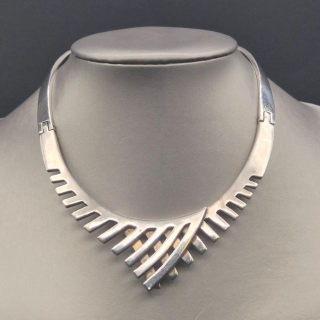 A bold, sculptural statement collar in solid sterling silver, crafted in Mexico with the unmistakable weight and presence of mid‑century modernist design. The piece features a dramatic fishbone‑style construction, giving it both movement and architectural appeal. The lower section is hinged for comfort and contour, allowing it to sit beautifully along the neckline. This is a substantial, eye‑catching collar necklace for collectors who appreciate strong lines and artisan Mexican silverwork. A powerful piece for anyone who loves wearable sculpture, bold silhouettes, or the craftsmanship of Mexico’s silver tradition.